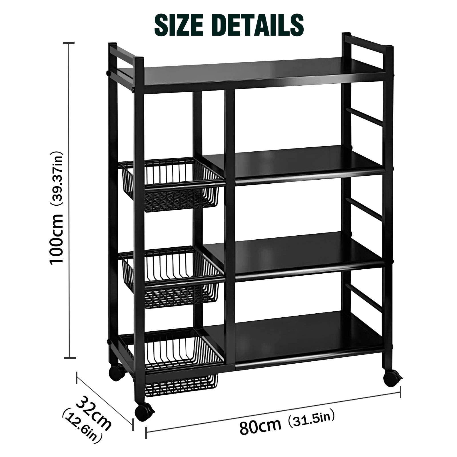 ????Description: This metal rack focuses on flexible layout, effortlessly adapting to various items in the kitchen and laundry room, from large pots and pans to detergent boxes, all stored neatly. The open design allows for easy access to items at a glance. Installation is simple and requires no professional skills, allowing you to enjoy the cleanliness and convenience that organized storage brings. Choose this rack to breathe new life into your living space! ????Package Contents: Left Frame × 1 Right Frame × 1 Top Shelf × 1 Multi-Hole Vertical Rod × 2 Single-Hole Horizontal Rod × 4 Small Shelves × 3 Long Horizontal Rod × 4 Mesh Baskets × 4 Short Horizontal Rod × 6 Long Screws × 32 Threaded Square Plugs × 4 Plastic Square Plugs × 4 Casters × 4 Two Types of Wrenches × 1 ????Specification: Type: storage shelf rack Material: Steel Shape: Rectangular Size: 31.5×12.6×39.37 inches (80×32×100 cm)
