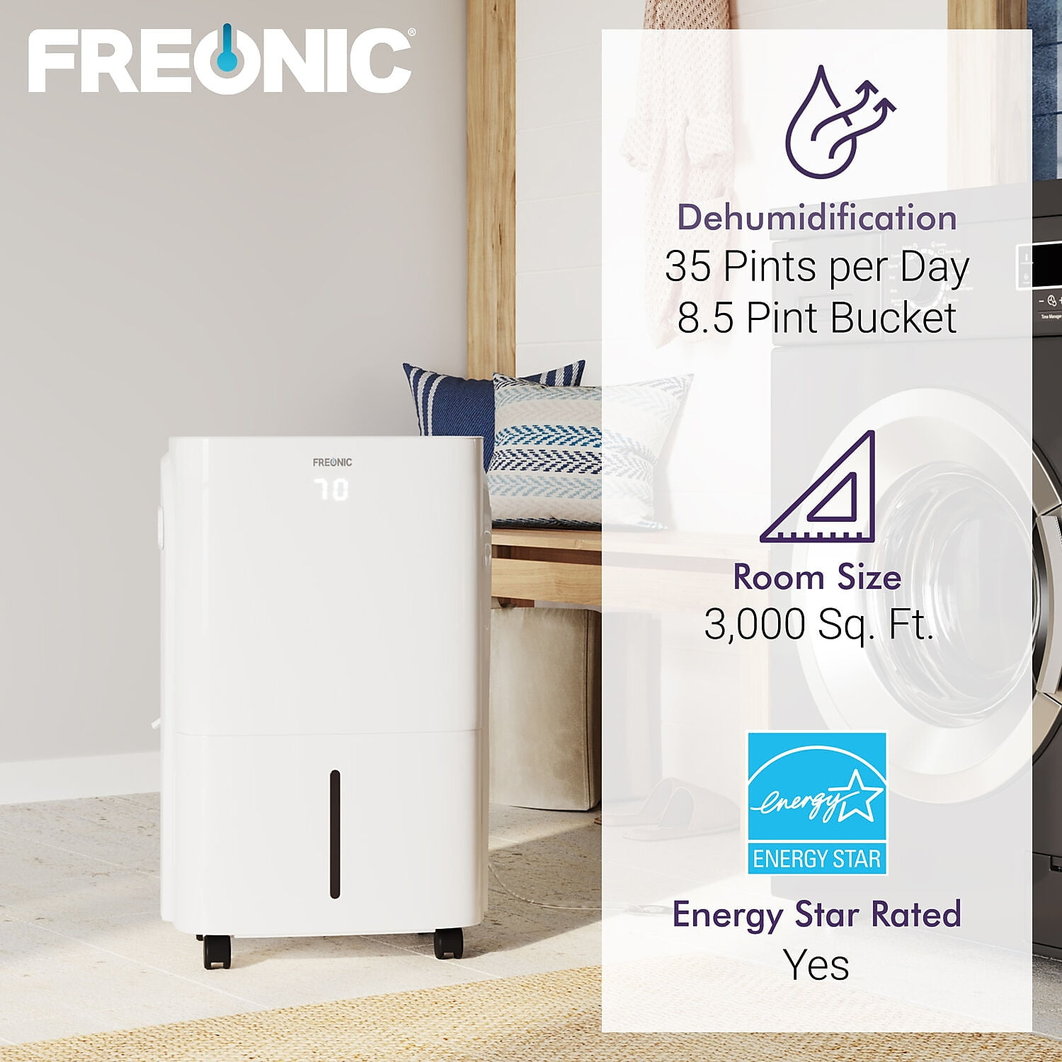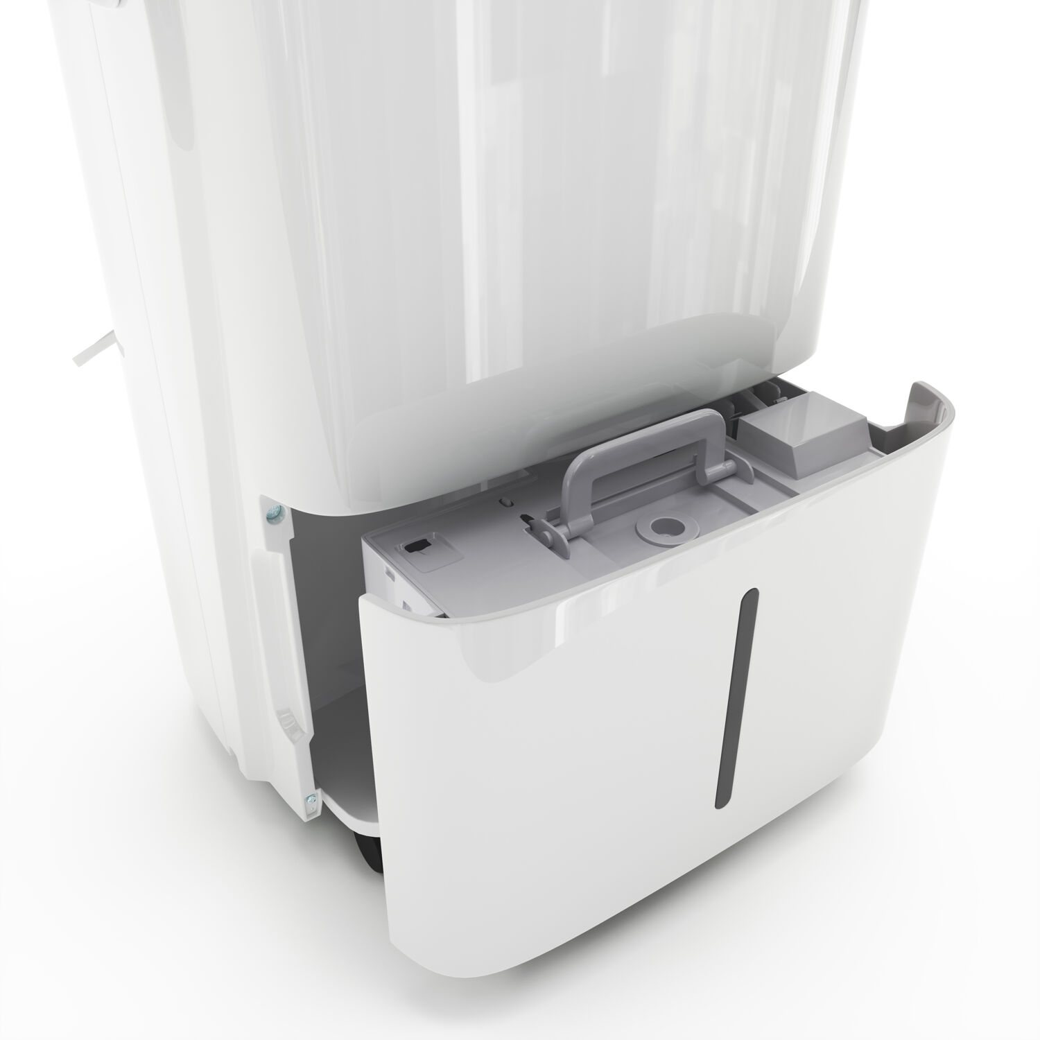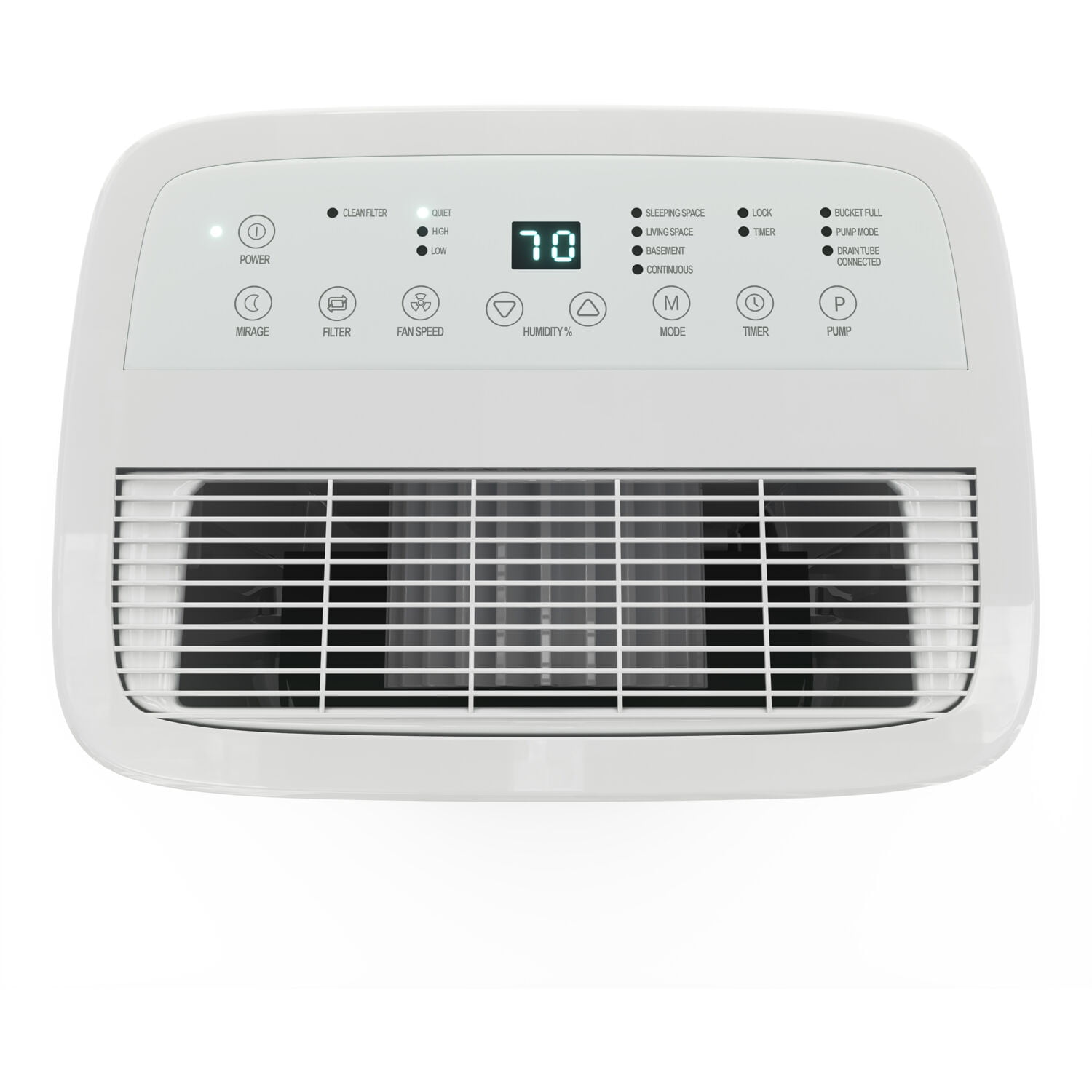 Powerful Dehumidifier: This dehumidifier for home effectively removes up to 35 pints of water per day, drying the air in rooms up to 3000 square feet quickly and efficiently; Remove moisture from your basement, garage, and any other extra large room Humidity Control with Mirage Display: Shine-through plastic mirage display lets you see the humidity from anywhere in the room while on-board controls allow you to change the settings with one touch Reliable Moisture Removal: With 3 fan speeds and 4 operating modes (basement, living space, sleeping space, and continuous), this 35 pints dehumidifier can maintain the comfort level you desire Washable Filter: An alert will sound when it’s time to wash the reusable mesh filter that collects dust and other particles from the air while keeping the internal components clean and clear Easy Access Bucket: The pull-out bucket features an integrated carry handle and splash guards ensure emptying the bucket is easy and keeps you and your environment dry