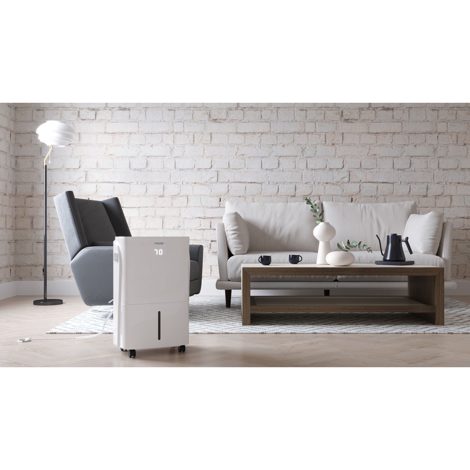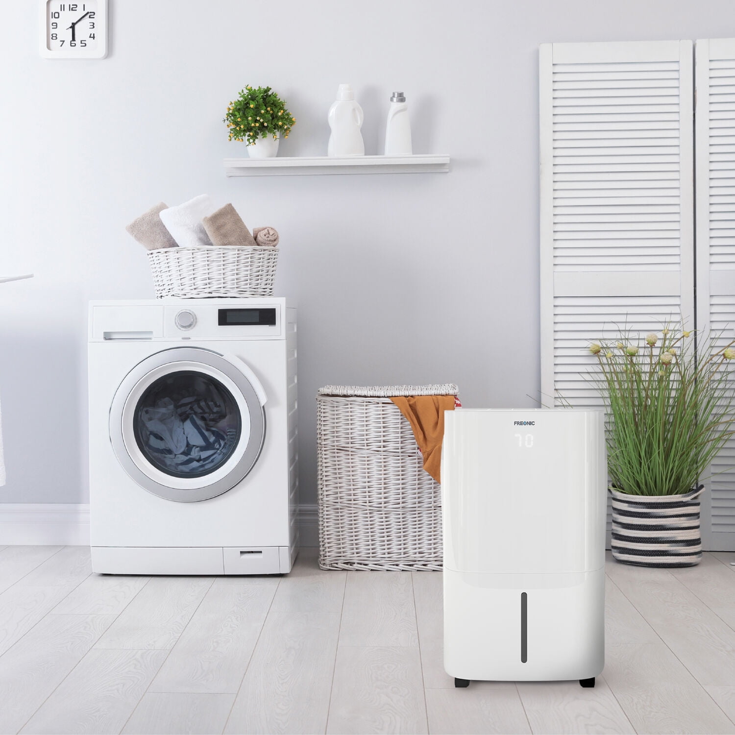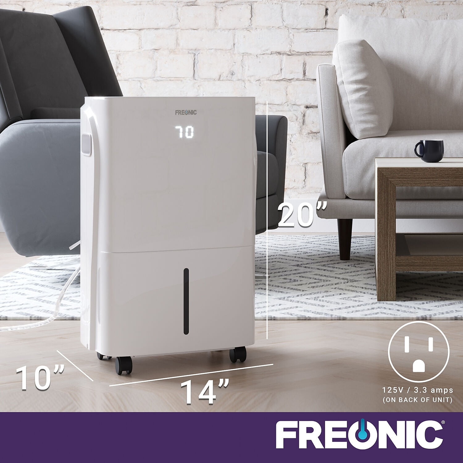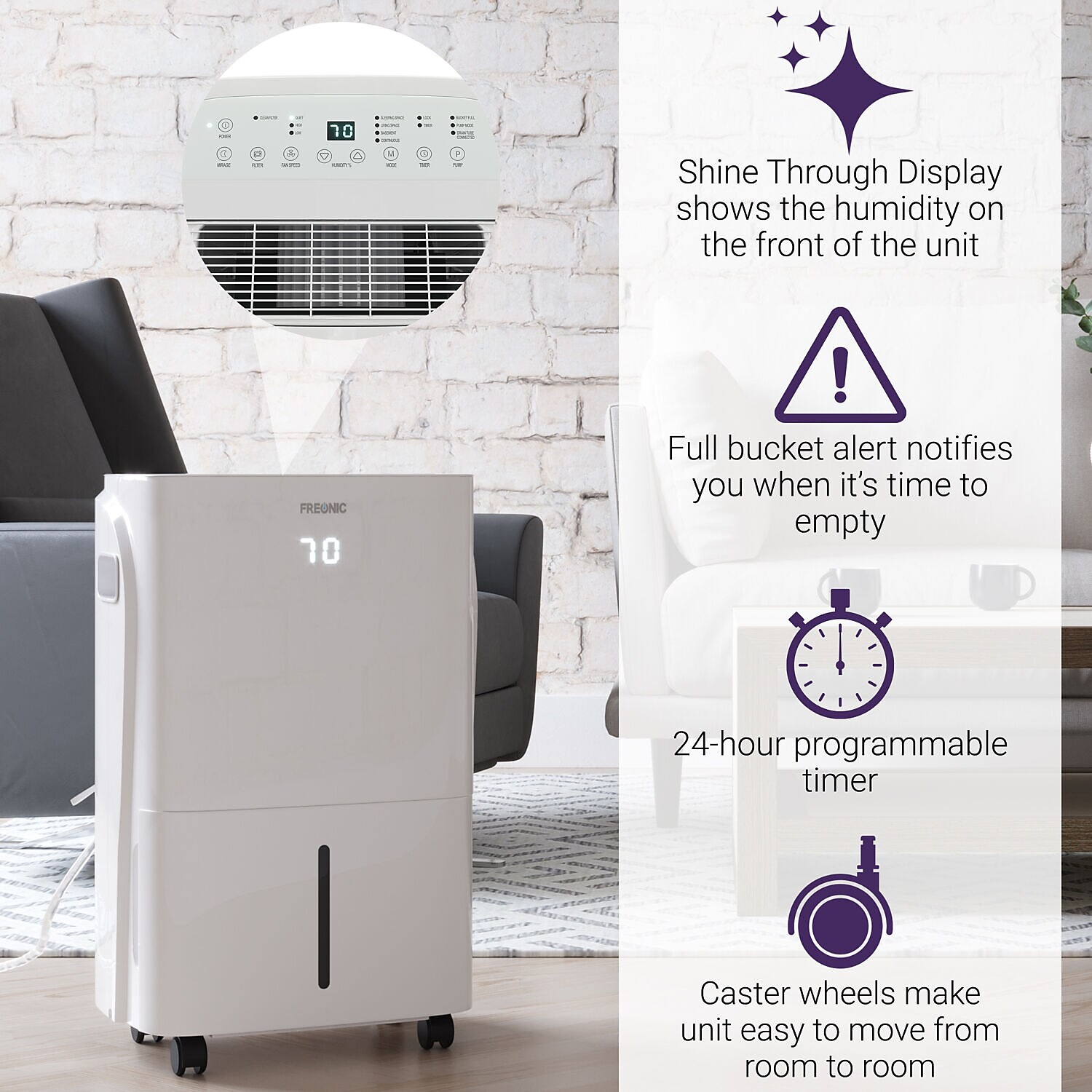 Powerful Dehumidifier: This dehumidifier for home effectively removes up to 35 pints of water per day, drying the air in rooms up to 3000 square feet quickly and efficiently; Remove moisture from your basement, garage, and any other extra large room Humidity Control with Mirage Display: Shine-through plastic mirage display lets you see the humidity from anywhere in the room while on-board controls allow you to change the settings with one touch Reliable Moisture Removal: With 3 fan speeds and 4 operating modes (basement, living space, sleeping space, and continuous), this 35 pints dehumidifier can maintain the comfort level you desire Washable Filter: An alert will sound when it’s time to wash the reusable mesh filter that collects dust and other particles from the air while keeping the internal components clean and clear Easy Access Bucket: The pull-out bucket features an integrated carry handle and splash guards ensure emptying the bucket is easy and keeps you and your environment dry
