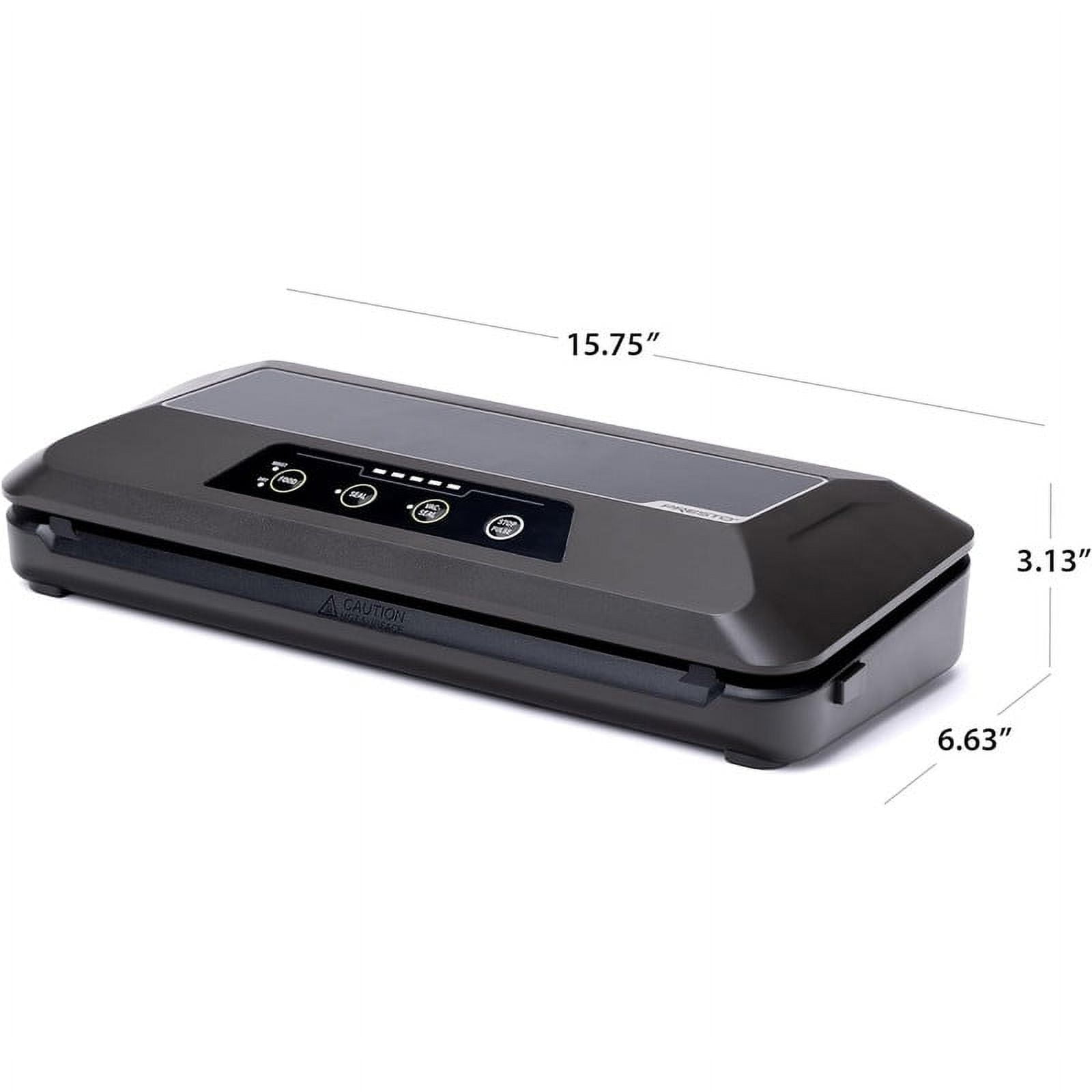 Buy in bulk and keep food fresh for up to 5x longer than ordinary methods with the Presto Fresh Daddy Automatic Electric Vacuum Sealer. With a bag roll storage bay and built-in bag cutter, this vacuum sealer is the ideal choice for food storage in the freezer, refrigerator, and pantry. Select settings for moist or dry food, seal only, and vacuum seal. The stop/pulse function offers manual control for soft, delicate foods. The starter bag set includes one 11” x 20’ roll for making bags and one gallon-size reusable zipper bag with port, as well as a vacuum tube accessory for use with zipper bags with ports. Cut custom-length bags in seconds, then vacuum seal portioned packs of vegetables, fish, and meat to streamline your meal planning. Preserve in-season fruit to enjoy healthy smoothies all year. An airtight vacuum seal prevents freezer burn and reduces waste. This Presto vacuum sealer is a great companion when preparing food for sous vide. Food sealed in vacuum bags assures perfect sous vide meals every time. Also safeguards non-food items from moisture or corrosion. Works with Fresh Daddy and most other brands of rolls and bags.