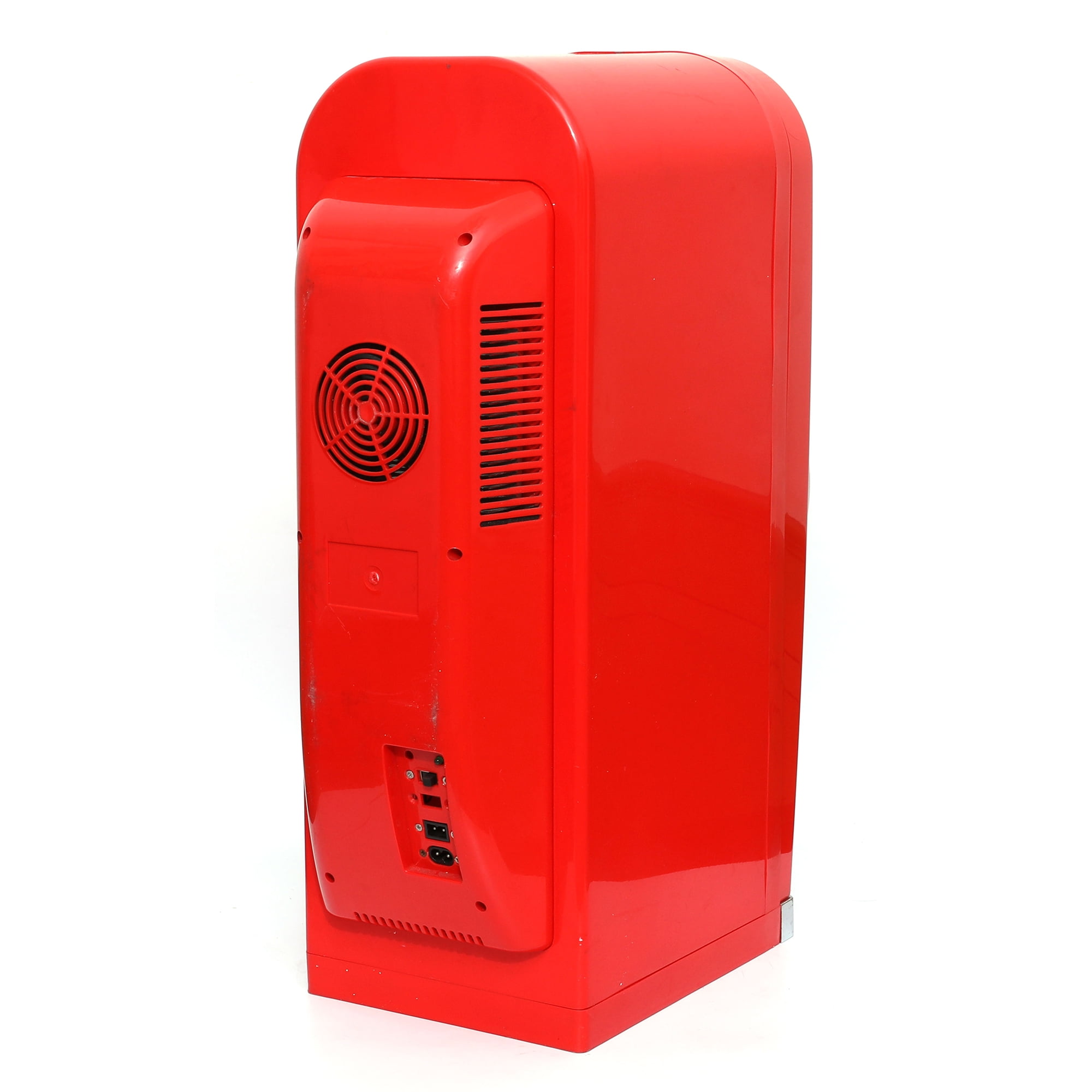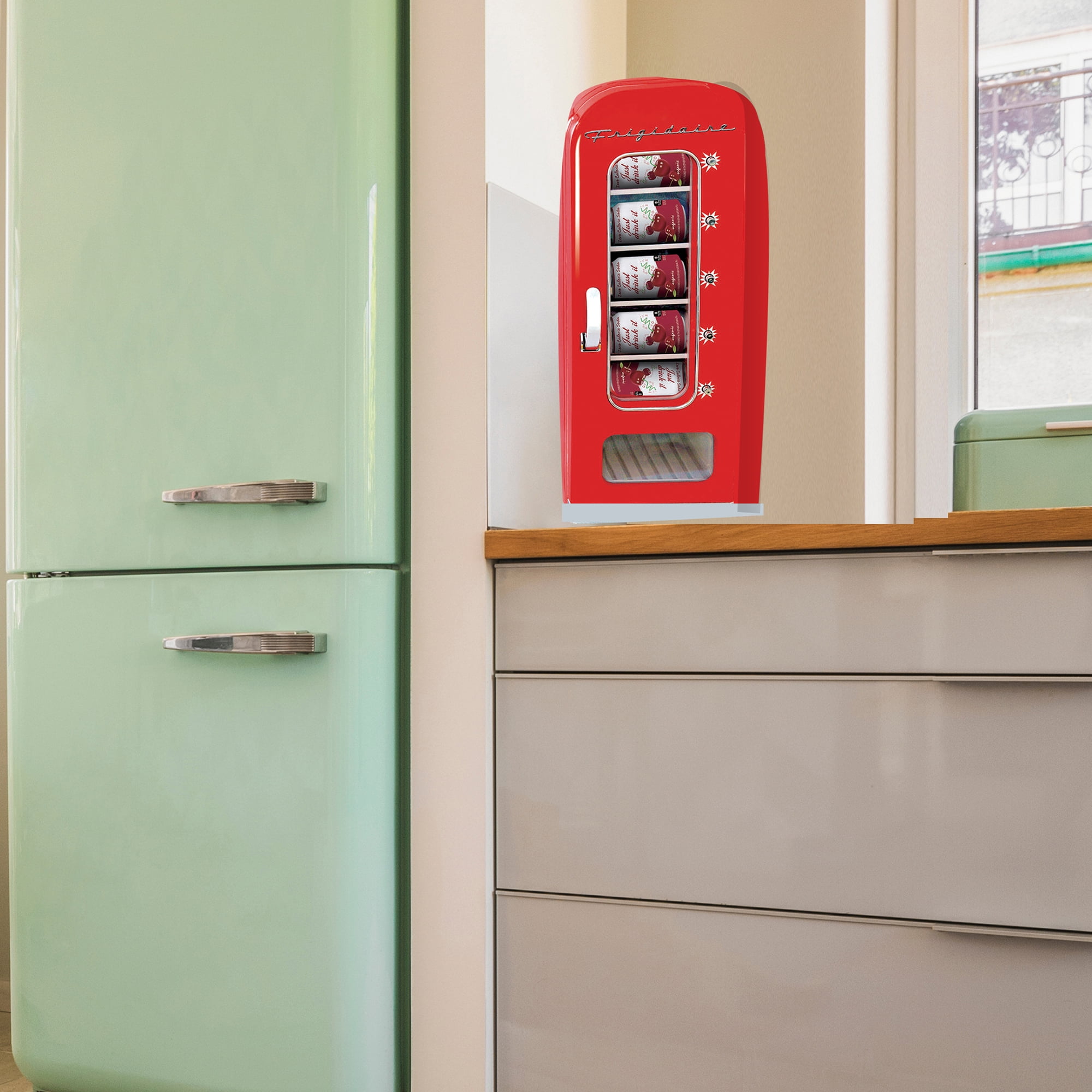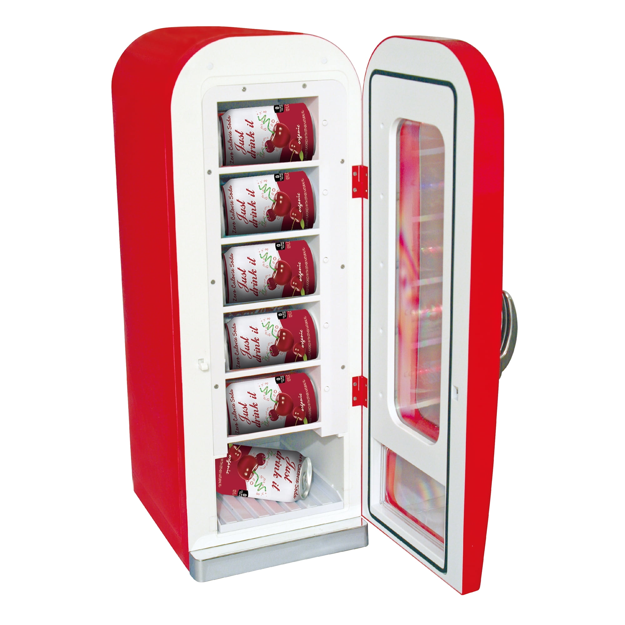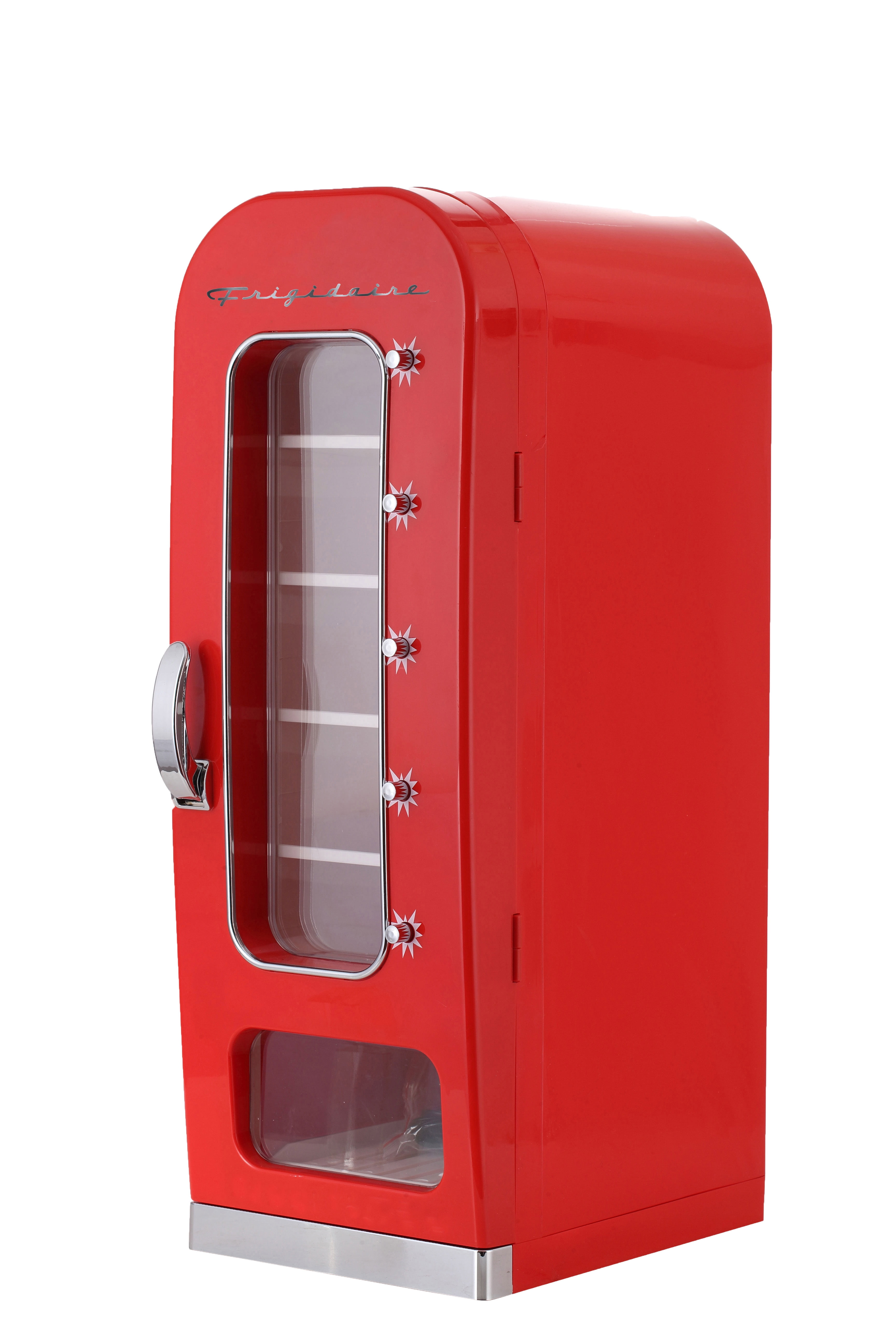 Frigidaire 0.6 cu. ft. Can Dispenser & Beverage Cooler (EFMIS045) – Red, New, 20 inch Width Push button “vending ” – Delight your guests by dispensing cans of cold pop with the push of a button Door Swing Orientation: Right 12v DC and 110v AC power cords included Plugs into any vehicle 12-volt plug or household outlet Classic, nostalgic retro graphics and design Tall window display Single temperature-controlled zone Keeps your drinks at the ideal temperature. Thermoelectric cooling, no compressors 5 shelves offer stylish storage for your wine collection. Our mini beverage fridge is engineered to chill beverages 26-28°F below the ambient temperature. However, the extent of cooling achieved may vary based on the surrounding environment. Freestanding design allows flexible placement. 0.6 cu. ft. storage capacity provides plenty of space to keep your wine. Retro-designed beverage cooler holds up to 10 (355ml/12oz.) cans Color: Red Electronic controls let you adjust the internal temperature.