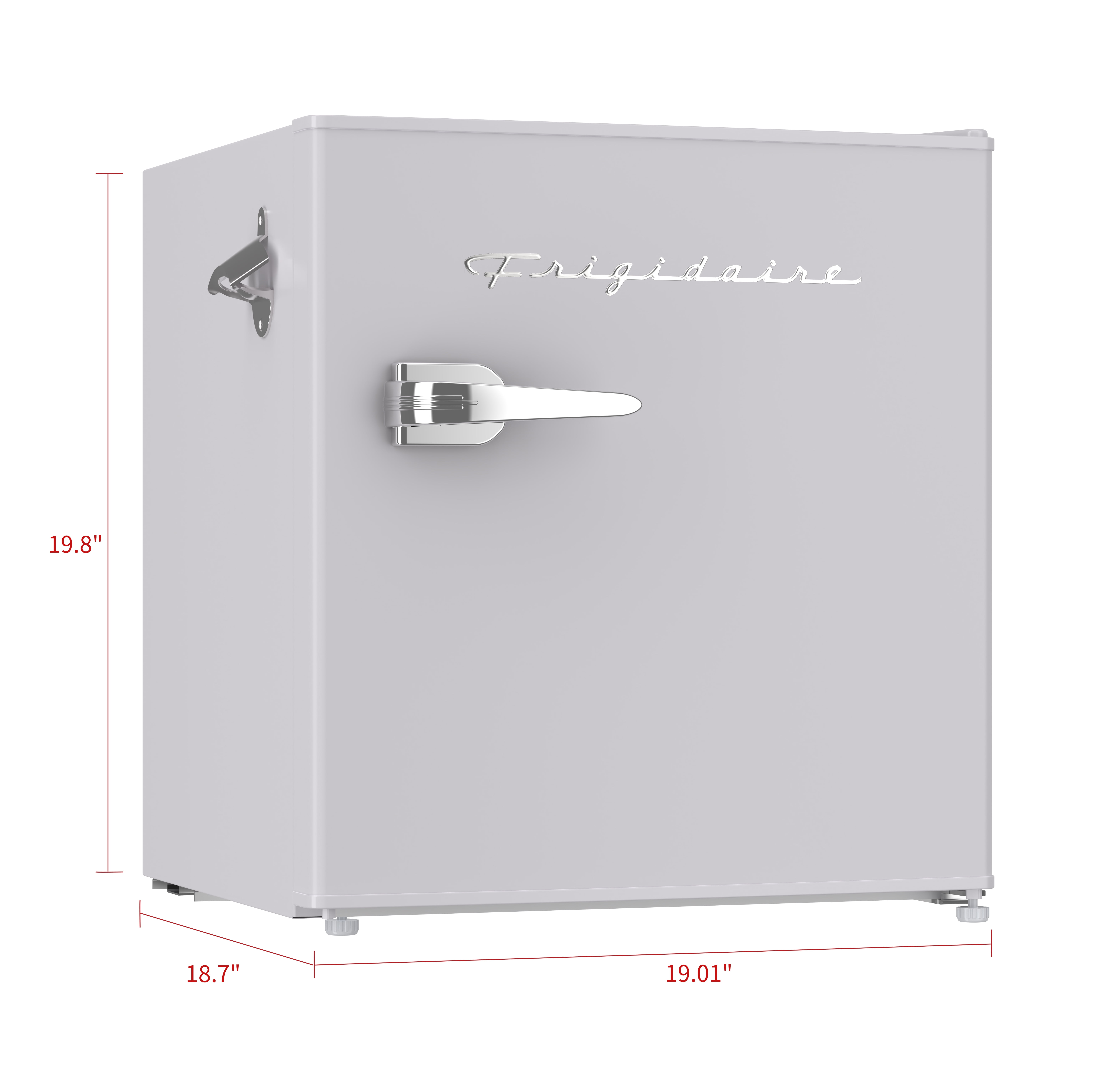 1.6 Cu Ft Retro Bar Fridge With Side Bottle Opener Ice cube tray included allows you to make ice anytime Adjustable wire shelf lets you customize your refrigerator to meet your food storage needs 2 door compartment shelves allows for easy storage of single cans and well as a 2 liter bottle 1.35 cu. ft. fresh food compartment and .25 cu. ft. freezer compartment allows for additional storage of fresh food and frozen goods Compact size allows for placement of this refrigerator virtually anywhere there is an electrical outlet Reversible door allows for many additional placement options Stainless steel look pull handle adds to the retro look Stainless steel look decorative embellishments give this refrigerator that cool sophisticated look