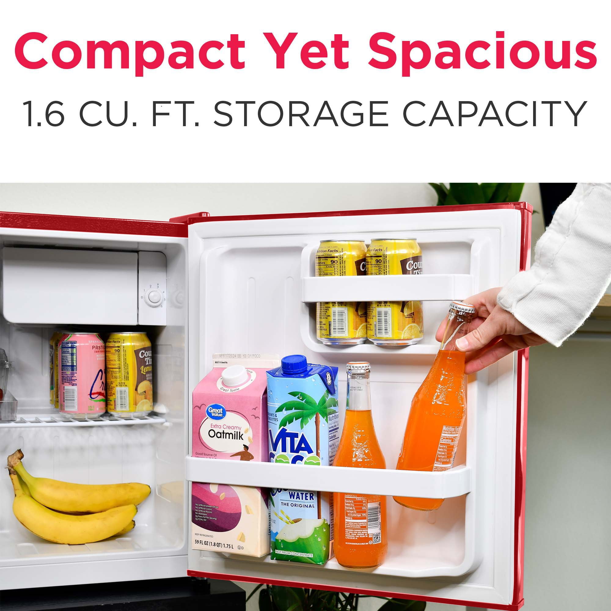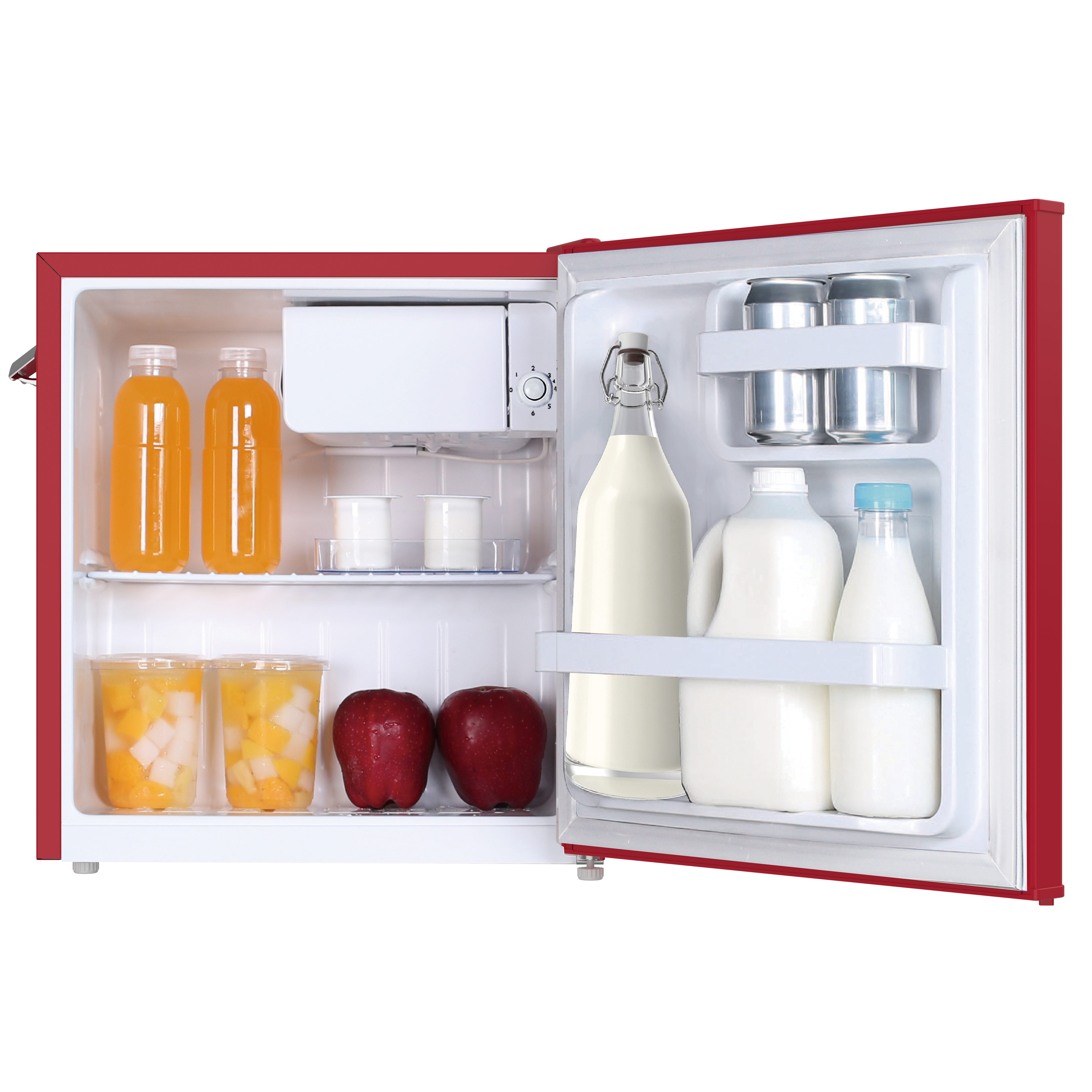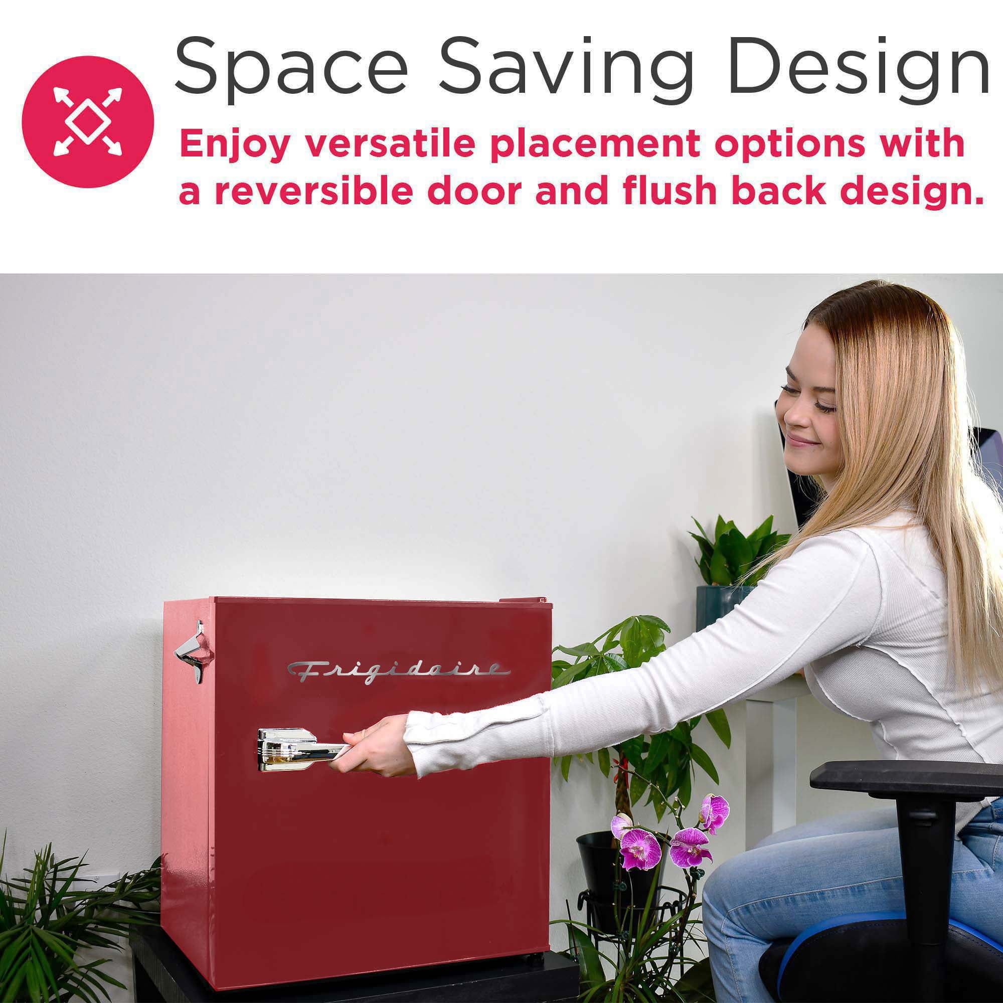 1.6 Cu Ft Retro Bar Fridge With Side Bottle Opener Product Dimensions: 23″ x 23″ x 21″ Adjustable wire shelf lets you customize your refrigerator to meet your food storage needs 2 door compartment shelves allows for easy storage of single cans and well as a 2 liter bottle 1.35 cu. ft. fresh food compartment and .25 cu. ft. freezer compartment allows for additional storage of fresh food and frozen goods Compact size allows for placement of this refrigerator virtually anywhere there is an electrical outlet Reversible door allows for many additional placement options Stainless steel look pull handle adds to the retro look Stainless steel look decorative embellishments give this refrigerator that cool sophisticated look Color: Red