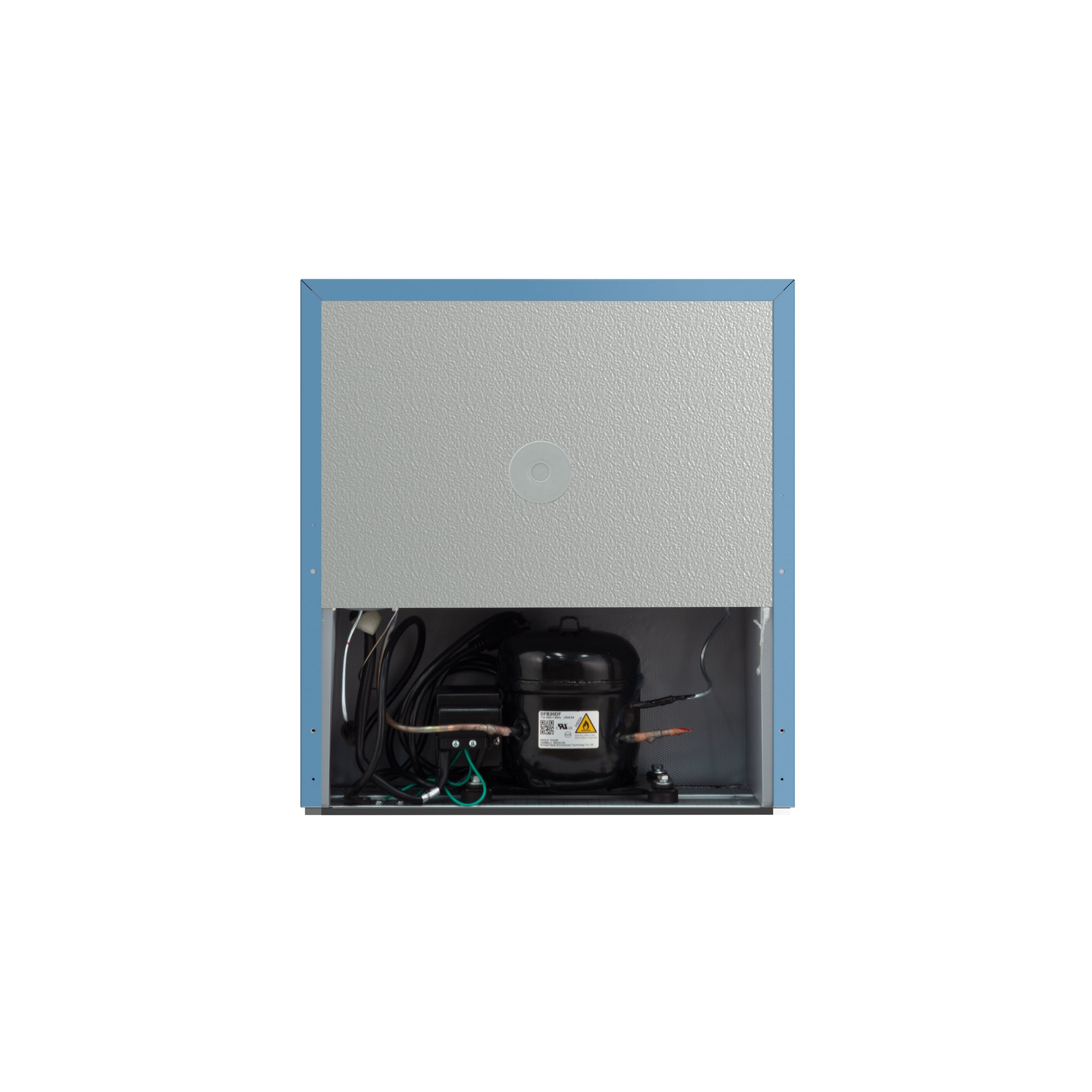 Frigidaire 1.6 Cu. Ft. Single Door Mini Fridge EFR115, Blue: Offers 1.6 cu. ft. of refrigerator space and freezer space in a compact frame Compressor cooling fosters smooth operation and inhibits overheating Wire shelf design for ventilation and easy visibility Flat-back design helps conserve space Recessed door handle for easy door operation and a sleek appearance Reversible door swings open from either side to suit your preference 2-liter door-bottle storage is great for juice containers, soda bottles and more Includes an ice cube tray for your convenience Separate ice cube chamber maximizes freezer space Adjustable thermostat for easy temperature control Half-width freezer compartment can be defrosted manually Leveling legs offer easy positioning