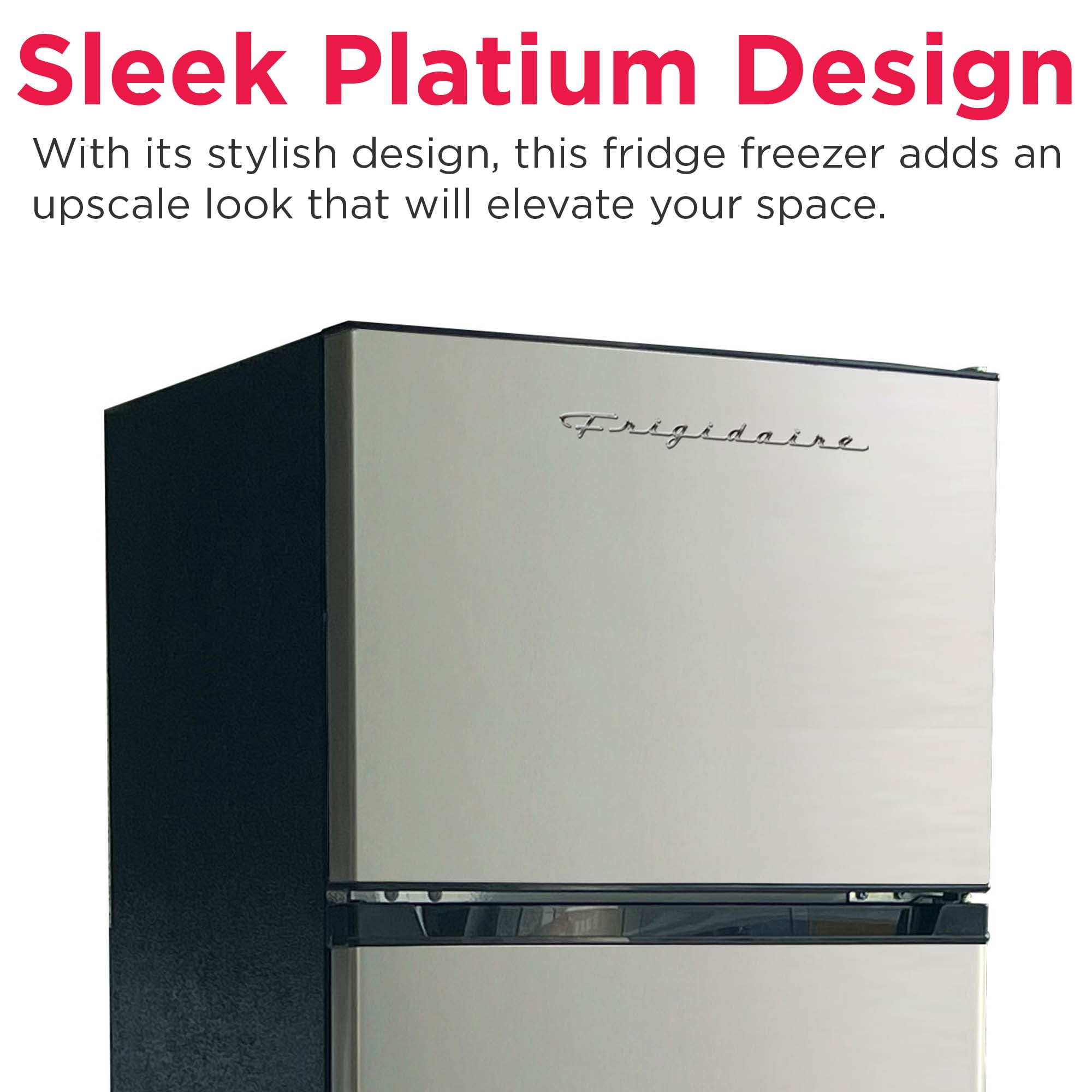 Your Frigidaire retro 7.5 cu. ft. Top-Freezer Refrigerator with Platinum design look features upfront temperature controls that make it simple to regulate both the fresh food and freezer sections. Adjustable shelves provide flexibility to meet your food storage needs. Combines easy-to-use features with practical design to complement any kitchen. Maintenance is easy with the convenient cycle defrost system and finding your favorite beverages is a breeze due to the tall bottle storage in the door. There are three adjustable glass refrigerator shelves and one adjustable/removable wire freezer shelf to provide maximum and versatile storage space. Your vegetables will stay cool and easy to find in the glass cover crisper. Left or right-handed opening is your choice with the reversible door hinge and this sturdy refrigerator can be installed against a wall with its smooth back design.