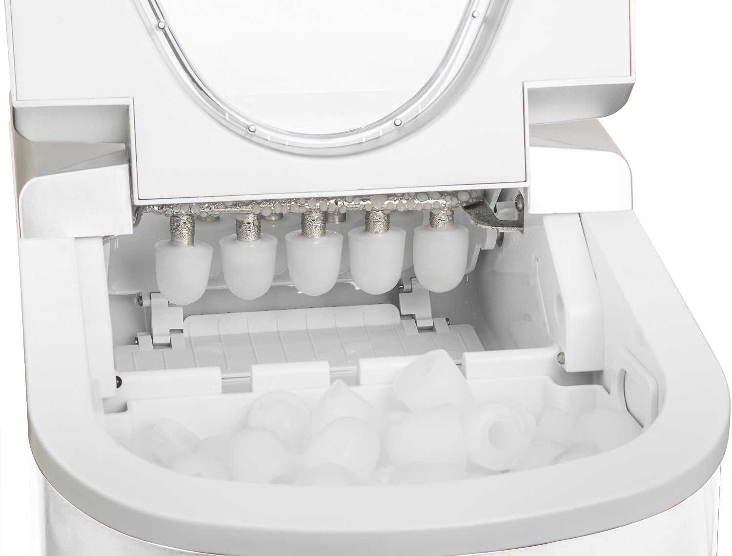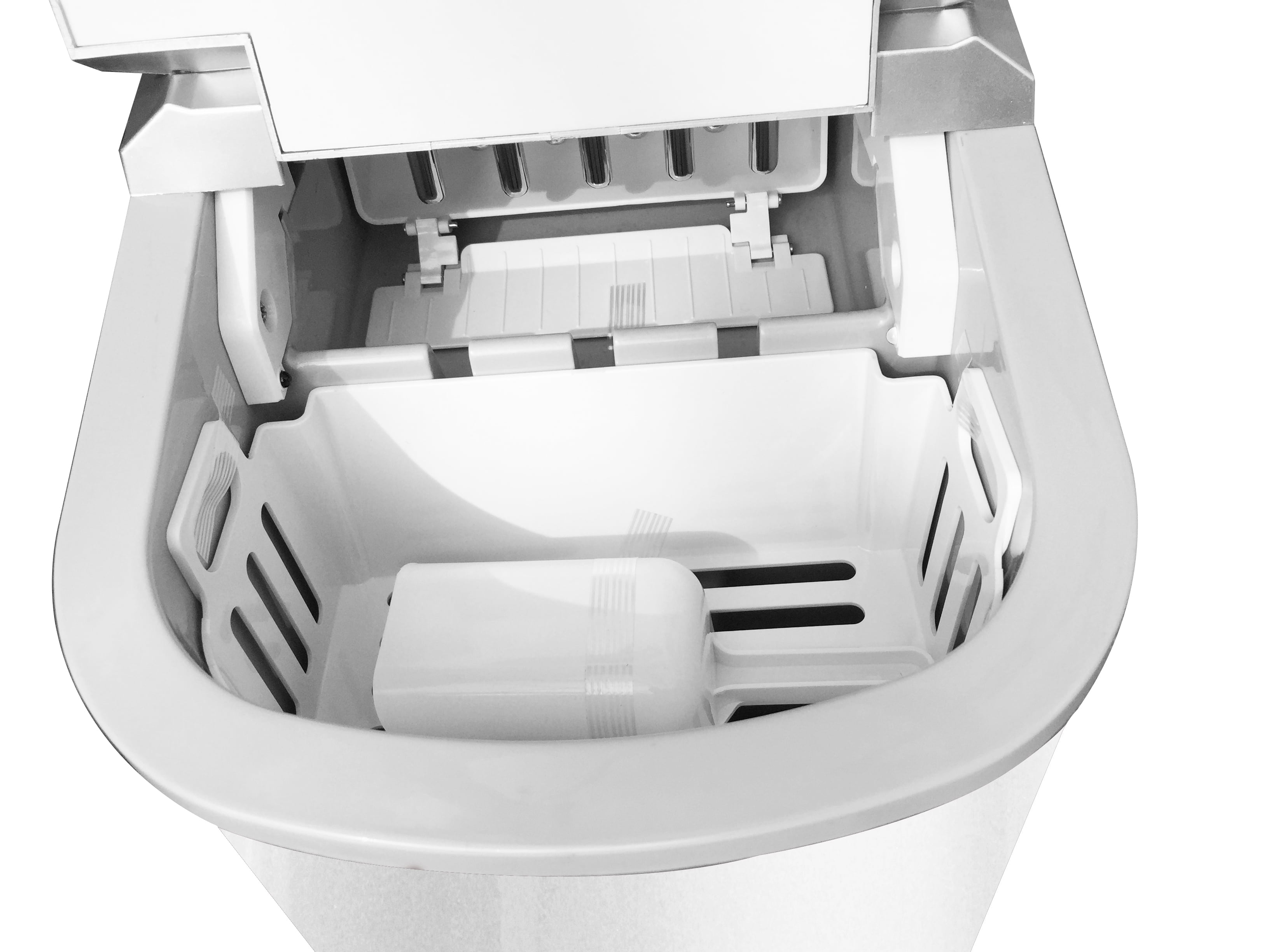 Produces up to 26 lbs. of ice in 24 hours Bin stores up to 1 to 1-1/2 lbs. of ice at a time, great for parties or gatherings Makes ice in as little as 13 minutes Produces ice cubes in two different sizes to suit your needs Digital control panel indicates when bin is full and when water is empty 2.3 Qt. capacity water reservoir for maximum ice production Exterior drain ensures easy use White colored exterior offers a fresh, clean look Compact countertop design enables easy portability Sleek, contemporary design looks great on any countertop Important: This ice maker is designed to produce ice, not store it. The unit does not keep ice frozen once it’s made. To prevent melting, transfer the ice to your freezer promptly after it is produced.