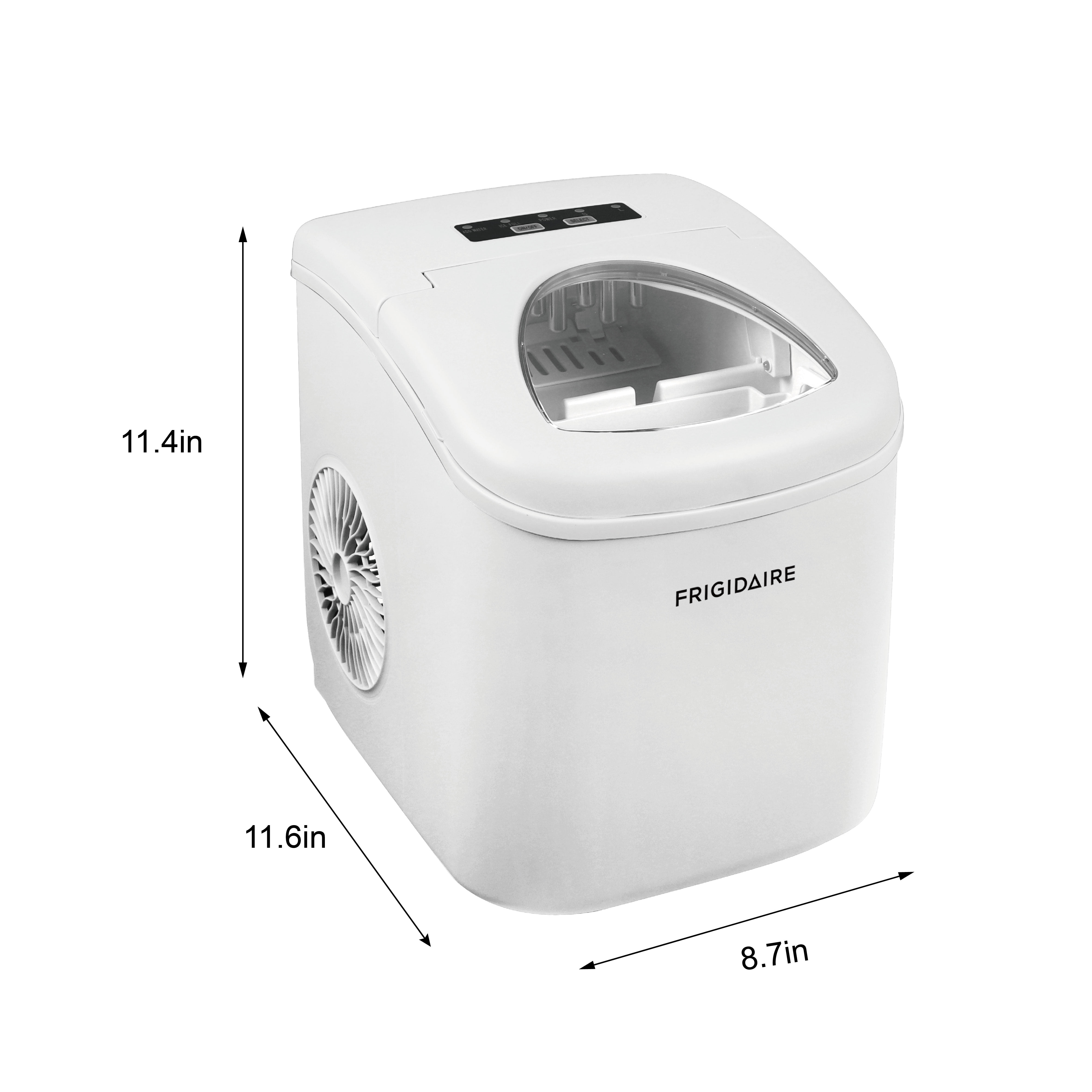 In just minutes, you can make ice cubes for parties or hot summer days with the Frigidaire 26 lb. Freestanding Ice Maker in white. Its compact and contemporary design makes it easy to transport and stylish to display. With a 1.8 lb. ice cube basket capacity, this ice maker conveniently saves space in your freezer for other food. It features a 2.3 Qt. capacity water reservoir that can make up to 26 lbs. of ice in 24 hours, with no need to drain the melted ice as it drains back to the reservoir. This counter top machine features the compressor cooling system and operates at low noise, while the modern design and adjustable cube size add to its unique functionality.