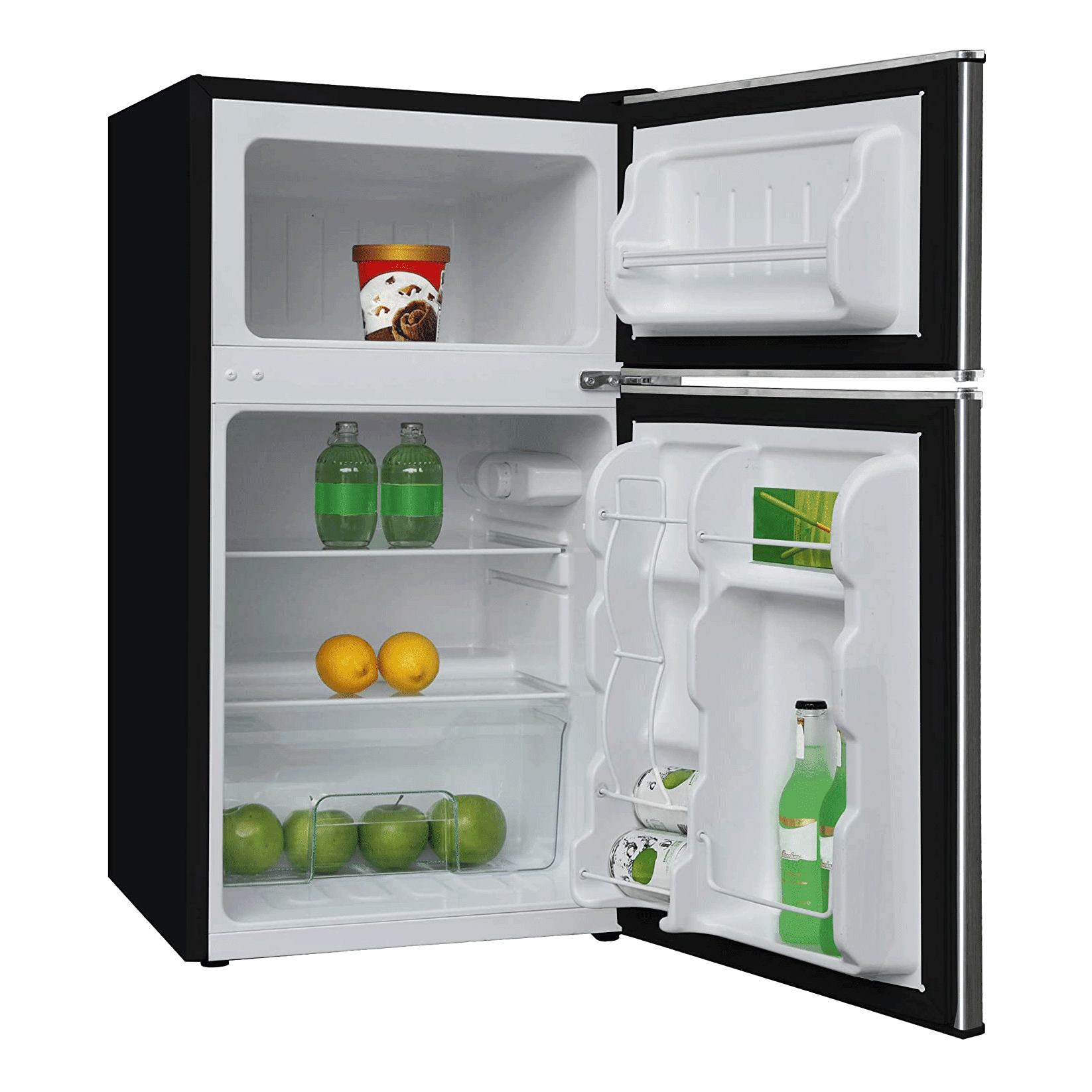 3.1 cu. ft. fresh food capacity provides ample interior space Separate top mount freezer with additional storage inside the door Slide-out fresh food shelf simplifies cleanup Door with chrome trim Adjustable temperature control for customized cooling Accommodates 2-liter and tall bottles for convenience Flush-back design for multiple placement options in any room Adjustable leveling legs help keep refrigerator stable on uneven floors A dairy rack is conveniently located in the door