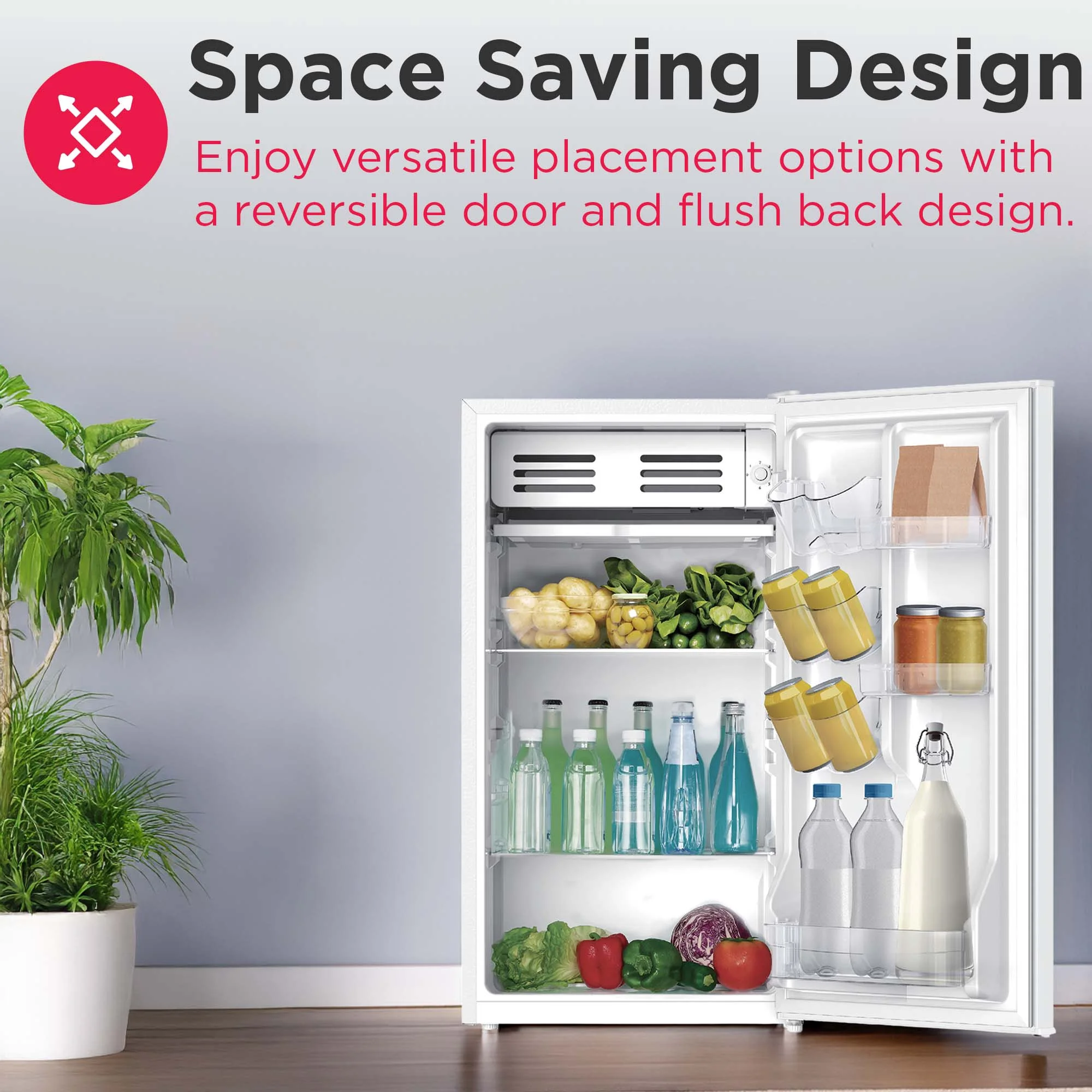 Retro Charm – Elevate your space with this sleek and stylish small retro fridge. The eye-catching design infuses retro charm into any room. Its compact size and stylish design make it a great addition to your bedroom, office, or dorm room. Eraser Board Feature: Write and erase notes, lists and more on the door Spacious Design – Featuring a 3.2 cu. ft. capacity, this compact fridge offers plenty of storage for bottles, cans, snacks, and more. The space-saving flush back design allows for seamless placement against walls, making it perfect for smaller spaces. Organized Storage – Equipped with 2 glass shelves and a handy 2L door basket for large bottles, this small fridge provides organized storage for your drinks and snacks, along with a built-in can dispenser. Chiller Compartment – This mini fridge includes a spacious chiller compartment complete with an ice cube tray, so you have everything you need, all in one space. Practical Style – Perfect for entertaining, this small retro refrigerator comes with a built-in bottle opener on the side for quick and easy access to your favorite beverages. The easy-open pull handle adds to the retro vibe, reminiscent of classic designs from the past. Customizable Design Options – Tailor this retro fridge to suit your space and style with the reversible door feature that offers flexible placement options.