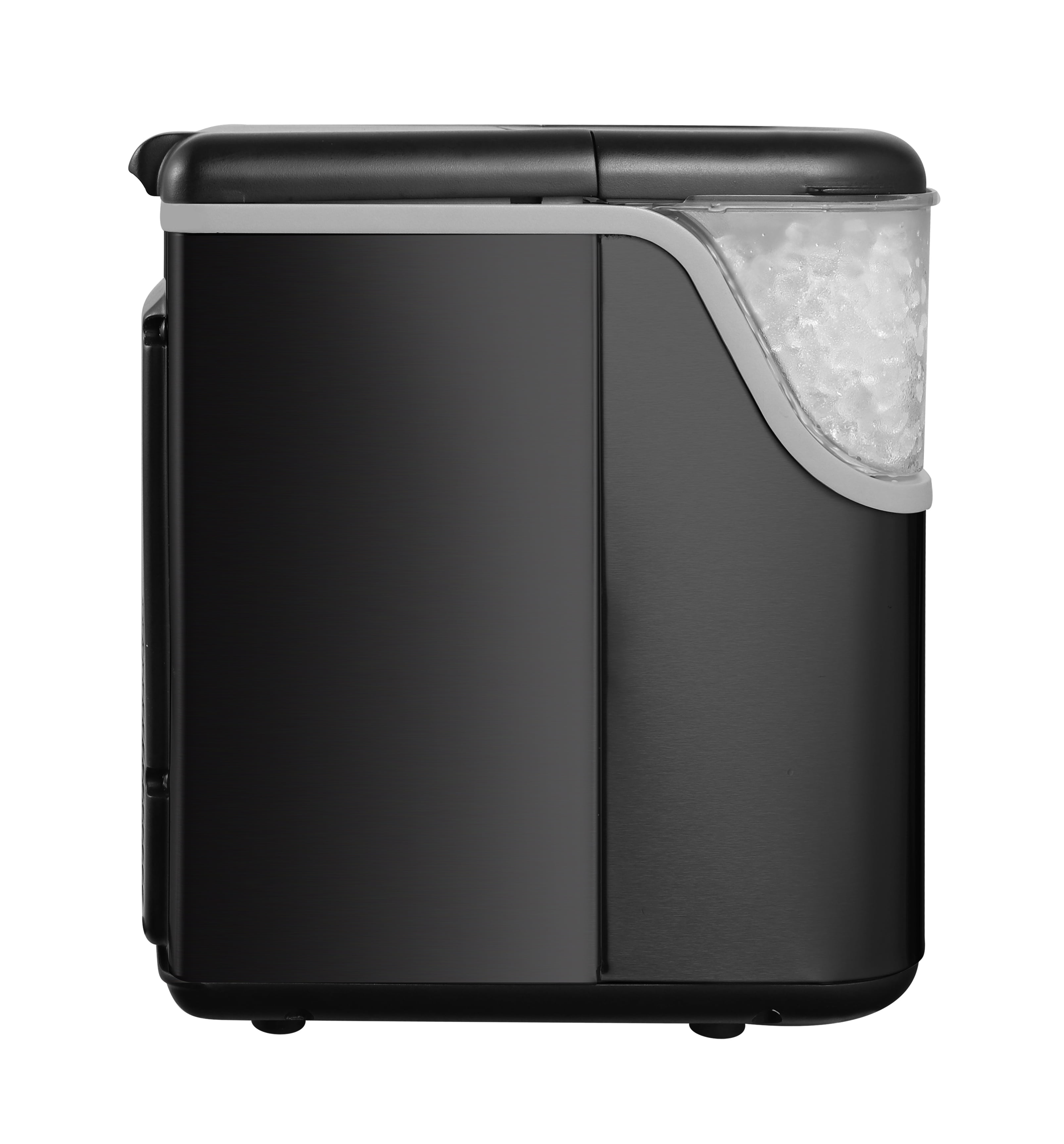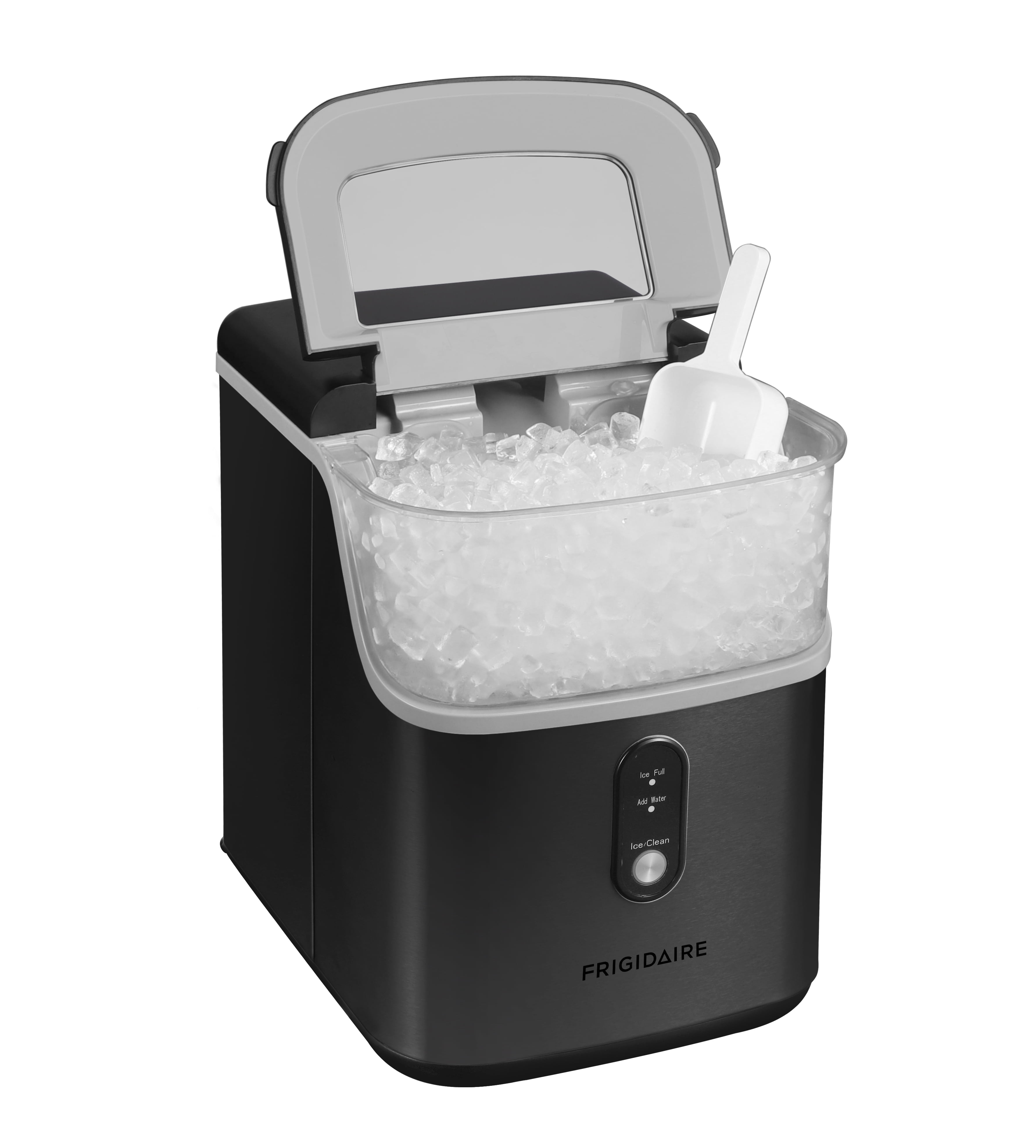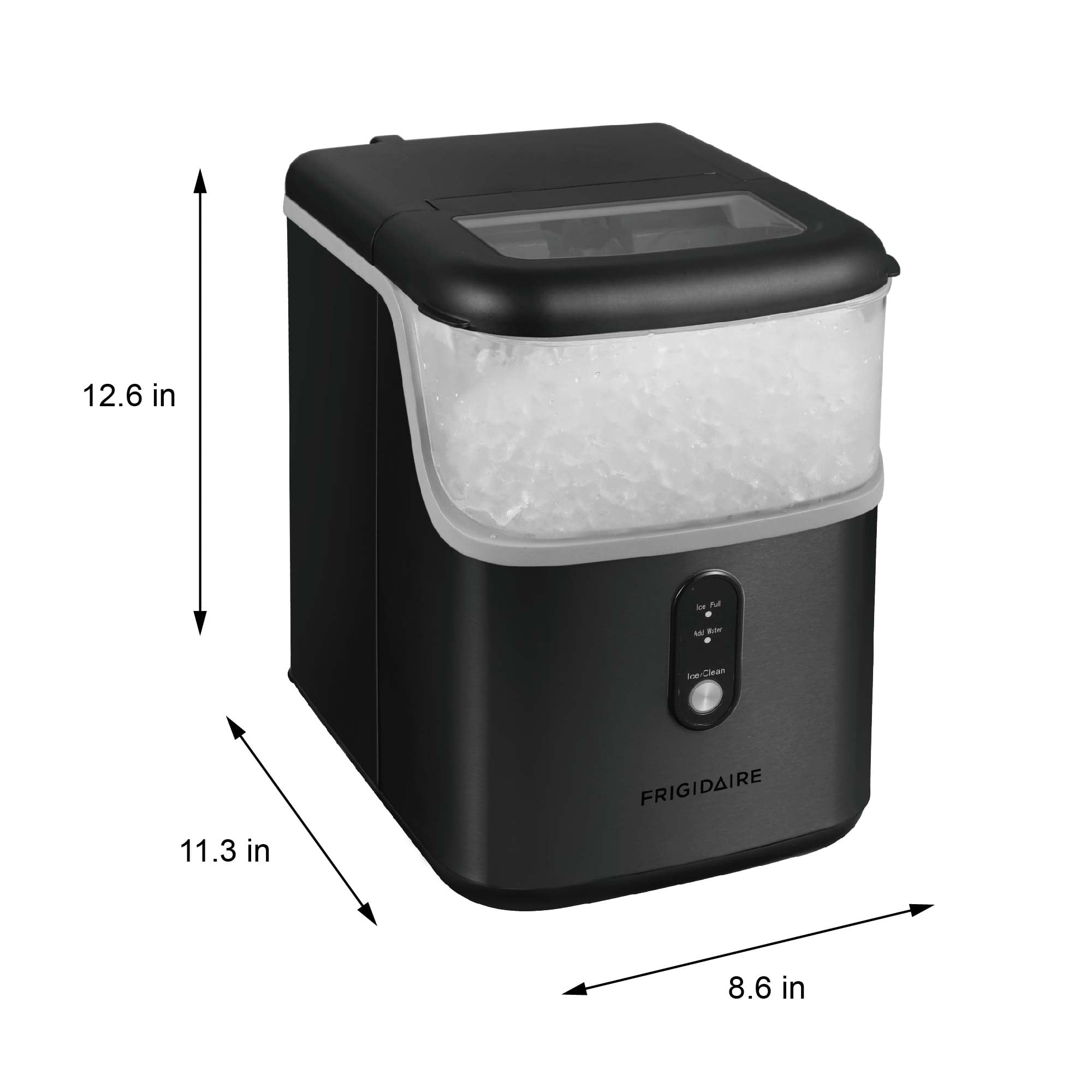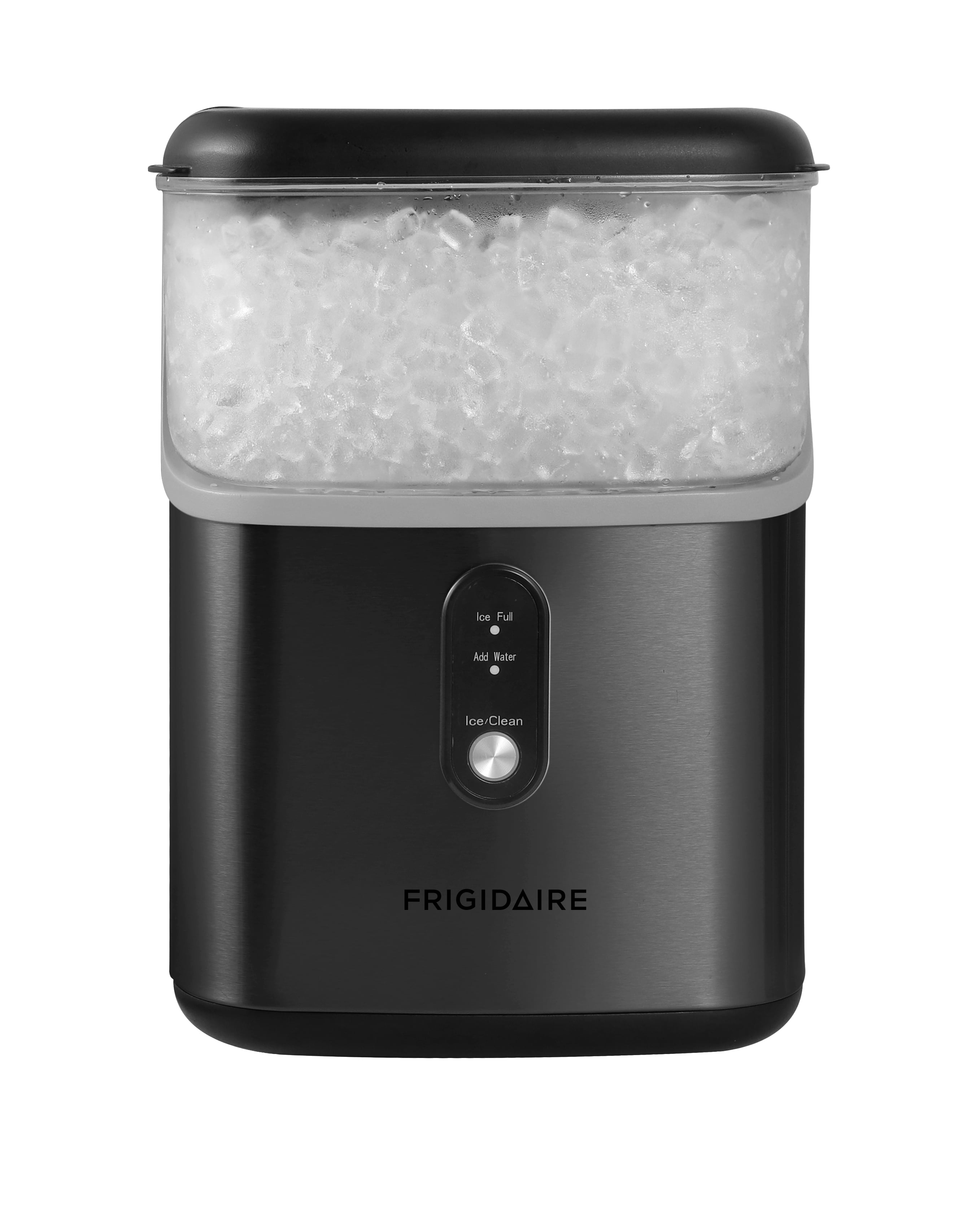 Enjoy chewable nugget ice instead of standard tough ice cubes at home with Frigidaire’s Unique Soft, Crunchy Nuggets: The ice floats in your favorite beverage. Experience the convenience of the Nugget Ice Maker with its impressive ice production capacity of up to 33 lbs. per day. Indulge in the first delightful nugget of ice in just 10-15 minutes, ensuring a quick and refreshing start to your ice-making experience. Unique clear, soft, yet crunchy nuggets that float in your favorite beverage 150 minutes for full ice capacity Push button control panel No water hookup required, just plug it into any 115v grounded (standard) electrical outlet and fill the reservoir with water. Capacity: holds up to 0.9kg in ice basket, water tank capacity 1.1 lbs Operating temperature range 10-40℃ Indicator for water shortage/ice full Sleek black stainless steel finish Important: This ice maker is designed to produce ice, not store it. The unit does not keep ice frozen once it’s made. To prevent melting, transfer the ice to your freezer promptly after it is produced.