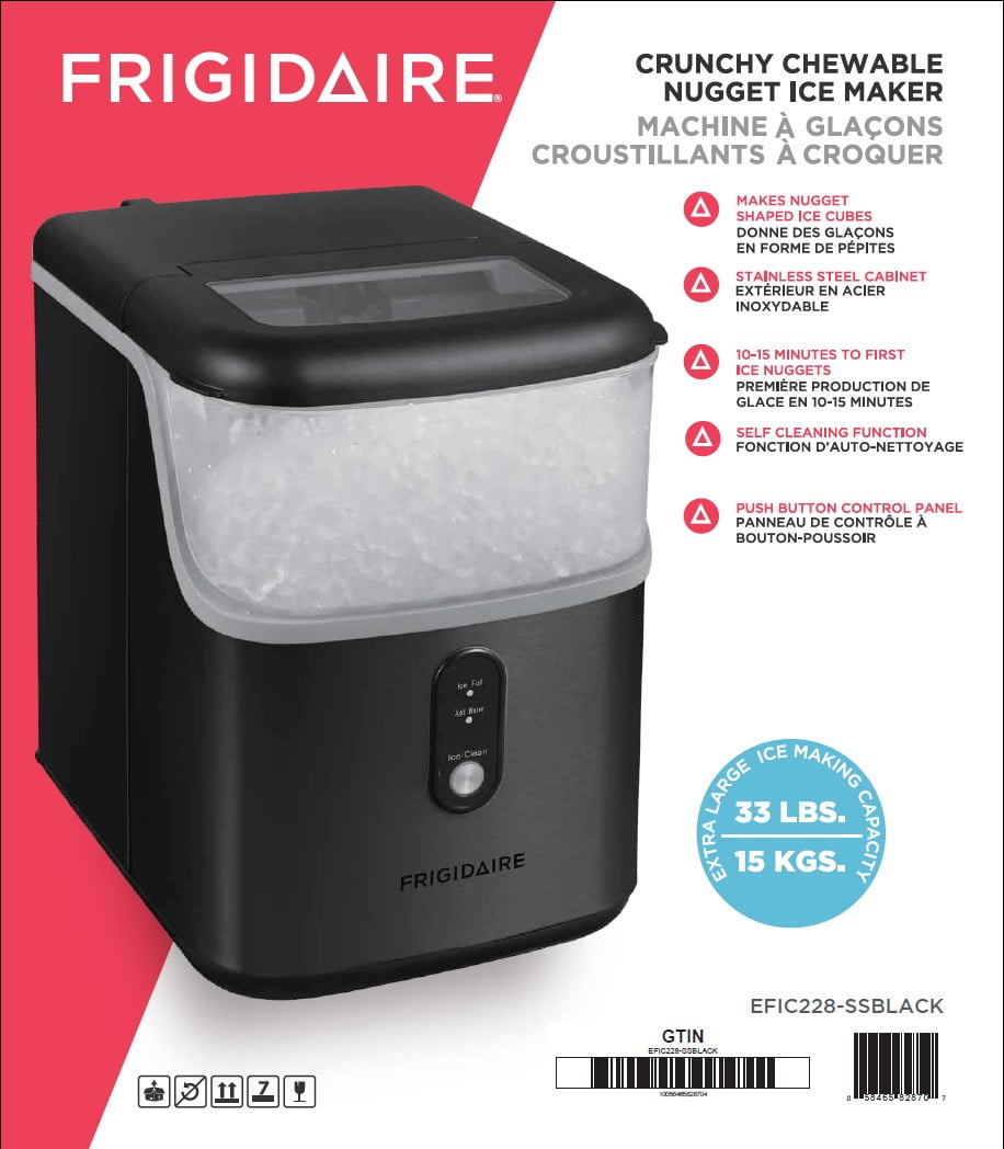 Introducing the Frigidaire Nugget Ice Maker with a 33 lbs. capacity and sleek black stainless steel finish. Say goodbye to tough ice cubes and elevate your beverage experience with chewable nugget ice. These unique clear, soft, yet crunchy nuggets float effortlessly in your favorite beverages, delivering a refreshing and enjoyable drinking experience. With its high ice production capacity of up to 33 lbs. in a day, you’ll never run out of ice for your drinks. The first nugget of ice is ready in just 10-15 minutes, allowing you to enjoy your chilled beverages without delay. In approximately 150 minutes, the ice maker reaches its full ice capacity, ensuring you always have a plentiful supply on hand. The push-button control panel makes operation a breeze. No water hookup is required—all you need to do is plug the ice maker into any standard 115V grounded electrical outlet and fill the reservoir with water. With a capacity of up to 0.9 kg in the ice basket and a water tank capacity of 1.1 liters, this ice maker provides ample ice for your needs. Operating within a temperature range of 10-40℃, this ice maker is versatile and adaptable to different environments. An indicator is included to alert you of water shortage or when the ice basket is full, ensuring a hassle-free ice-making process. The sleek stainless steel finish adds a touch of sophistication to your kitchen or bar area. Upgrade your beverage experience with the Frigidaire Nugget Ice Maker, and enjoy chewable ice in your drinks anytime, anywhere33