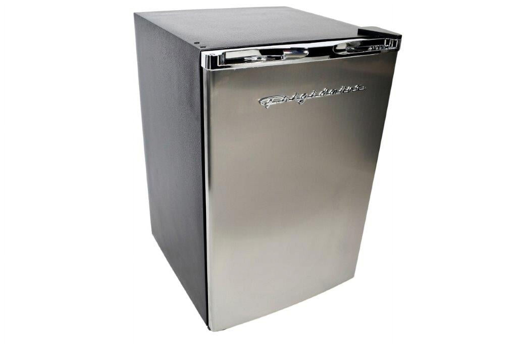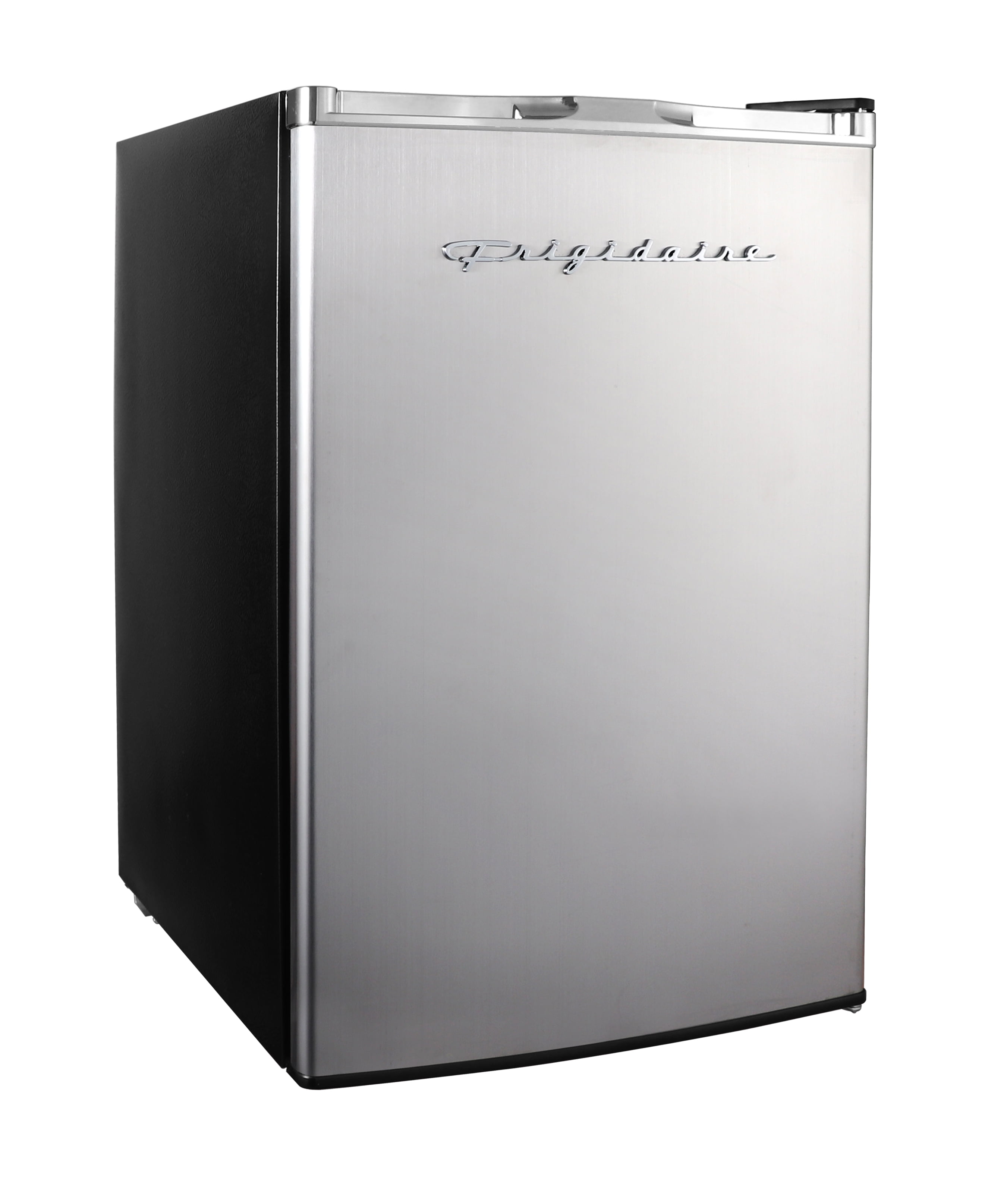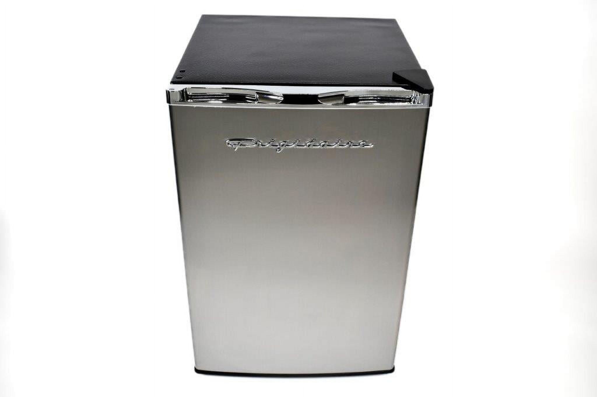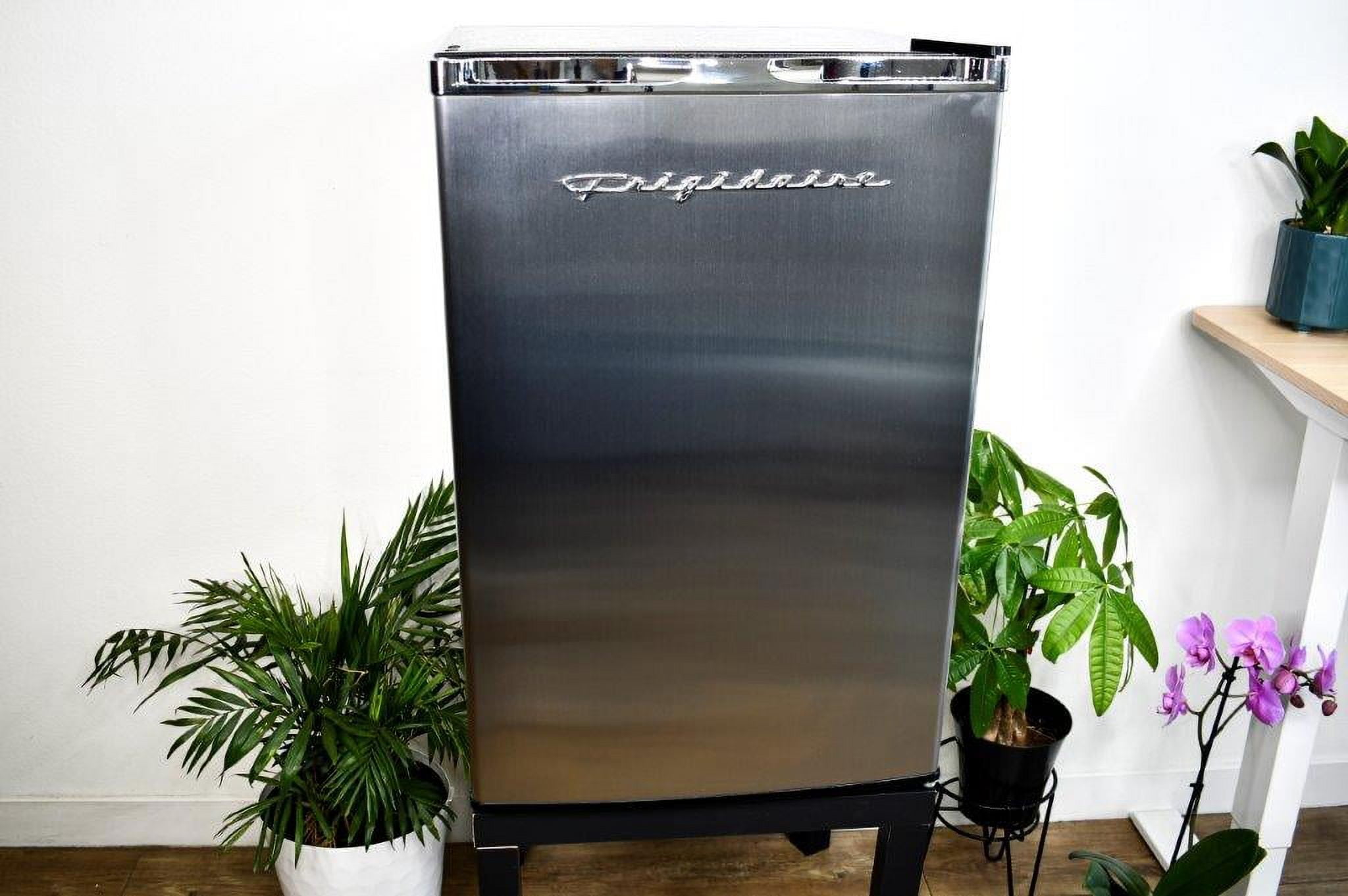 The Retro Platinum Frigidaire 4.5 cu. ft. Compact Refrigerator with chrome trim is roomy enough for your groceries but small and sleek enough to fit almost anywhere. This model features a top-mount full size freezer with manual defrost and storage door. Slide-out shelves provides efficient storage options and adds to its unique style. Designed for energy efficiency, this mini fridge includes an ice cube chamber. The flush-back design and door handle offer a clean and retro appearance that looks great in your home, in a dorm or at the office.