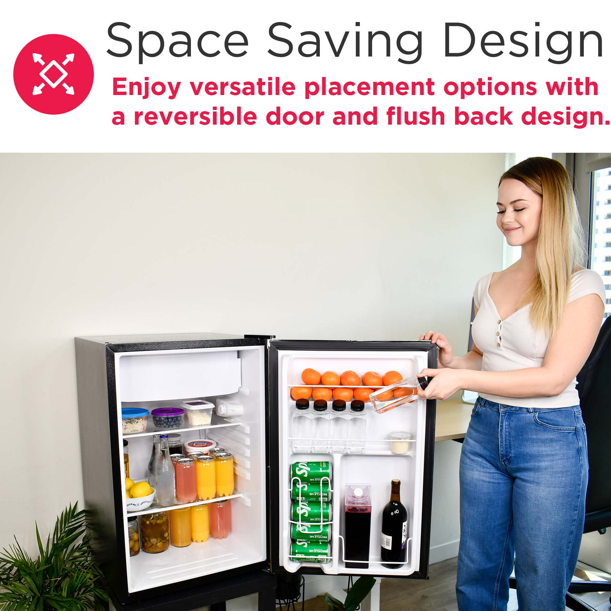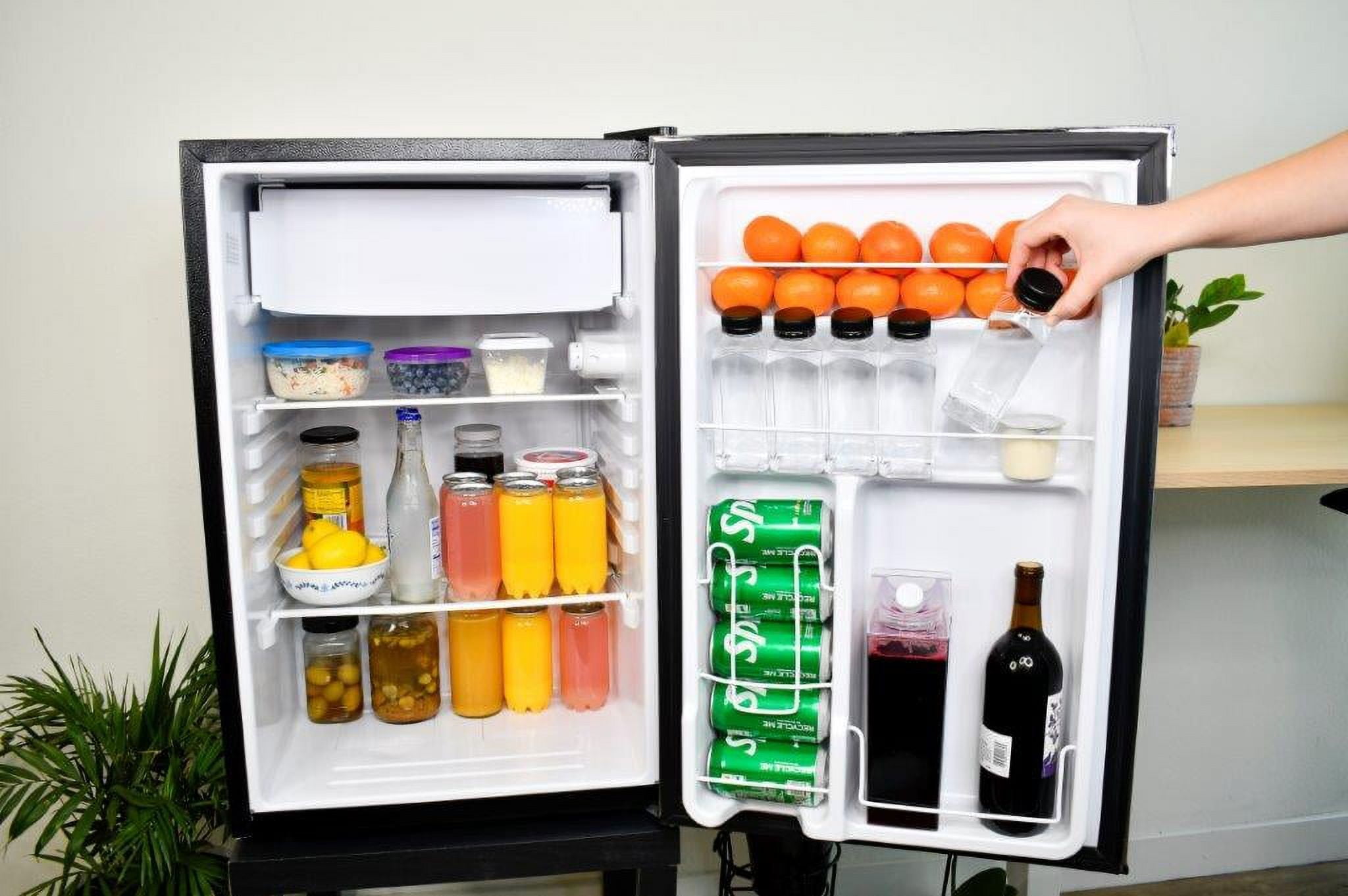 Spacious Design – Featuring a 4.5 cu. ft. capacity, this compact fridge offers plenty of storage for bottles, cans, snacks, and more. The space-saving flush back design allows for seamless placement against walls, making it perfect for smaller spaces. Organized Storage – Equipped with glass shelves and a handy 2L door basket for large bottles, this small fridge provides organized storage for your drinks and snacks, along with a built-in can dispenser. Modern Aesthetic – Elevate your space with this stylish small fridge. The eye-catching design infuses a modern sleekness into any room. The compact refrigerator’s size and stylish design make it a great addition to your bedroom, office, or dorm room. Chiller Compartment – This mini fridge includes a spacious chiller compartment complete with an ice cube tray, so you have everything you need, all in one space. Practical Style – Perfect for entertaining, this dorm room fridge comes with an easy-open recessed handle that adds to the vibe and the modern look. Customizable Design Options – Tailor this countertop fridge to suit your space and style with the reversible door and leveling legs for flexible placement options.