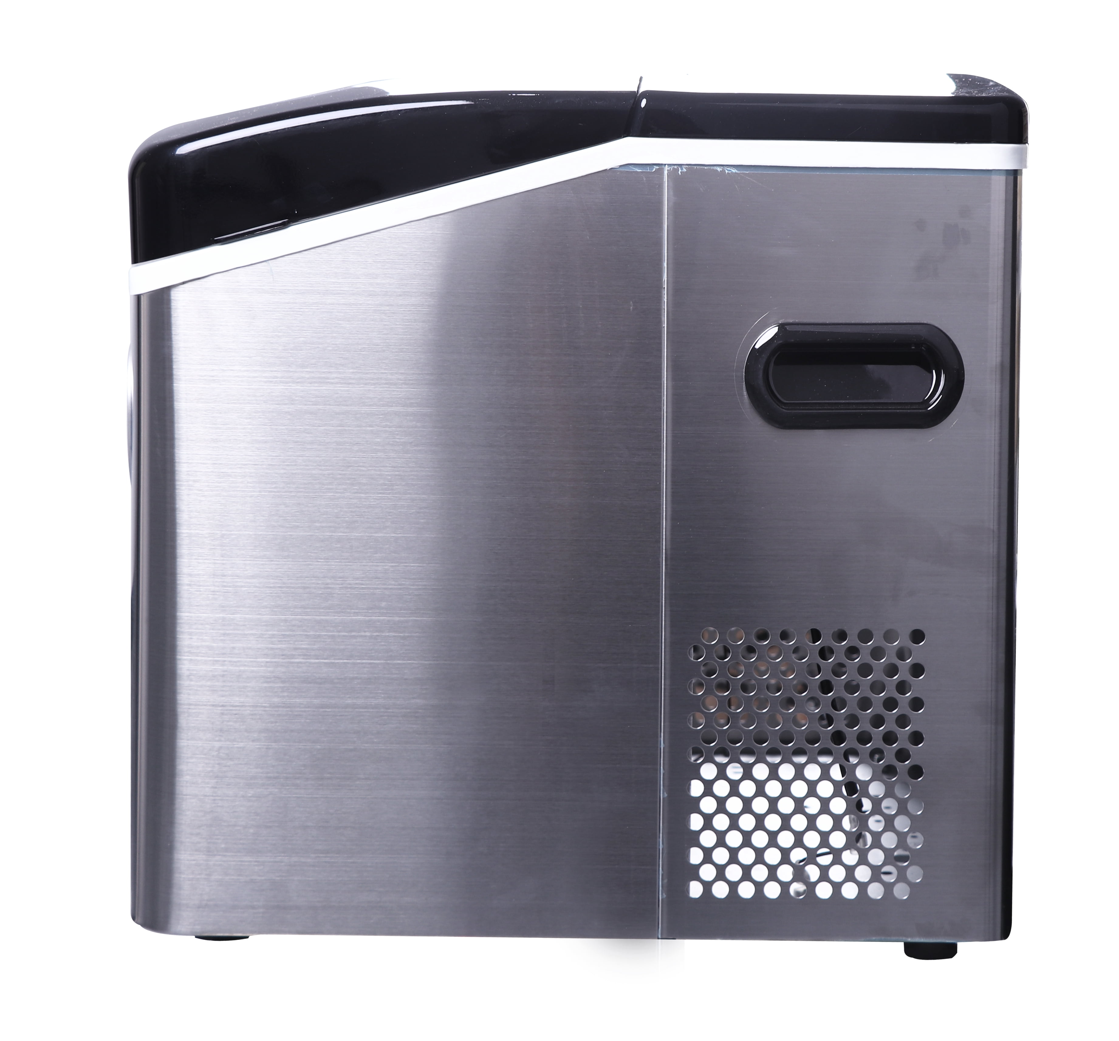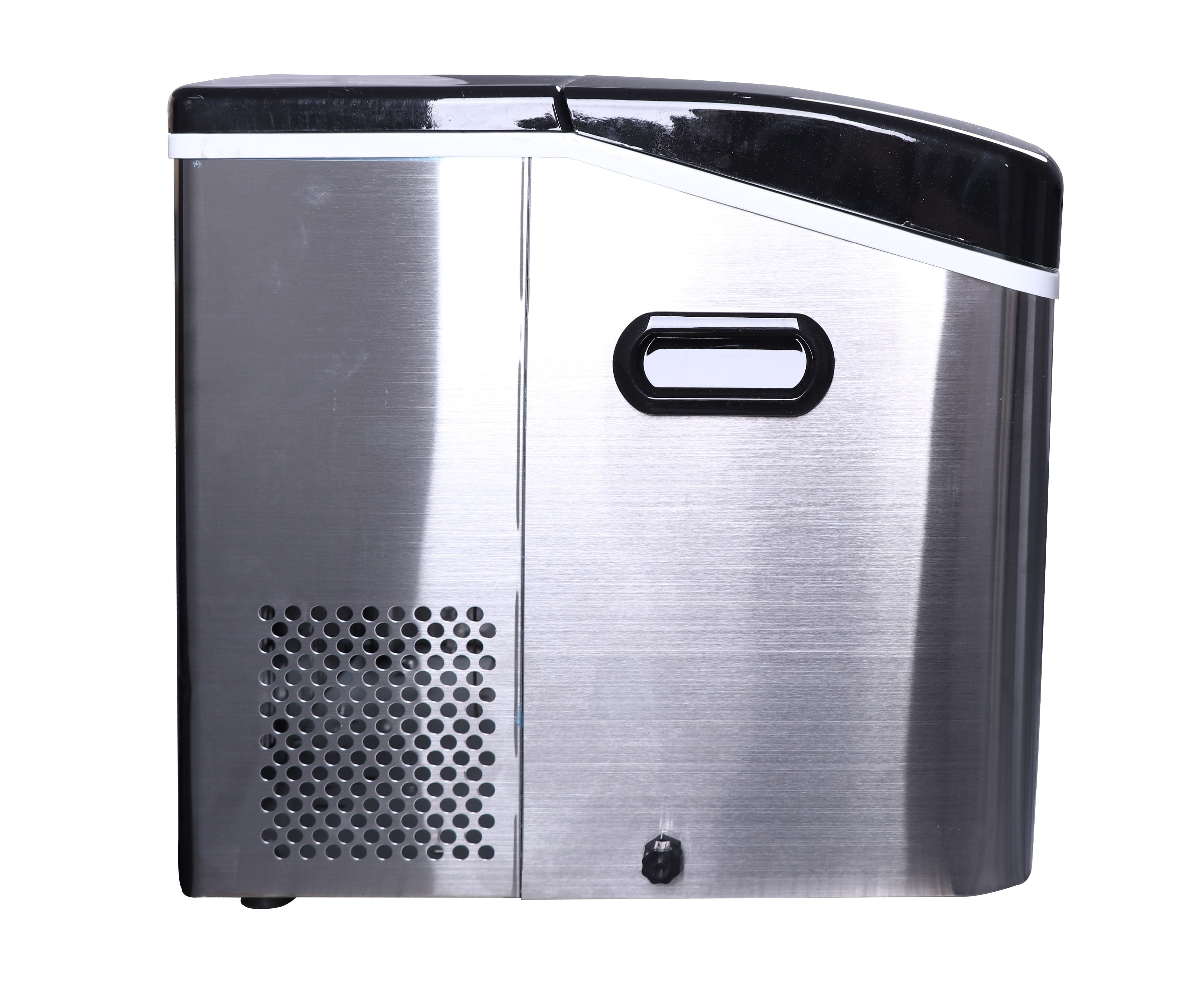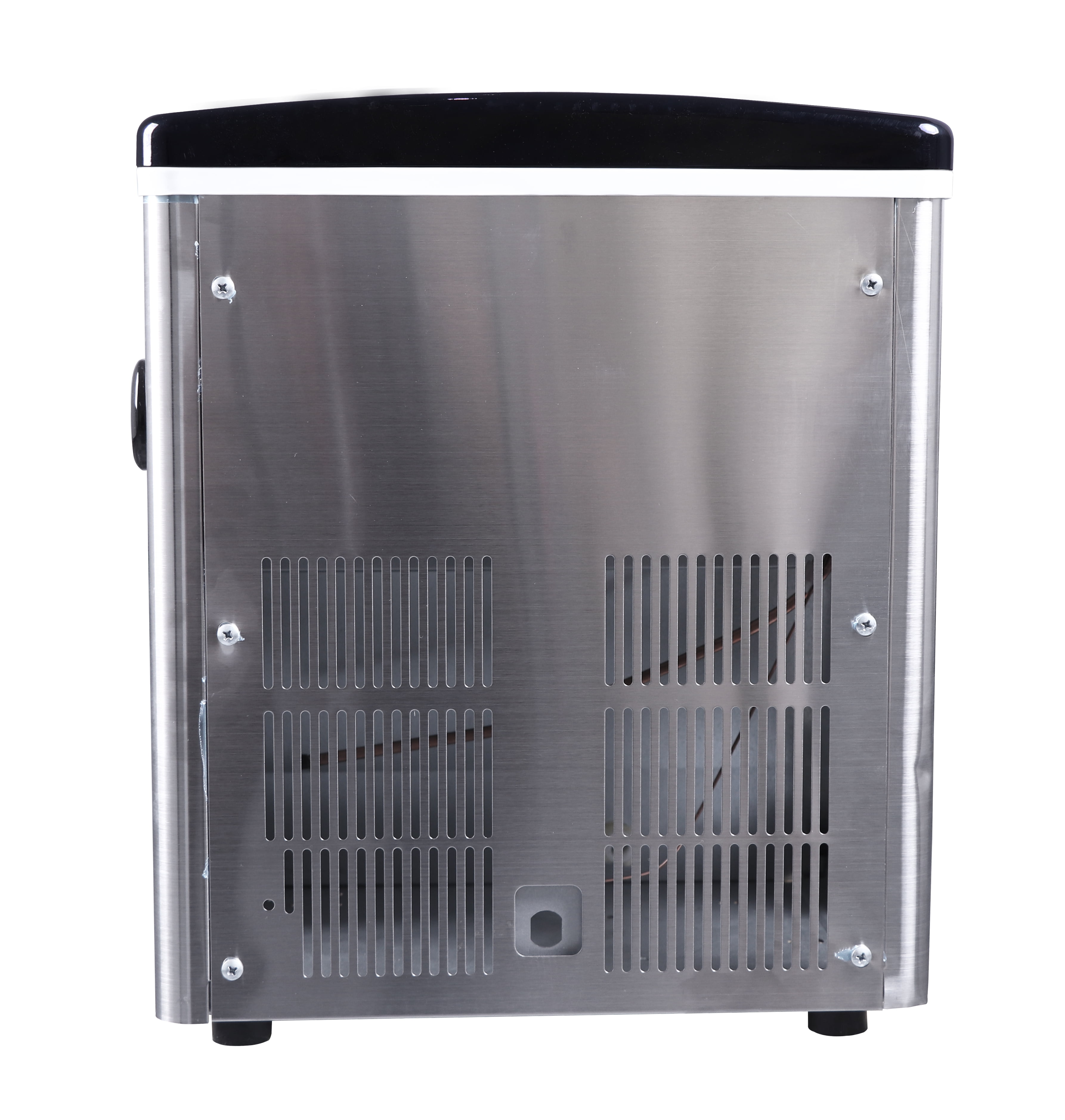 Control panel features easy to use button functions with LED indicators A power on LED indicator lets you know the unit is on and producing ice An ice cube select size button allows you to choose your ice size from small to medium to large. An LED light indicator will display which size you chose. An add water LED indicator alerts you if there is no water in the water reservoir and it’s time to add more water An ice full LED indicator will let you know when your ice basket is full and it’s time for it to be emptied. Ice basket will hold 2.5 to 3 pounds of fresh ice. A water drain with drain cap, rubber plug and drain spout makes it a cinch to drain and clean your ice maker. A stylish cover with a transparent window enables you to see into the ice without opening the lid This ice maker is super quiet compressor cooled with a running noise of less than 43 decibels The ice maker has built-in safeguards and will automatically shut down if any problems are detected limiting accidental damage. The sleek stainless steel design will add a touch of elegance to any décor.