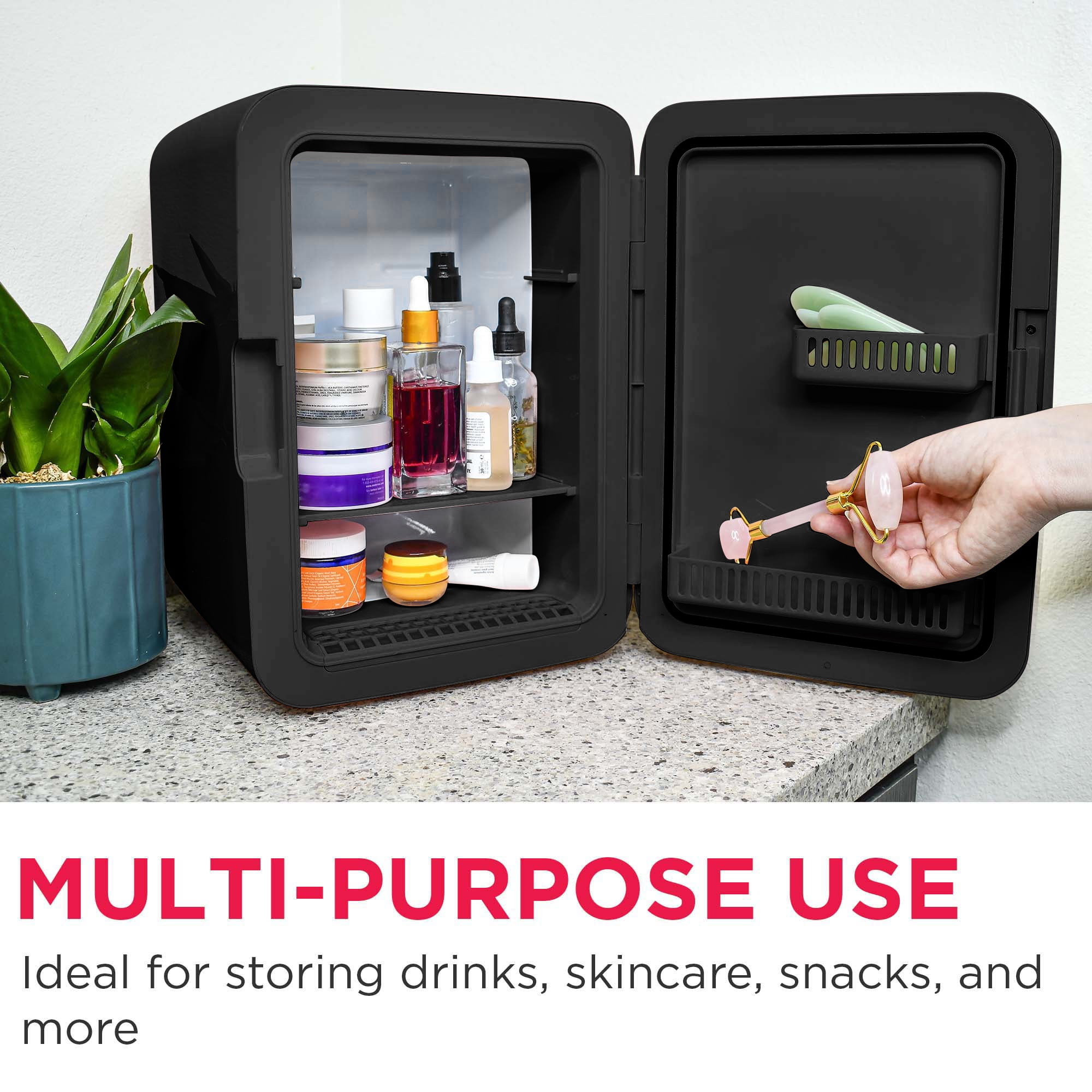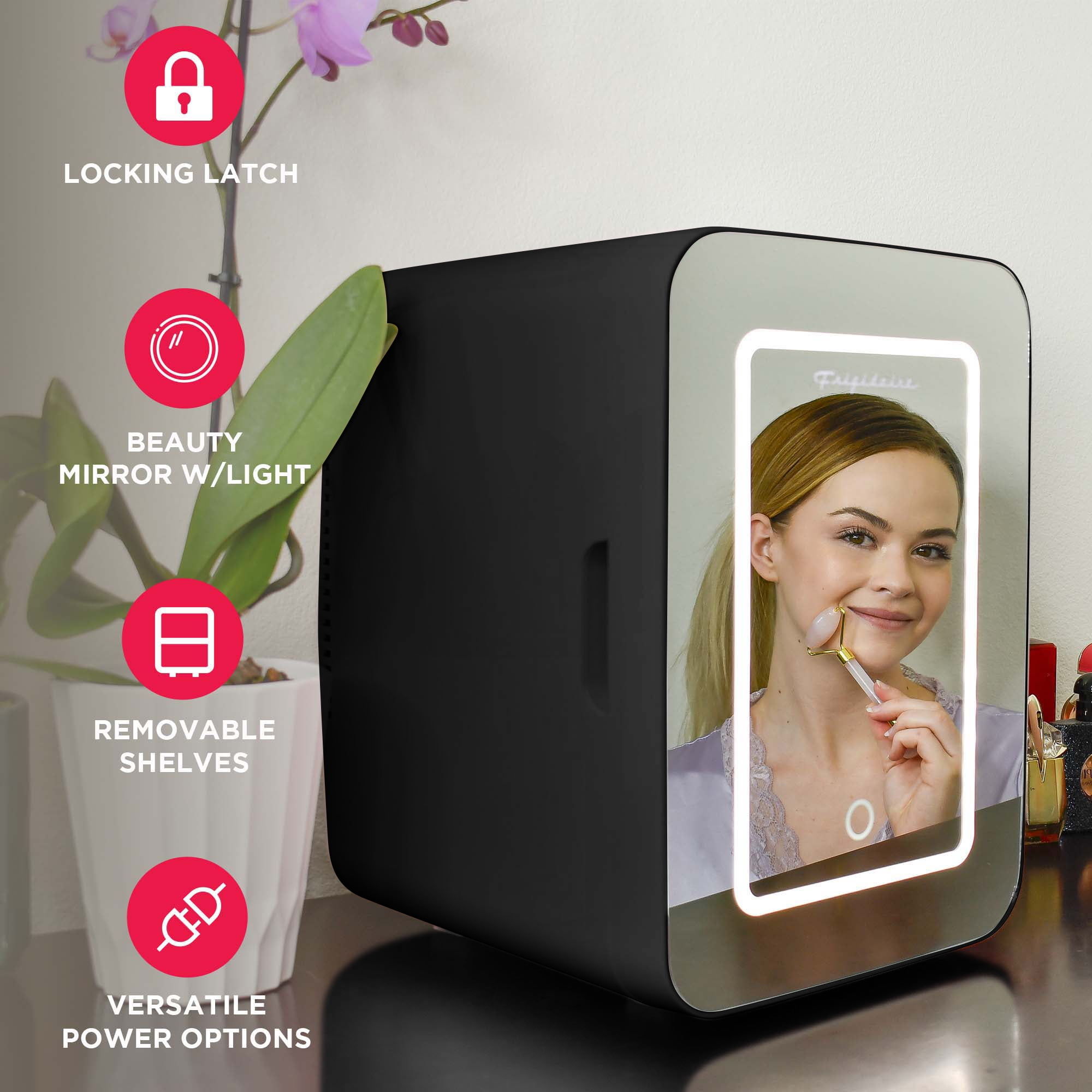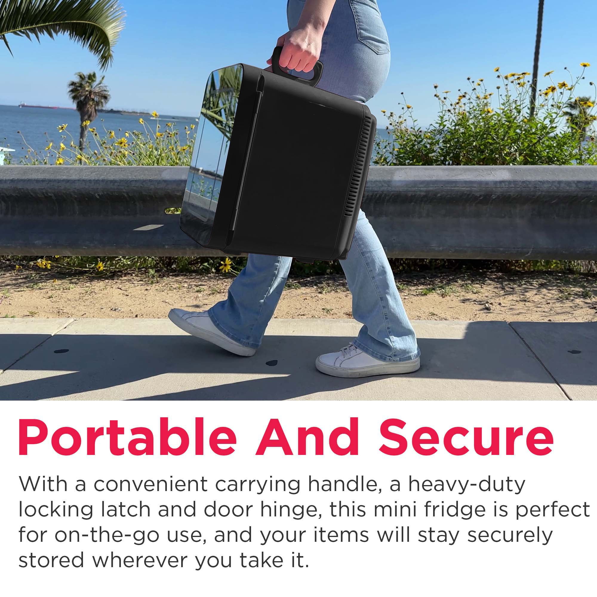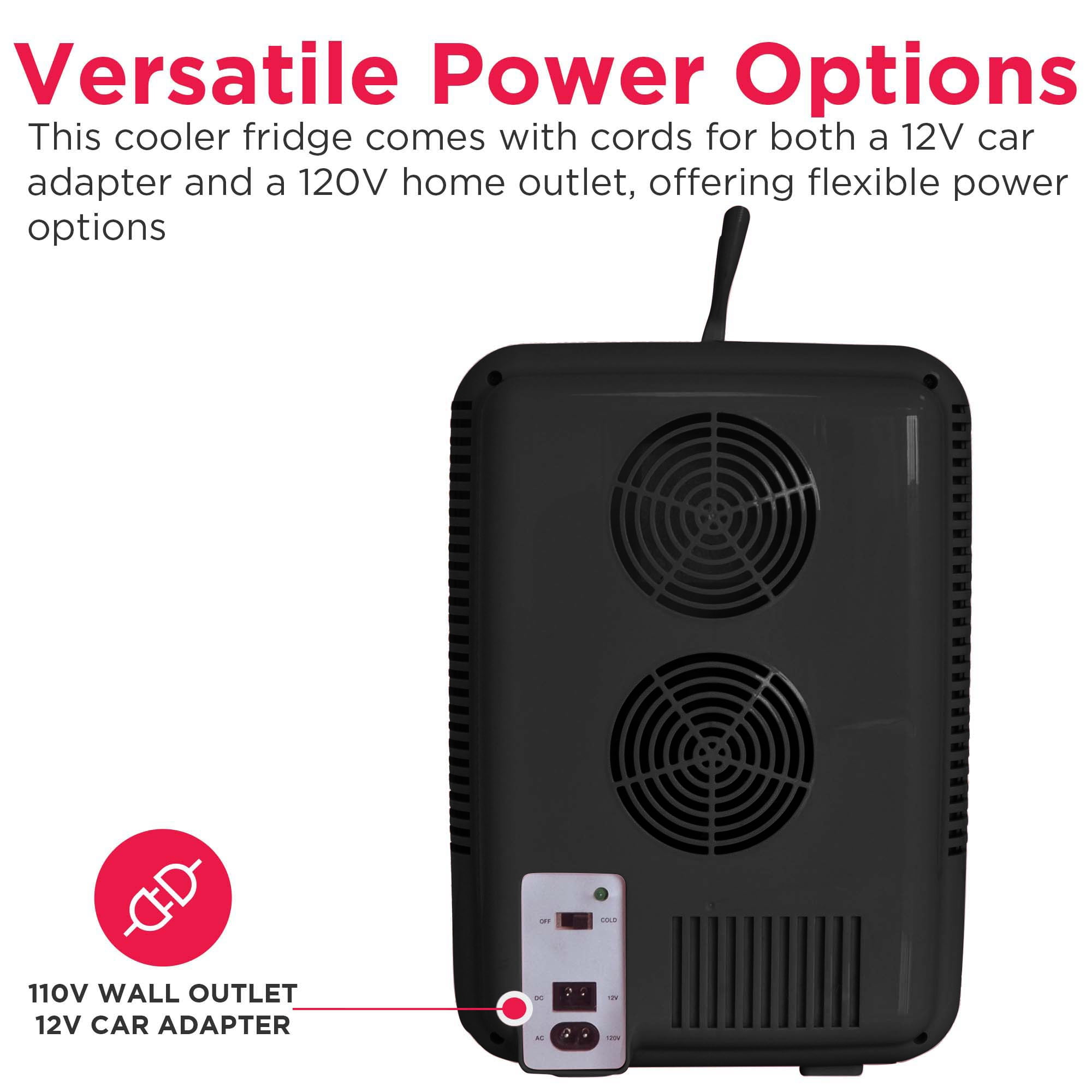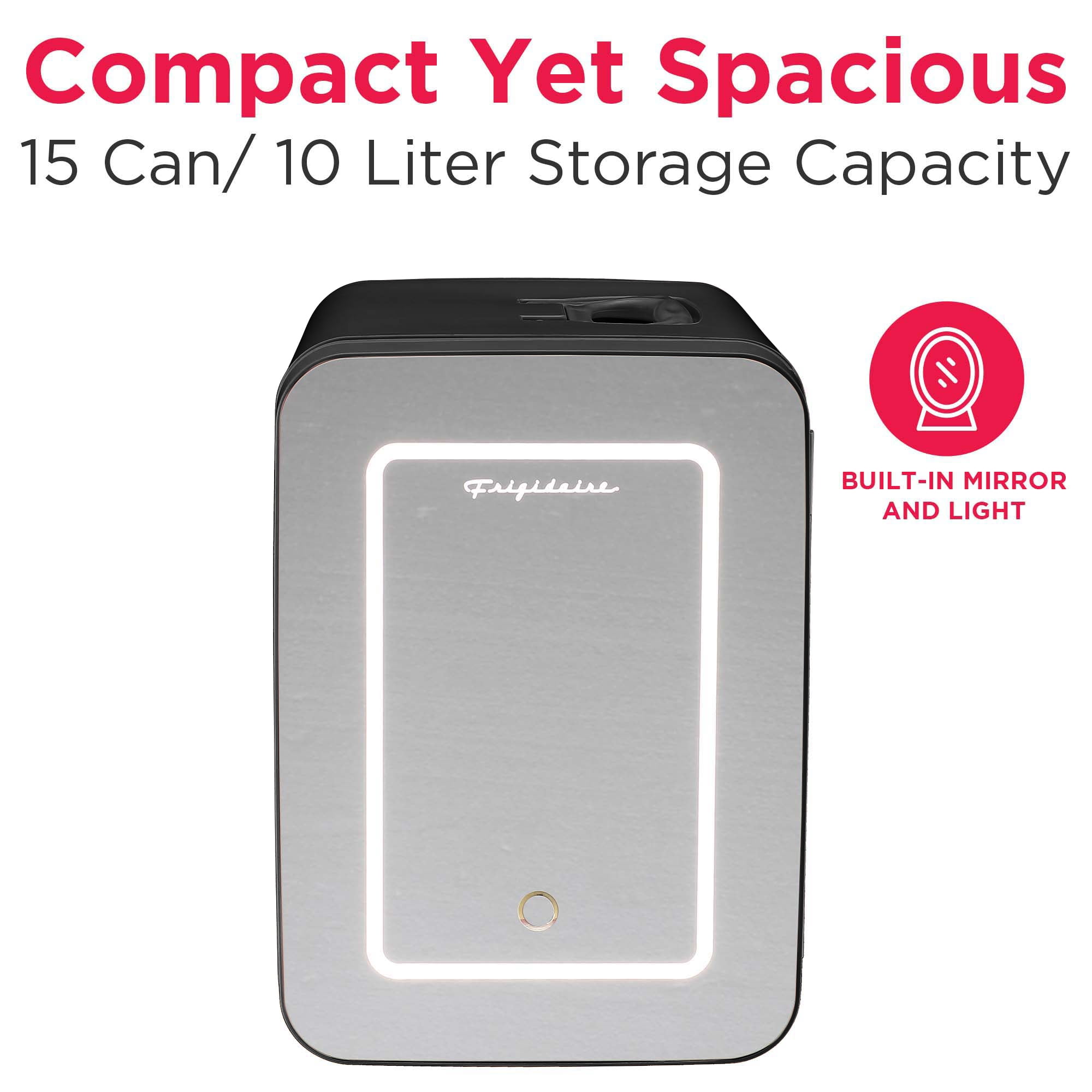 For use in personal spaces, bedrooms, offices, hotels, boats, carpools, soccer games, sporting events, backyard BBQ, pool parties, and more .35 cu. ft., 10 L capacity chills up to 15 cans; removable shelf to store small items such as makeup, skin care products, yogurt, fruit, milk, baby bottles, soup, etc. Lighted mirror, cosmetic-door design for applying makeup Engineered with thermoelectric technology and uses advanced semiconductors that are free of CFCs and refrigerants, making it better for the environment Our mini beverage fridge is engineered to chill beverages 26-28°F below the ambient temperature. However, the extent of cooling achieved may vary based on the surrounding environment. Fully insulated with easy-to-clean interior Portable, plugs into either home outlet or car’s 12-volt outlet Non scratch feet Includes carrying handle, AC power cord and 12-volt DC car adapter Our mini beverage fridge is engineered to chill beverages 26-28°F below the ambient temperature. However, the extent of cooling achieved may vary based on the surrounding environment.