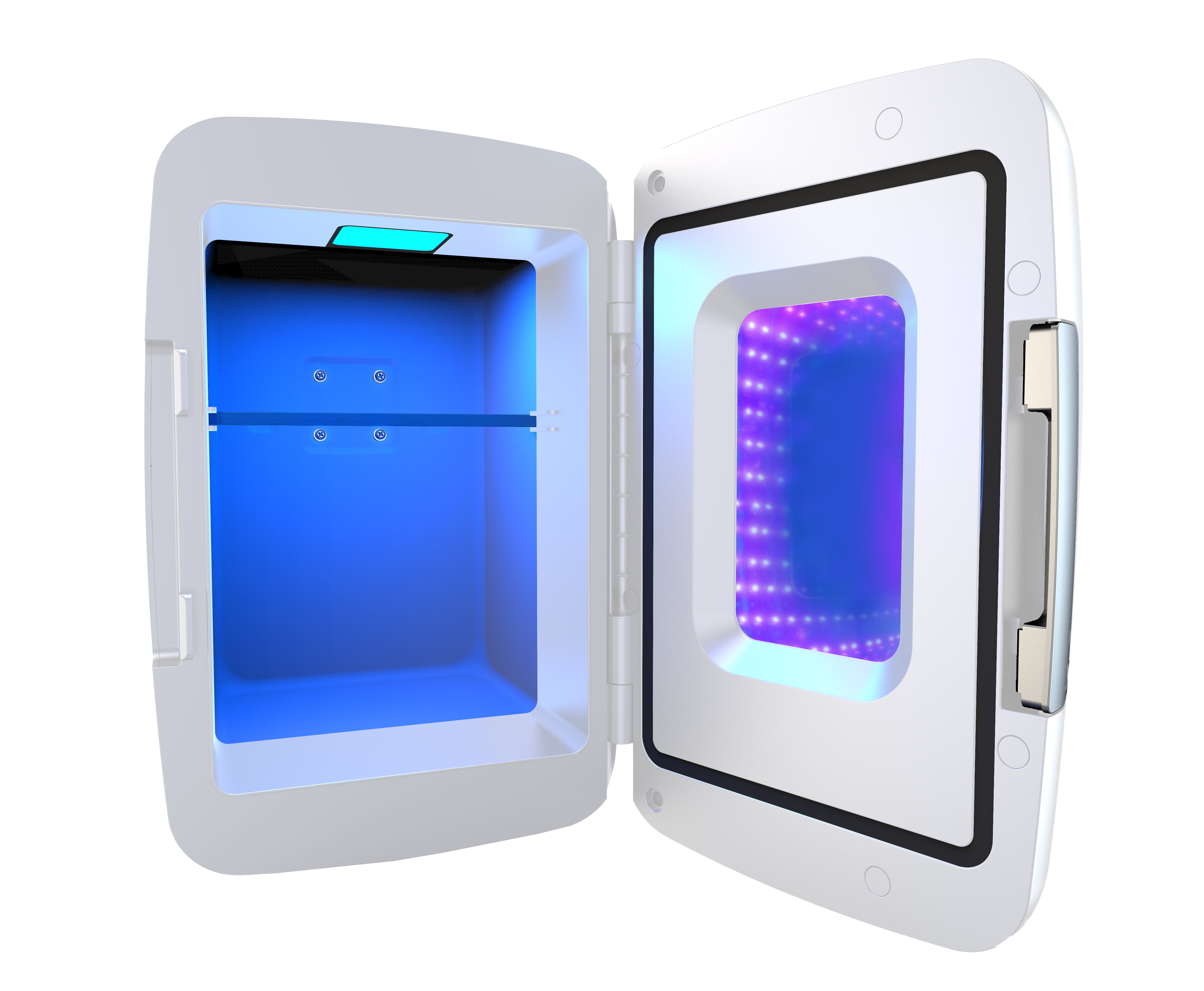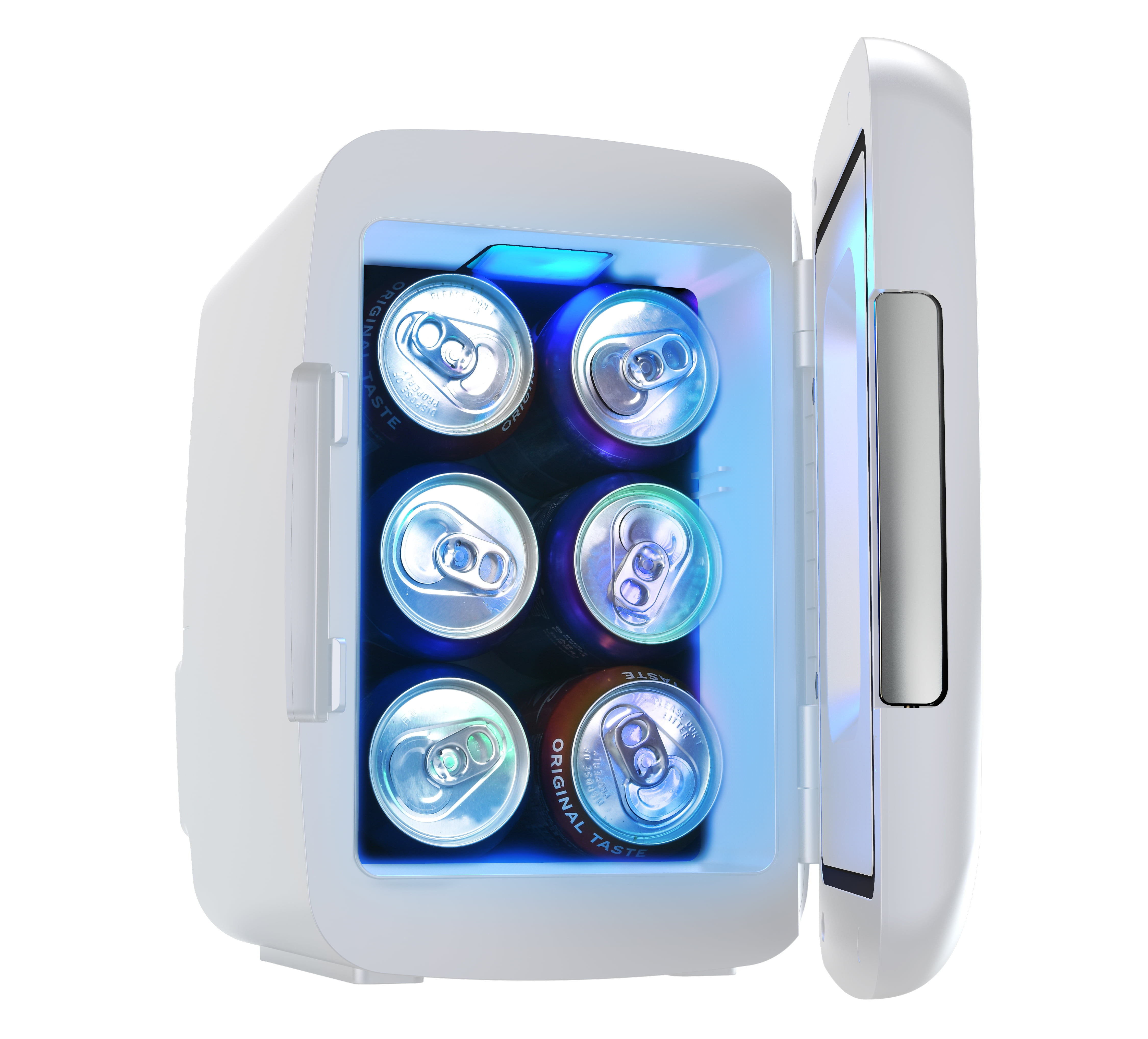 Enhance your Gaming experience and keep beverages and snacks close so you can play uninterrupted Cool LED colored lighting inside Large see-through fridge door Holds 6 cans or 4 liters Convenient shelf inside to store items Compact Portable Design with top handle Heavy duty locking latch and door hinge Easy to clean interior, fully insulated Powered by 110V (AC) wall outlet Thermoelectric Cooling System Quiet, safe from vibration and efficient Plugs into 12V car adapter or home outlet. Both cords included. Our mini beverage fridge is engineered to chill beverages 26-28°F below the ambient temperature. However, the extent of cooling achieved may vary based on the surrounding environment.
