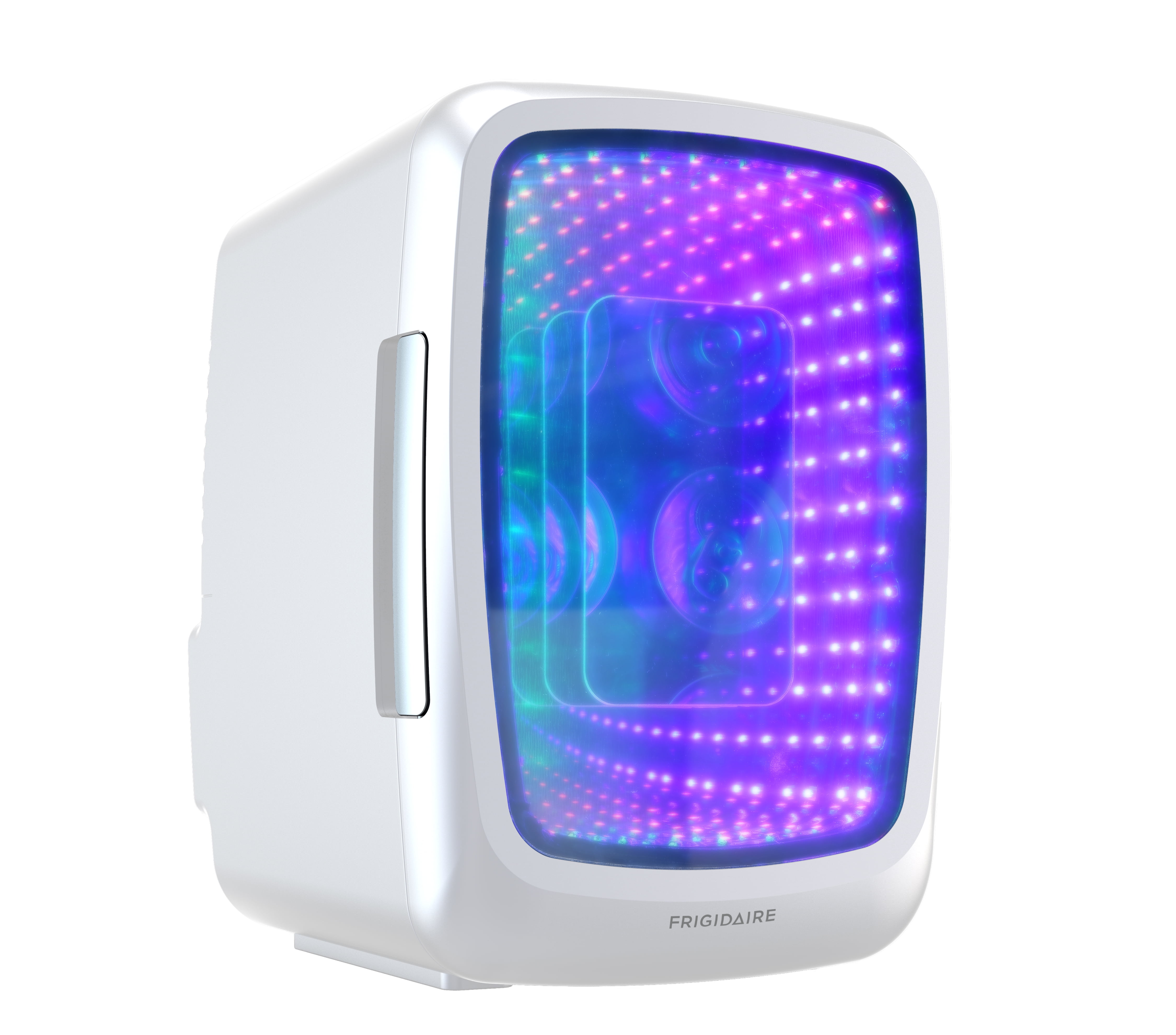 Add convenience and color to your space with the White Frigidaire Portable 6-Can LED Light-up Mini Fridge. This compact refrigerator keeps drinks, snacks, small meals, and skin care products cold and has a retro-inspired design that infuses a little fun into everyday life with its LED lights. The mini fridge uses thermoelectric cooling, not freon, to cool its interior about 28°F to 30°F below ambient room temperature, depending on the environment. And it’s portable, thanks to the convenient top handle. Plug it into your wall outlet or into your car’s 12-volt accessory port! Both cords are included.