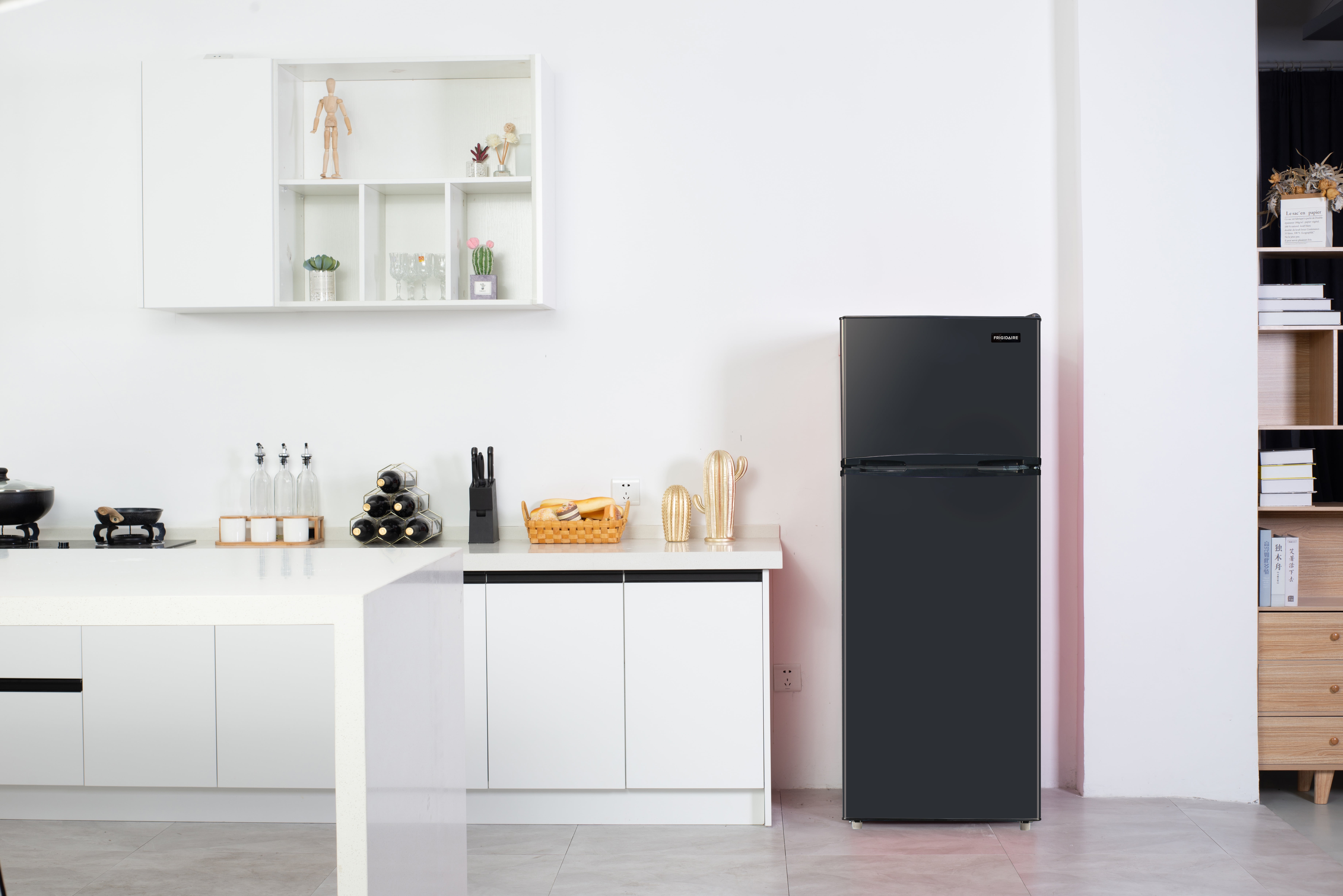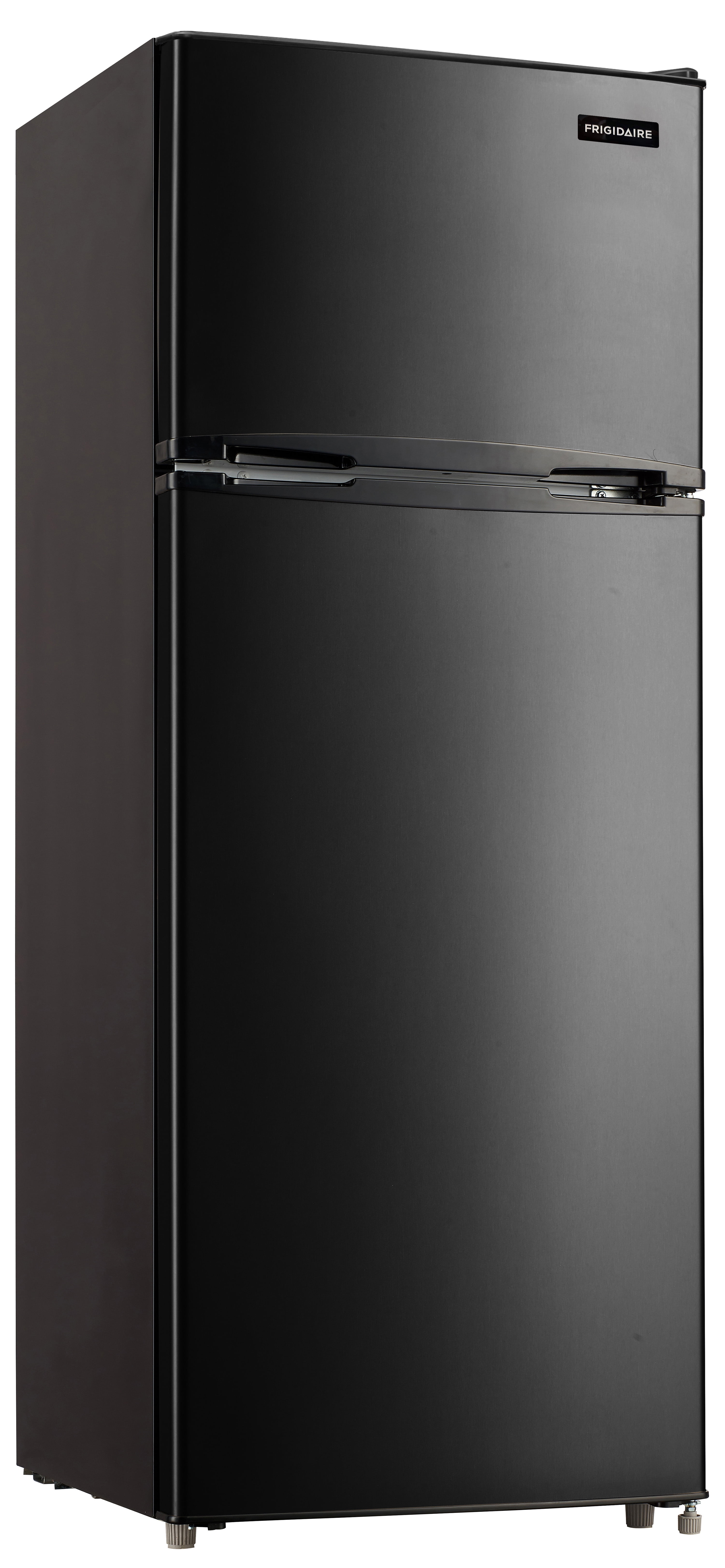 Includes a Free 30 Day Trial of Home delivery into your garage and a Free myQ Smart Garage Control. Your Frigidaire 7.5 cu. ft. Top-Freezer Refrigerator in sleek black features upfront temperature controls that make it simple to regulate both the fresh food and freezer sections. Adjustable shelves provide flexibility to meet your food storage needs. Combines easy-to-use features with practical design to complement any kitchen. Maintenance is easy with the convenient cycle defrost system and finding your favorite beverages is a breeze due to the tall bottle storage in the door. There are three adjustable glass refrigerator shelves and one adjustable/removable wire freezer shelf to provide maximum and versatile storage space. Your vegetables will stay cool and easy to find in the glass cover crisper. Left or right-handed opening is your choice with the reversible door hinge and this sturdy refrigerator can be installed against a wall with its smooth back design.