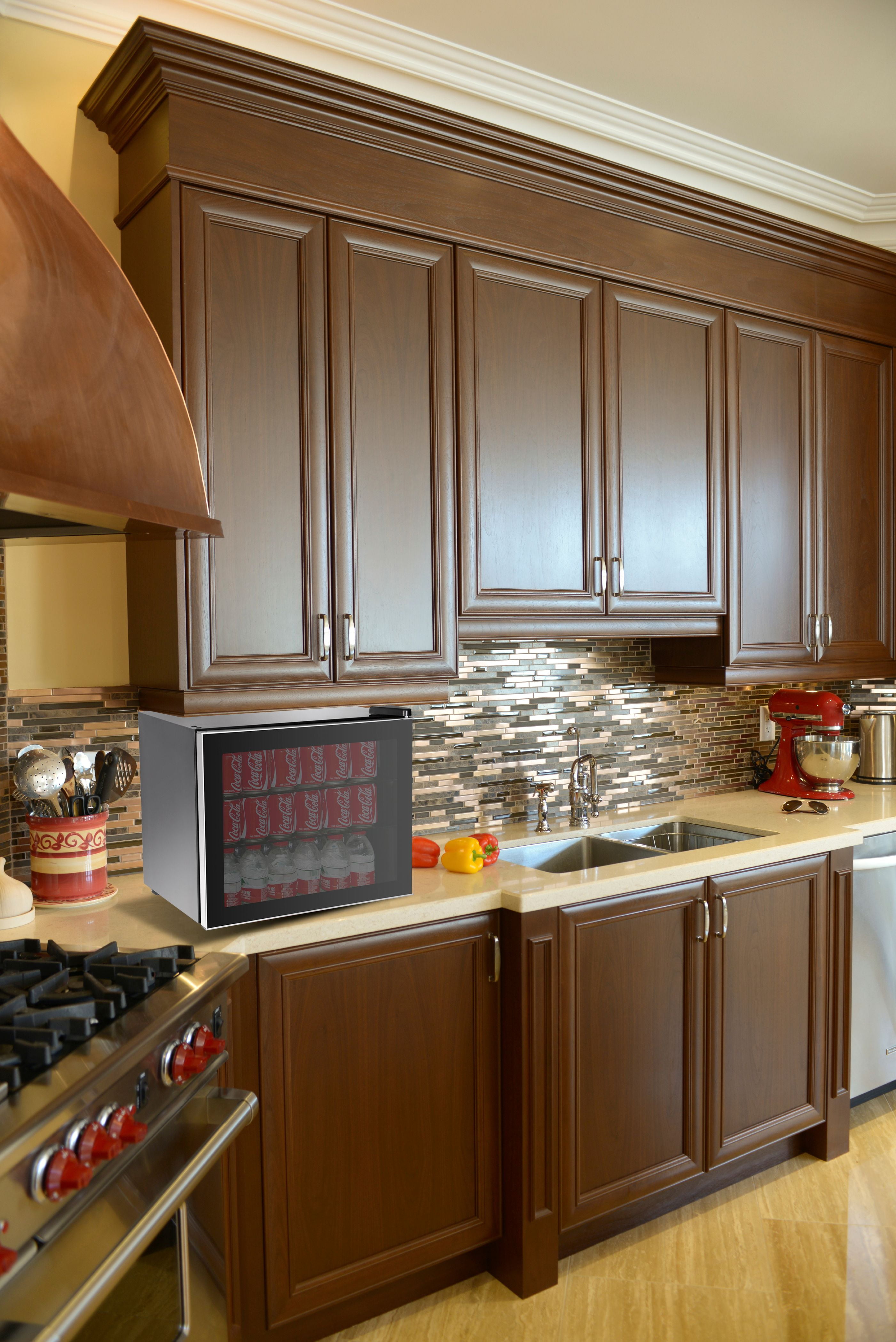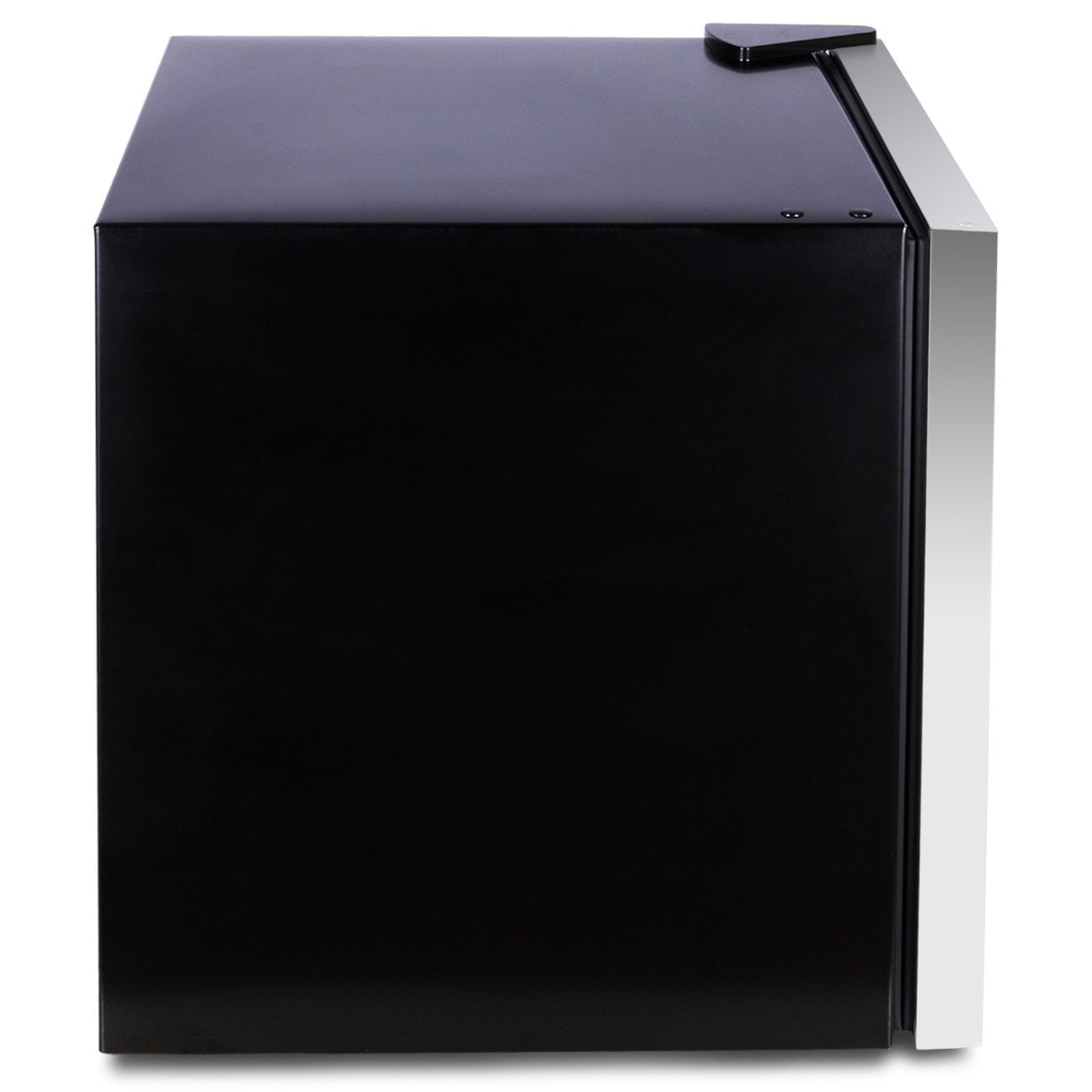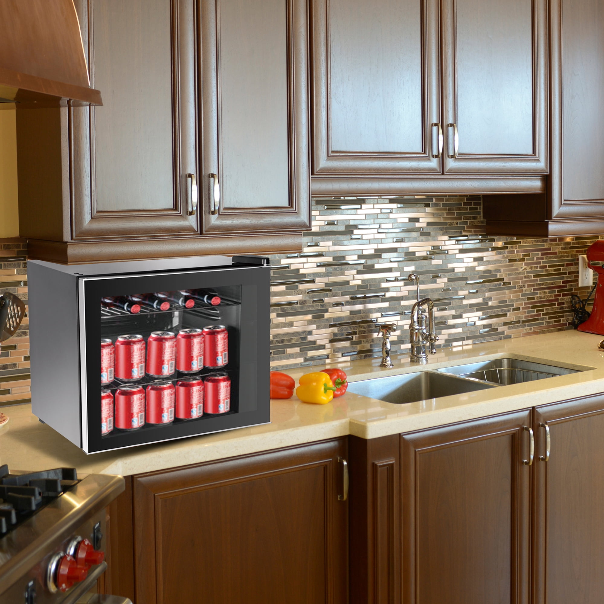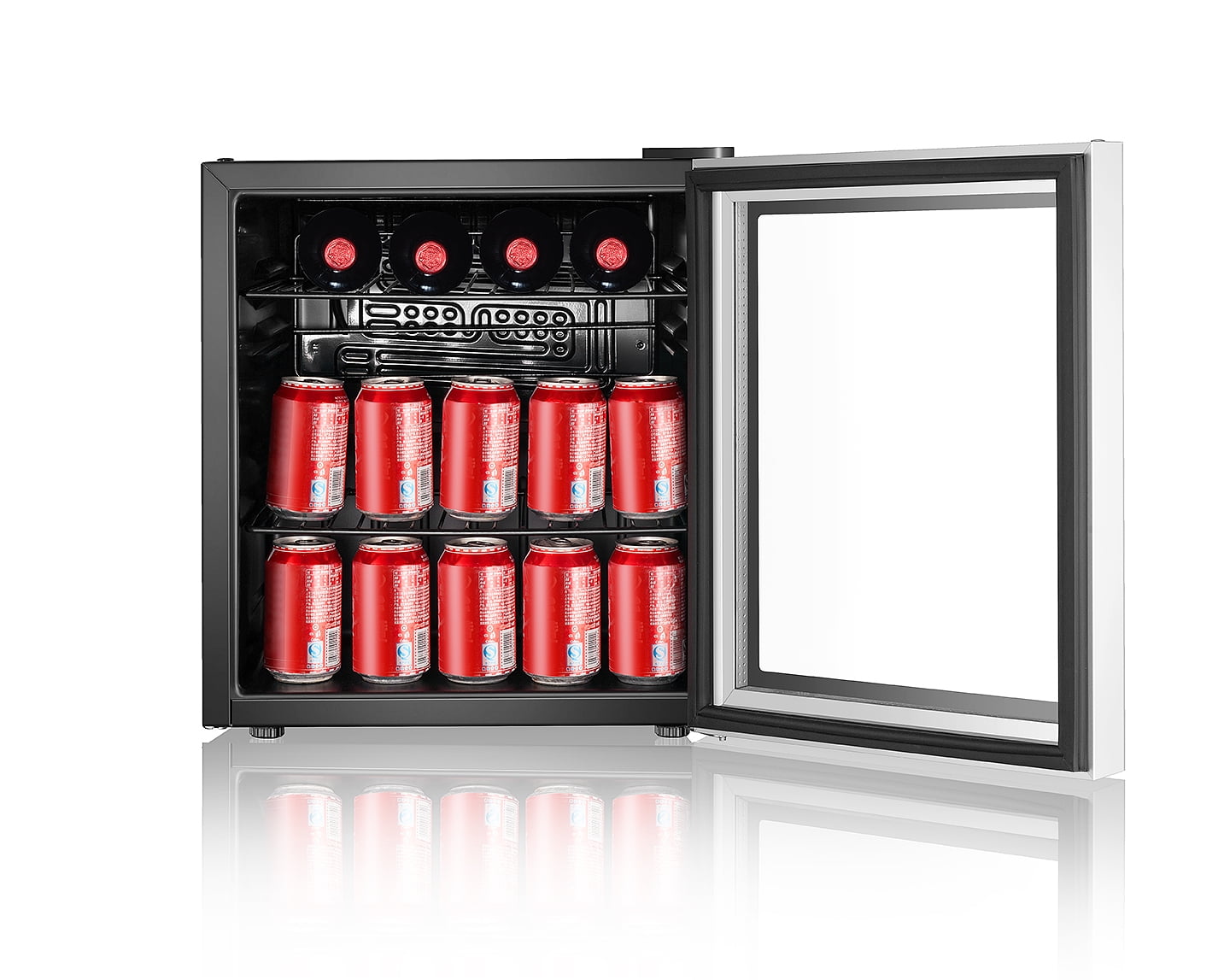 Holds 70 cans or 17 bottles and is also ideal for food items as well Total capacity is 1.6 cu. ft. Equipped with mechanical temperature controls and adjustable thermostat This compact refrigerator and beverage cooler uses compressor cooling Cooling range is a low of 39.2°F to 60.8°F Rated input is 75-Watt An attractive front glass door with silver trim will compliment any decor nicely A recessed handle adds to the attractive sleek modern style Reversible door with magnetic seal adds to the functionality of this refrigerator Adjustable feet ensures that your unit is always level even when your surface may not be Black cabinet and interior 2 adjustable full width vinyl-coated wire shelves