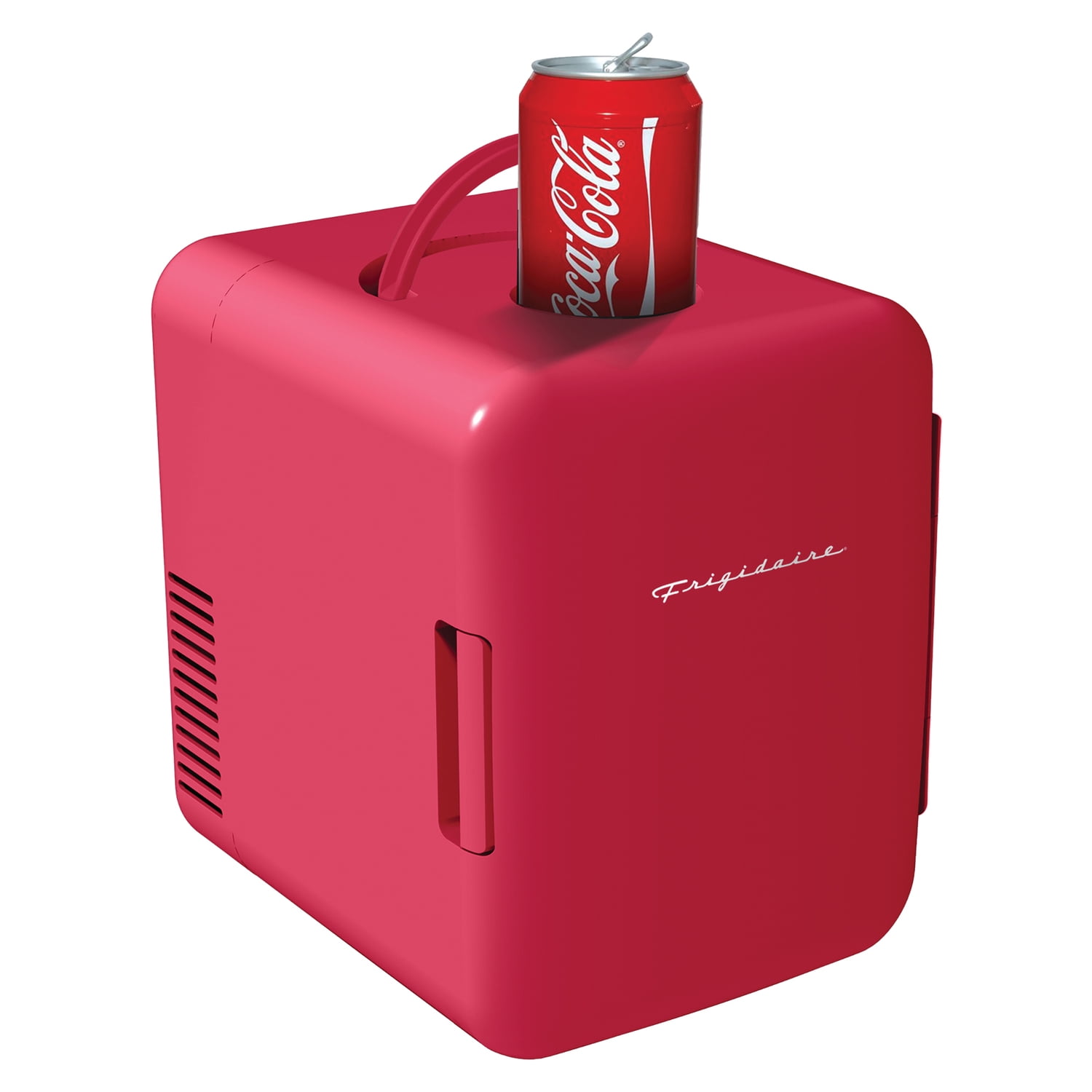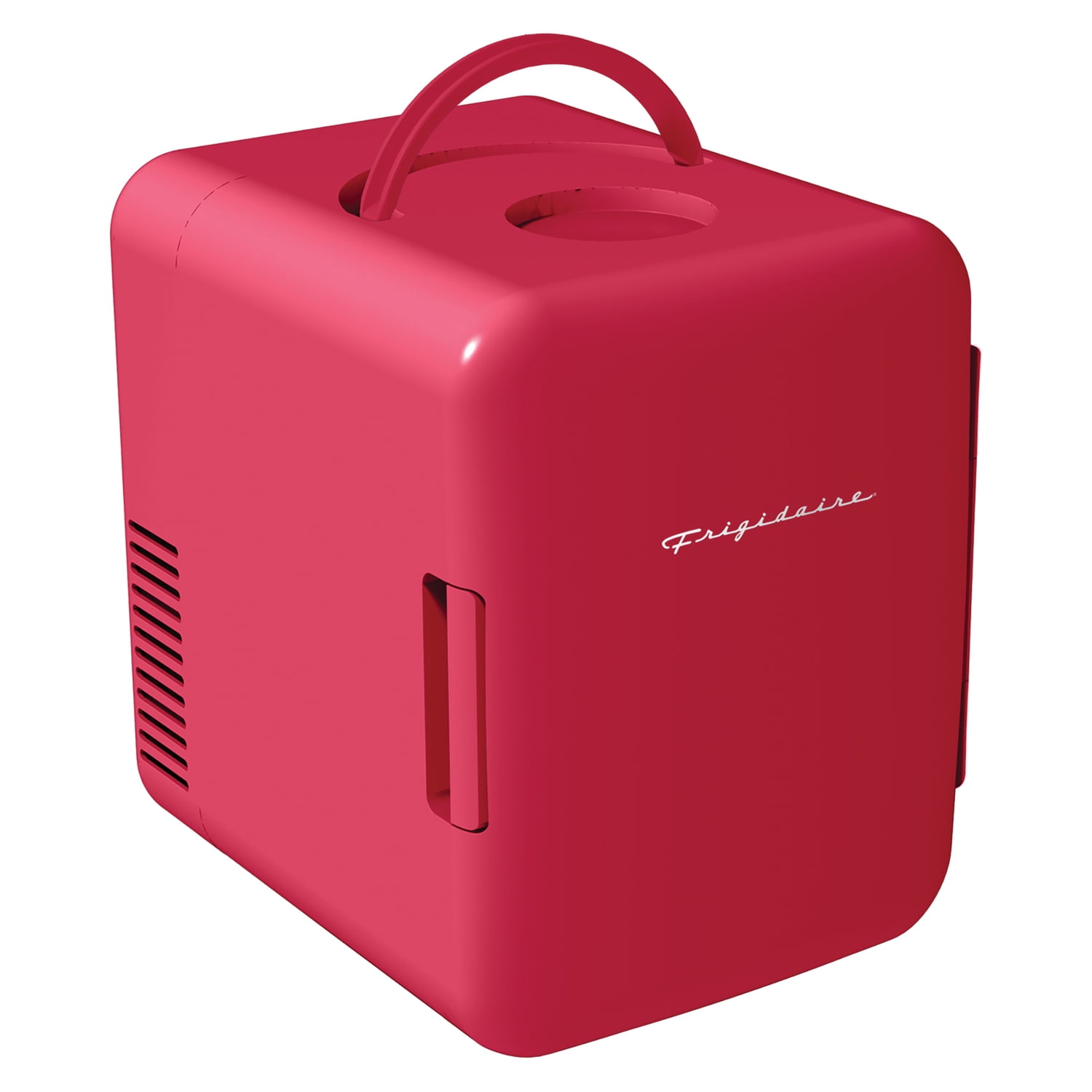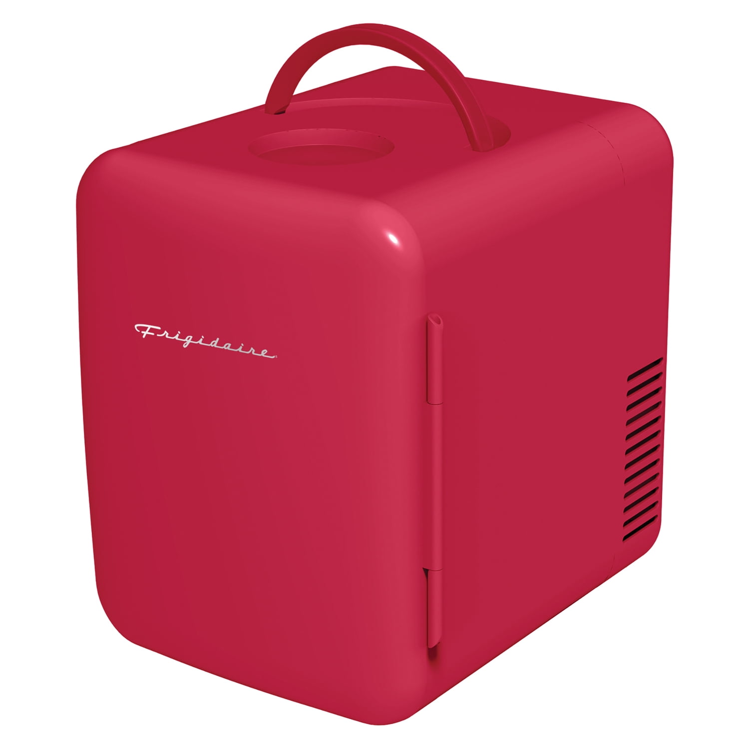 The Red Frigidaire Portable Personal Fridge keeps your food and drinks the ideal temperature while at home and on the go. Compact space saving design and lightweight features make it easy to take with you anywhere, yet can still fit your needs. The 4.26 qt. (4 L) capacity chills six 12-oz. cans, while a removable shelf makes it easy to store milk, juice, yogurt, bottles, smoothies, cheese, fruit, coffee, soup, and many more home-cooked meals or beverages. It is ideal for personal spaces, bedrooms, offices, hotels, boats, carpools, soccer games, sporting events, backyard BBQ, pool parties, and more! Plus it conveniently plugs into standard home outlets and 12-volt car ports so you can take it with you anywhere you go. It is 100% Freon-free and and cETL-approved with advanced safety technology for long-lasting durability.
