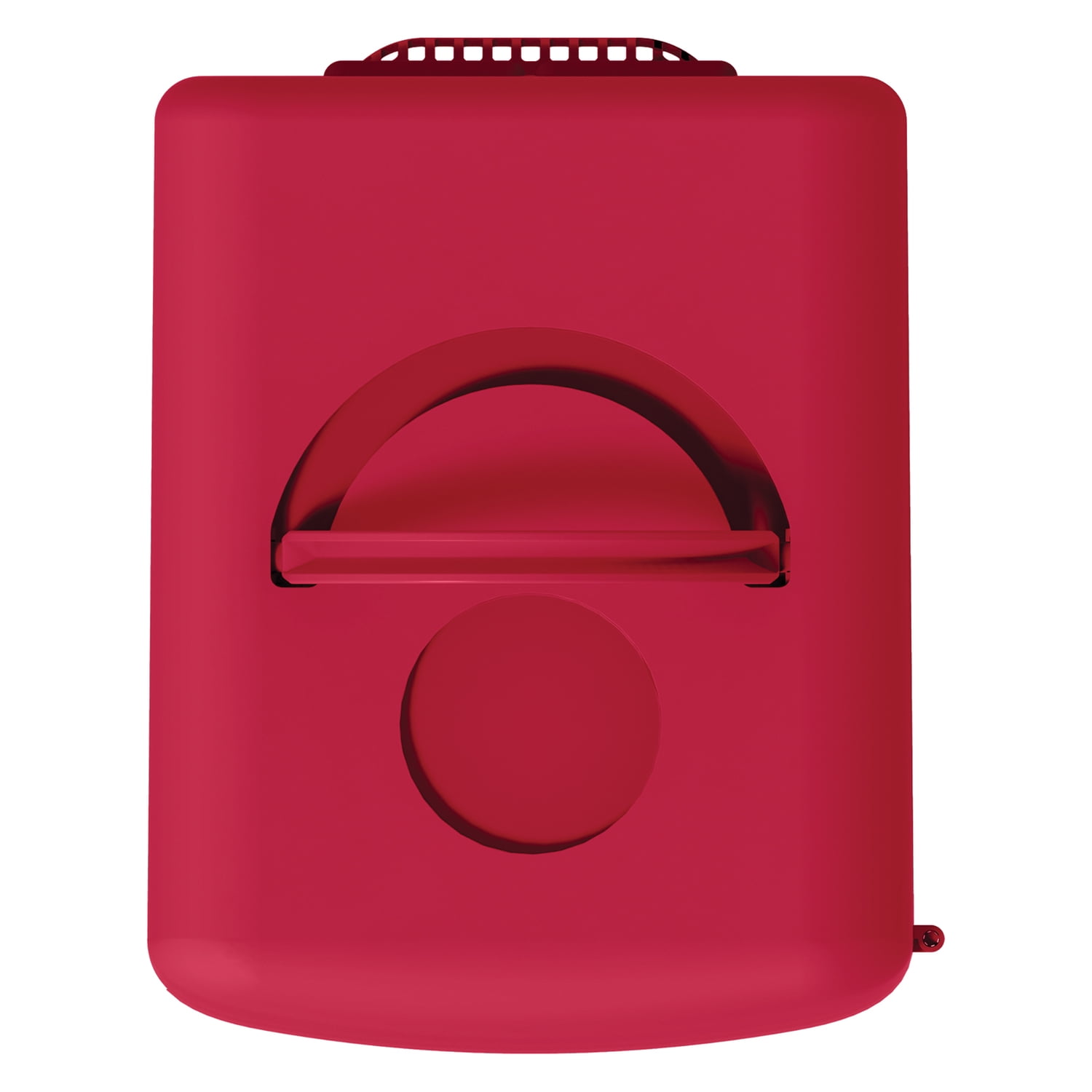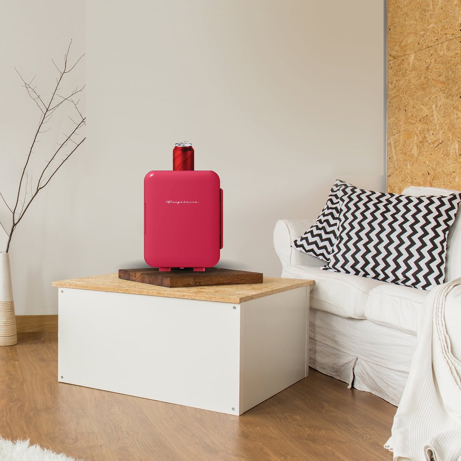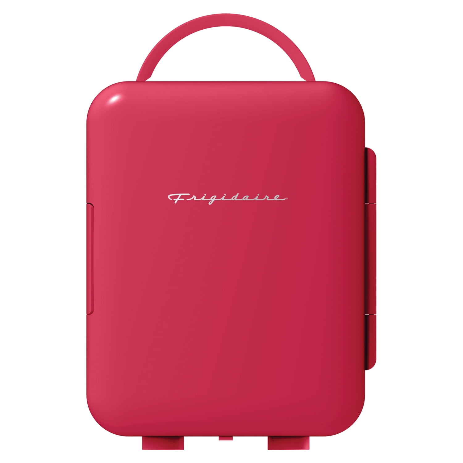 The Red Frigidaire Portable Personal Fridge keeps your food and drinks the ideal temperature while at home and on the go. Compact space saving design and lightweight features make it easy to take with you anywhere, yet can still fit your needs. The 4.26 qt. (4 L) capacity chills six 12-oz. cans, while a removable shelf makes it easy to store milk, juice, yogurt, bottles, smoothies, cheese, fruit, coffee, soup, and many more home-cooked meals or beverages. It is ideal for personal spaces, bedrooms, offices, hotels, boats, carpools, soccer games, sporting events, backyard BBQ, pool parties, and more! Plus it conveniently plugs into standard home outlets and 12-volt car ports so you can take it with you anywhere you go. It is 100% Freon-free and and cETL-approved with advanced safety technology for long-lasting durability.