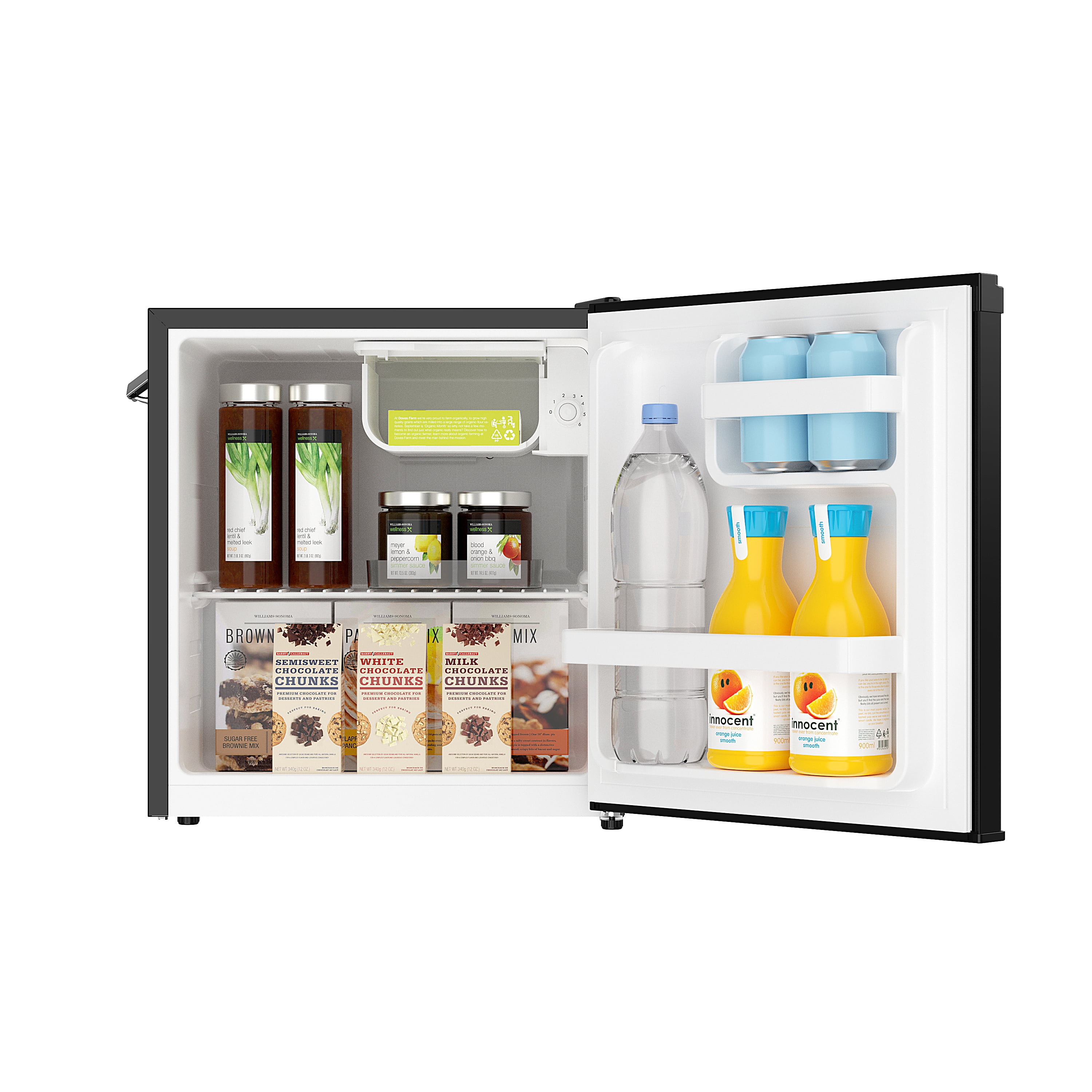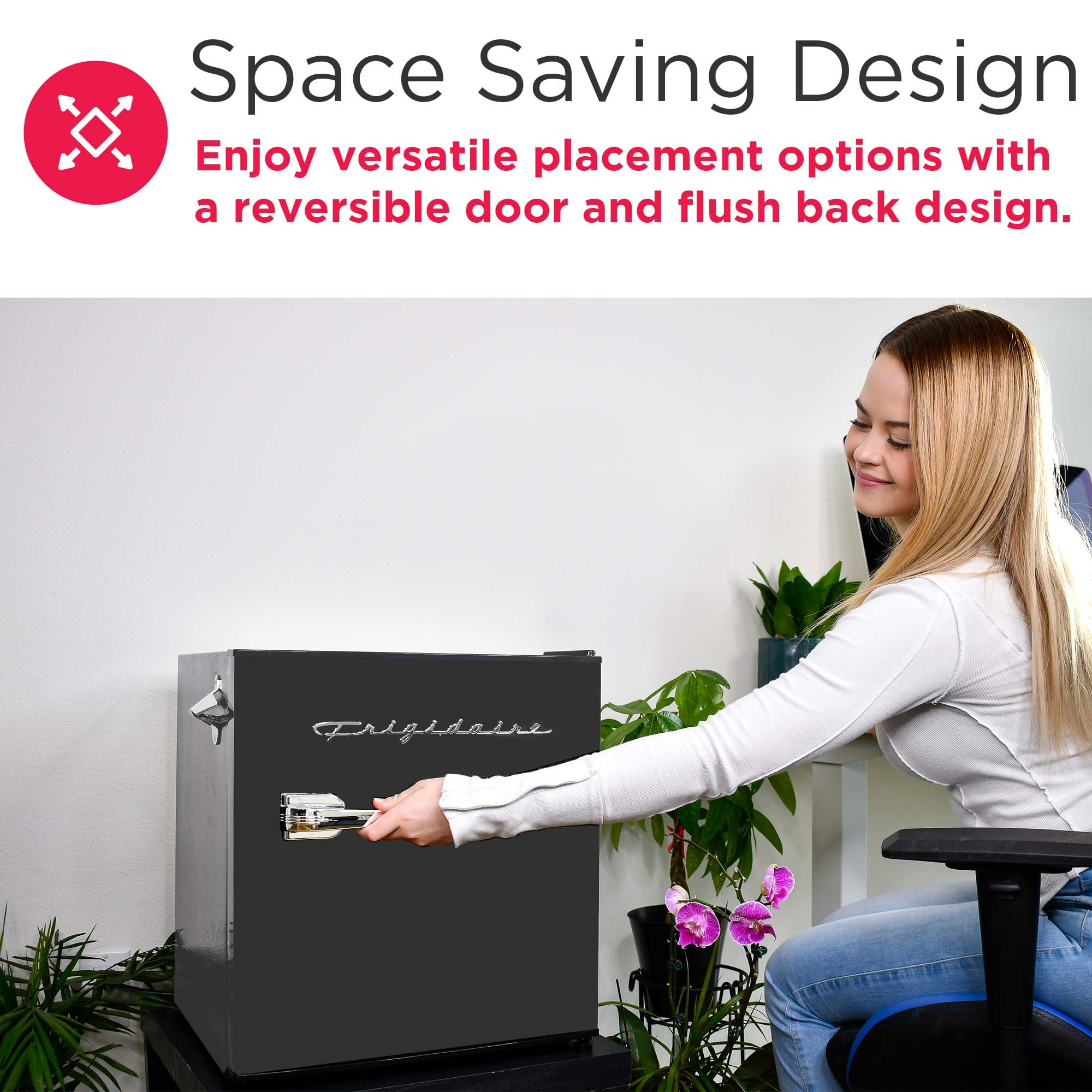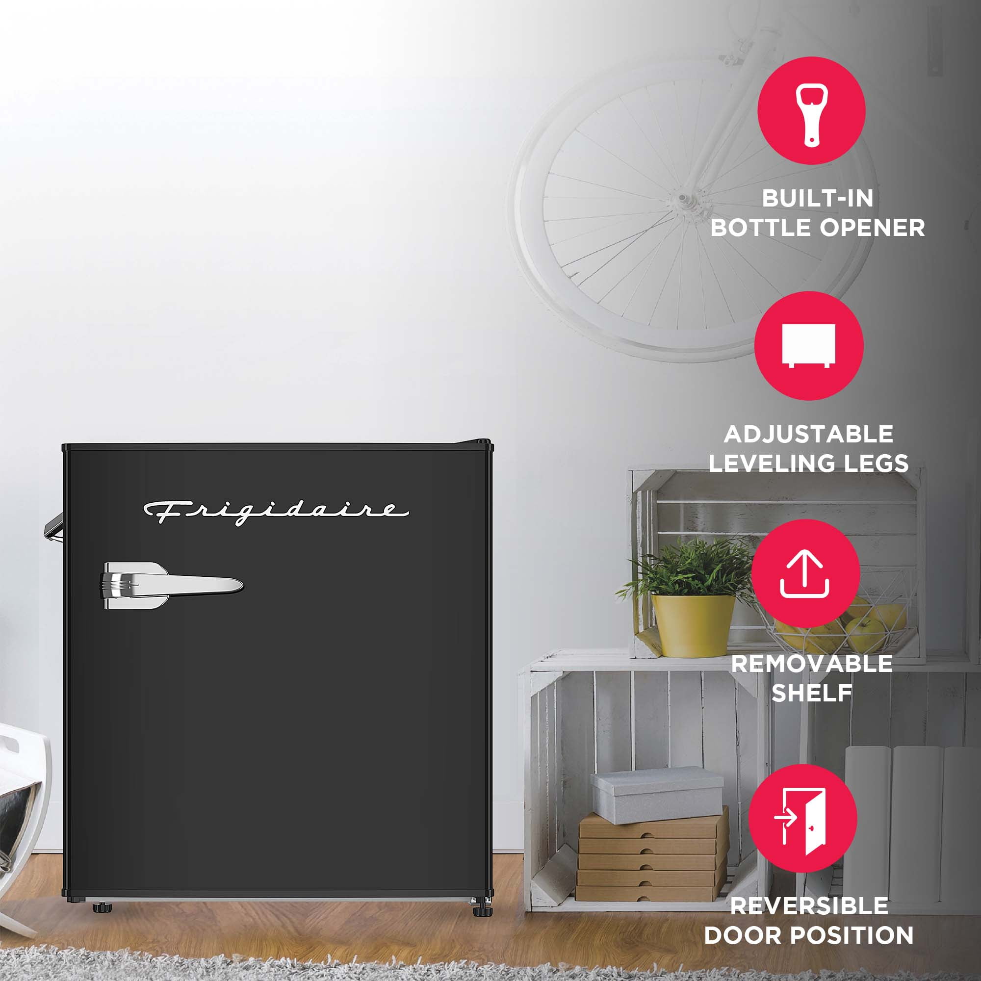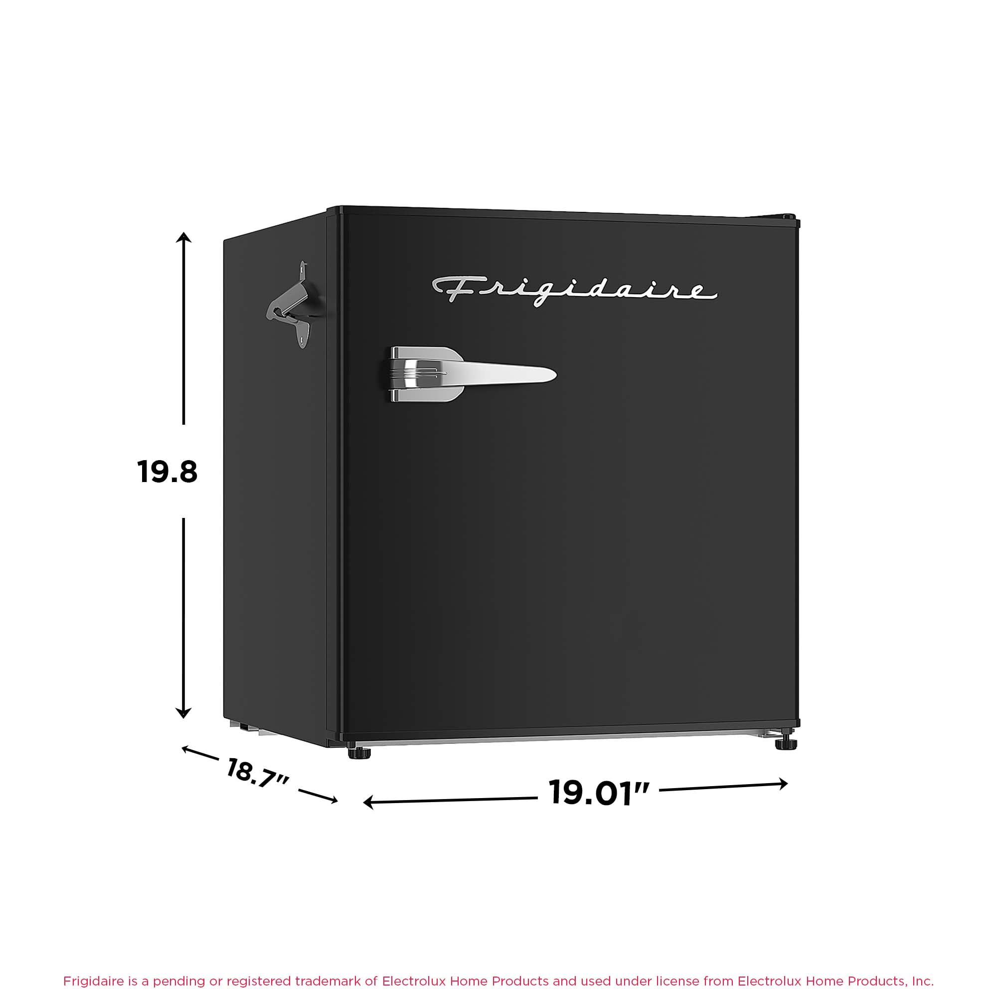 Introducing the brand-new Frigidaire 1.6 cu ft Retro Mini Fridge in sleek black. This refrigerator showcases a retro design with modern functionality. Boasting a compact size, it offers ample storage for your favorite foods and beverages without monopolizing space. The reversible door features a convenient basket, accommodating two-liter bottles and canned beverages. Experience effortless bottle opening with the integrated side bottle opener, eliminating the need to search through cluttered drawers. Designed for efficiency, this refrigerator boasts low energy consumption, making it an ideal addition to offices or secondary rooms. Its space-saving flush back design enhances its suitability for areas beyond the kitchen. Upgrade your setup with this stylish and practical fridge from Frigidaire.