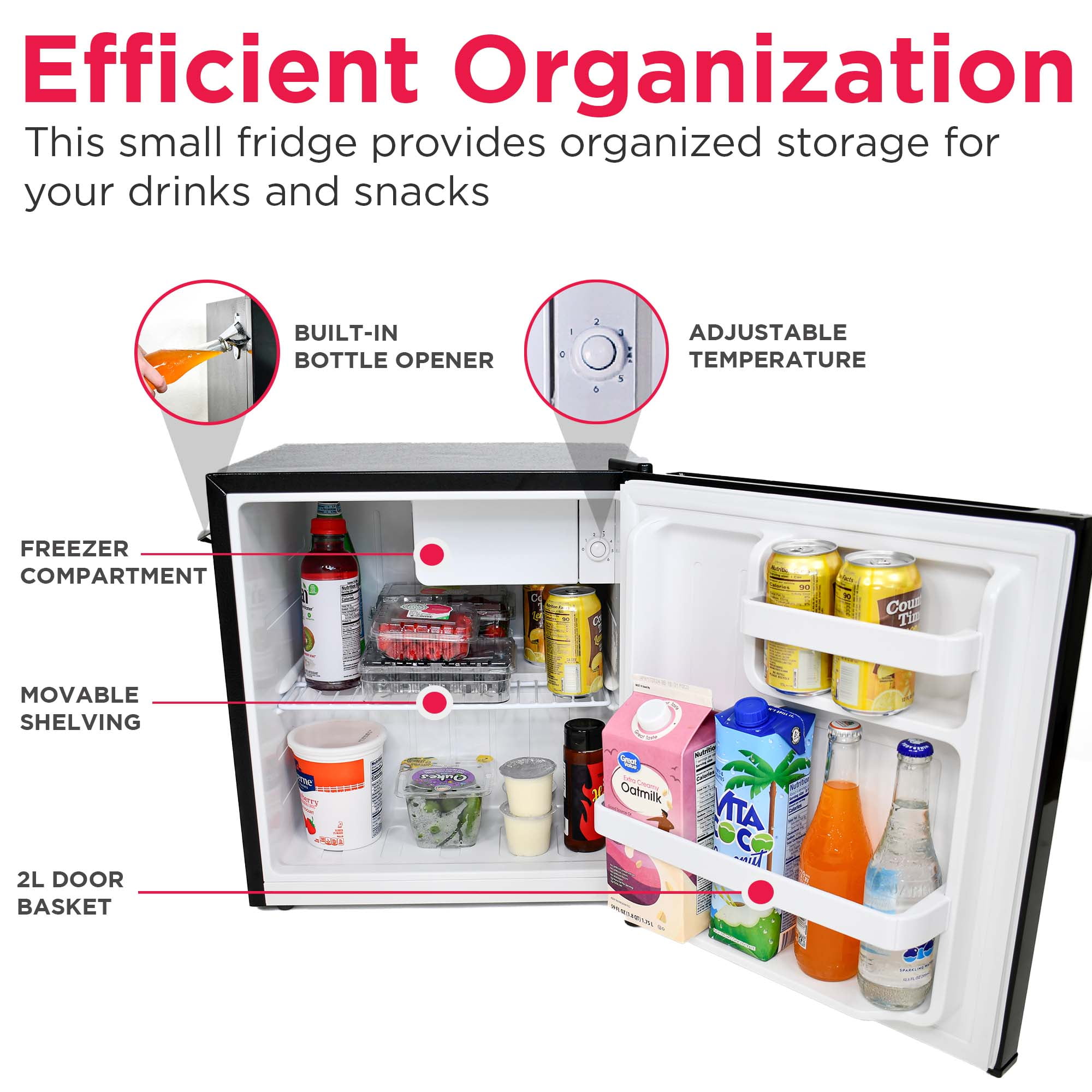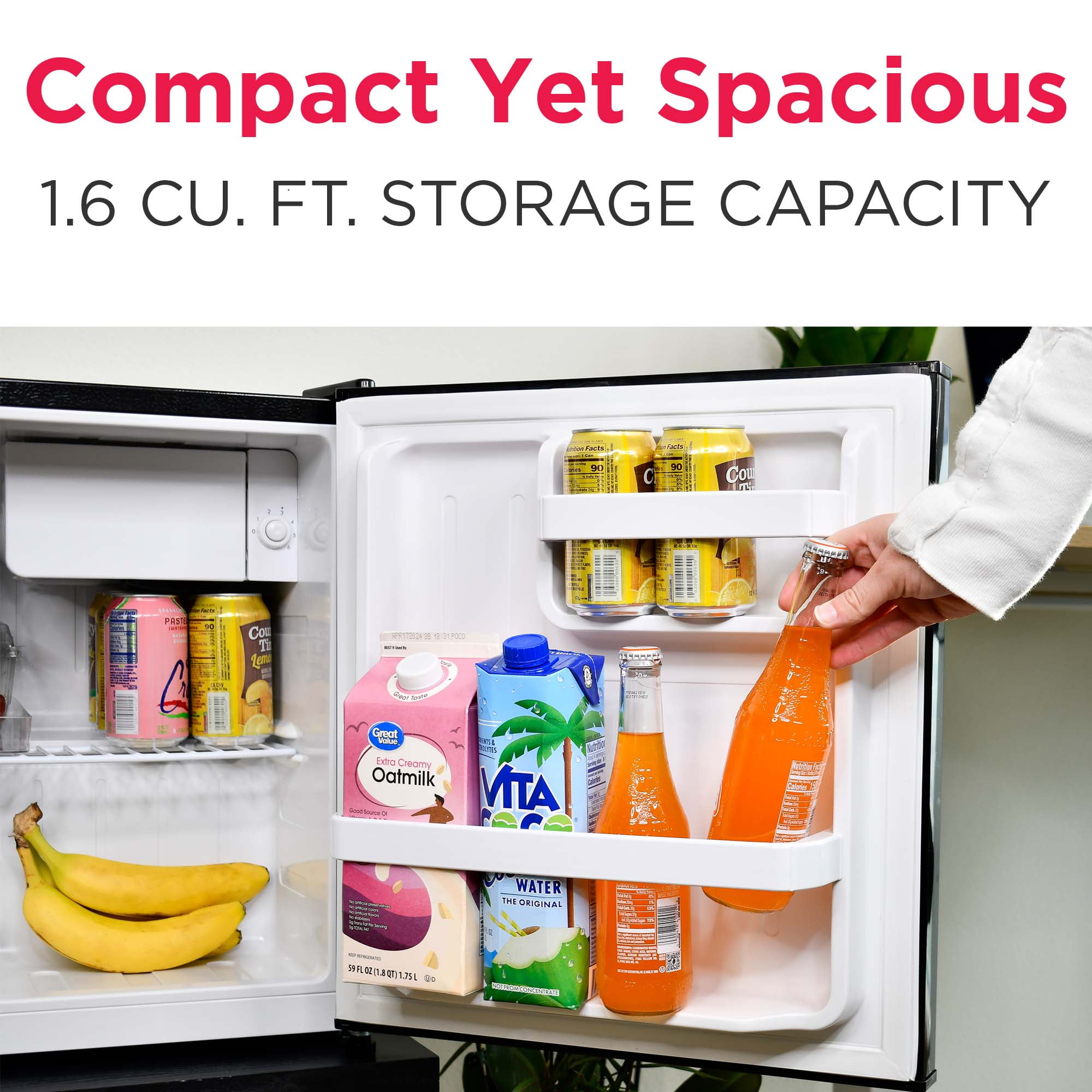 Retro Charm – Elevate your space with this sleek and stylish small retro fridge. The eye-catching design infuses retro charm into any room. Its compact size and stylish design make it a great addition to your bedroom, office, or dorm room. Spacious Design – Featuring a 1.6 cu. ft. capacity, this compact fridge offers plenty of storage for bottles, cans, snacks, and more. The space-saving flush back design allows for seamless placement against walls, making it perfect for smaller spaces. Organized Storage – Equipped with a wire shelf and 2L door basket for large bottles, this mini fridge provides ample storage for your drinks and snacks, along with a chiller compartment and ice cube tray, so you have everything you need, all in one space. Practical Style – Perfect for entertaining, this small retro fridge comes with a built-in bottle opener on the side, along with an easy-open pull handle that adds to the retro vibe and is reminiscent of classic designs from the past. Customizable Design Options- Tailor this retro fridge to suit your space and style with the reversible door feature for flexible placement options. Choose from an array of colors to add a personalized touch that complements your unique aesthetic.