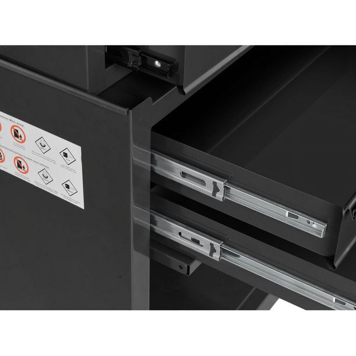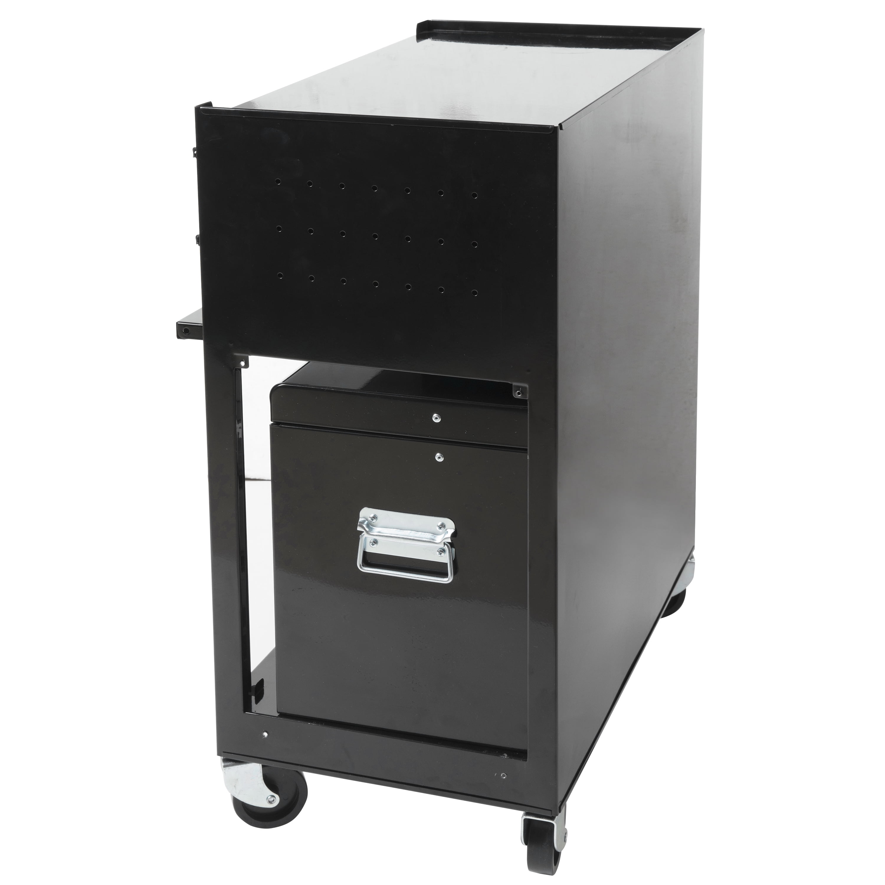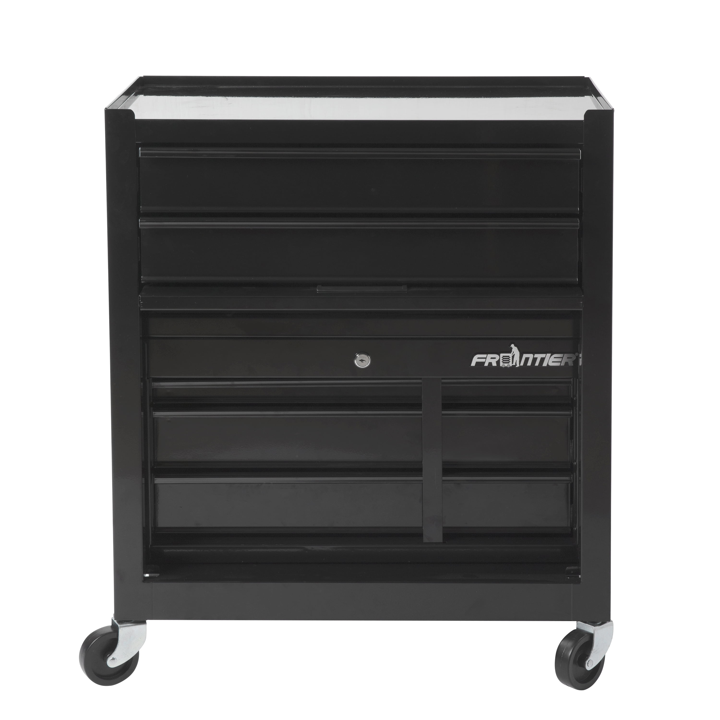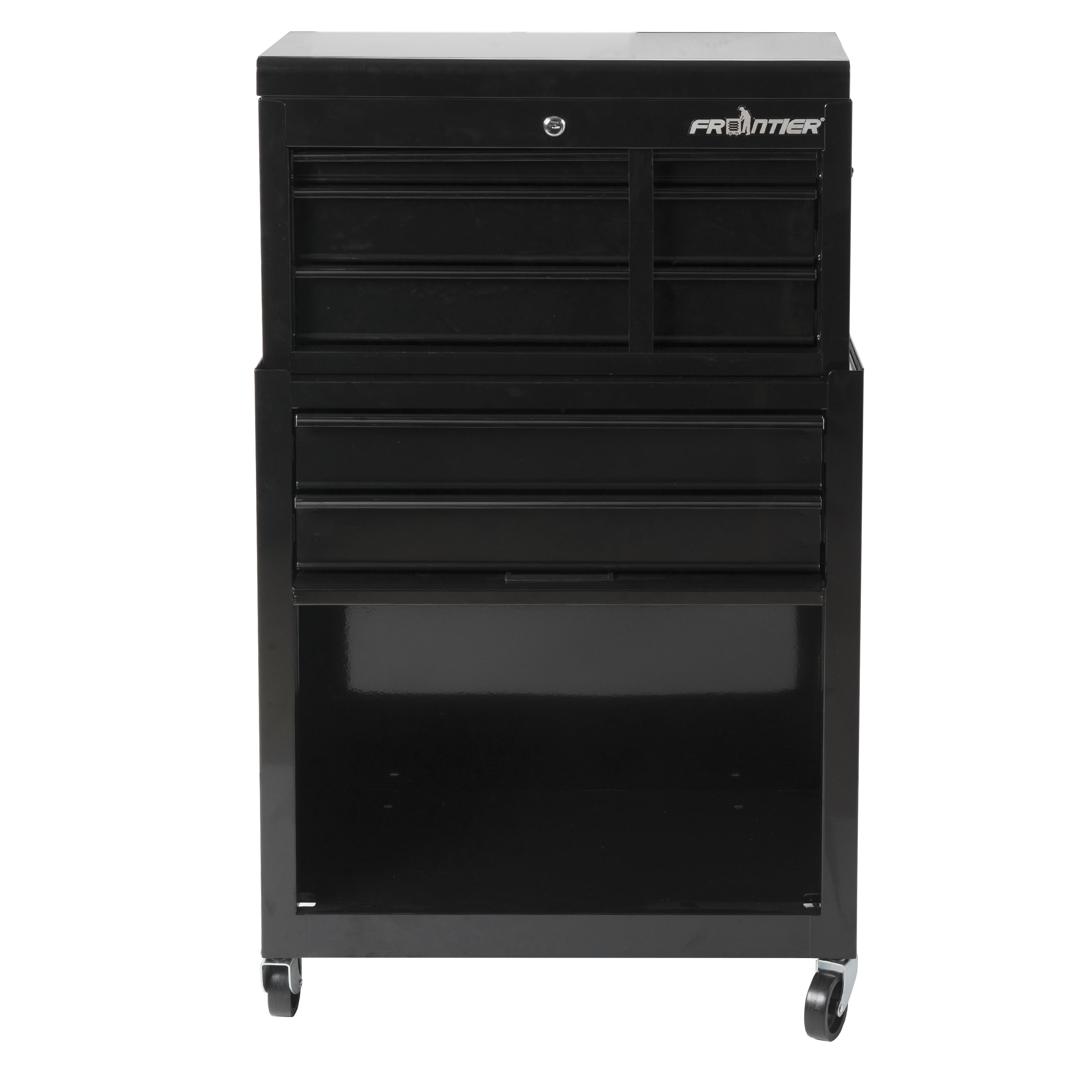 Frontier 24-inch 5 Drawer Rolling Tool Chest and Cabinet is the perfect option to store and organize your tools and equipment. The sleek black gloss finish will look great in any garage or workspace. Each of the four drawers is equipped with ball-bearing slides for smooth opening and closing operation. Each drawer can support up to 50 pounds of tools and equipment. Large tools and supplies can be tucked away in an open storage space that is covered by a fold-up panel. The top chest is fully lockable to protect your tools and belongings. Whether you work in construction or enjoy doing your own work around the house, this is a great option for keeping everything you need in one accessible, portable location.
