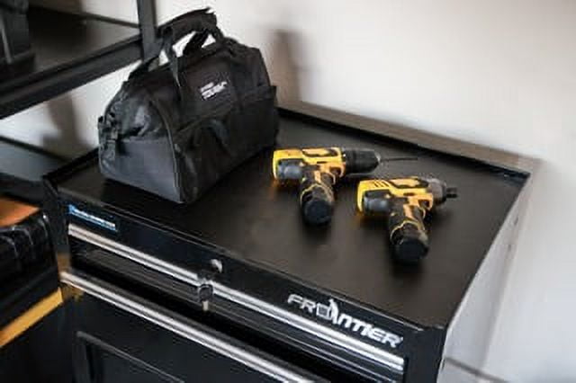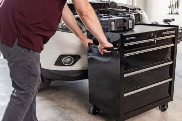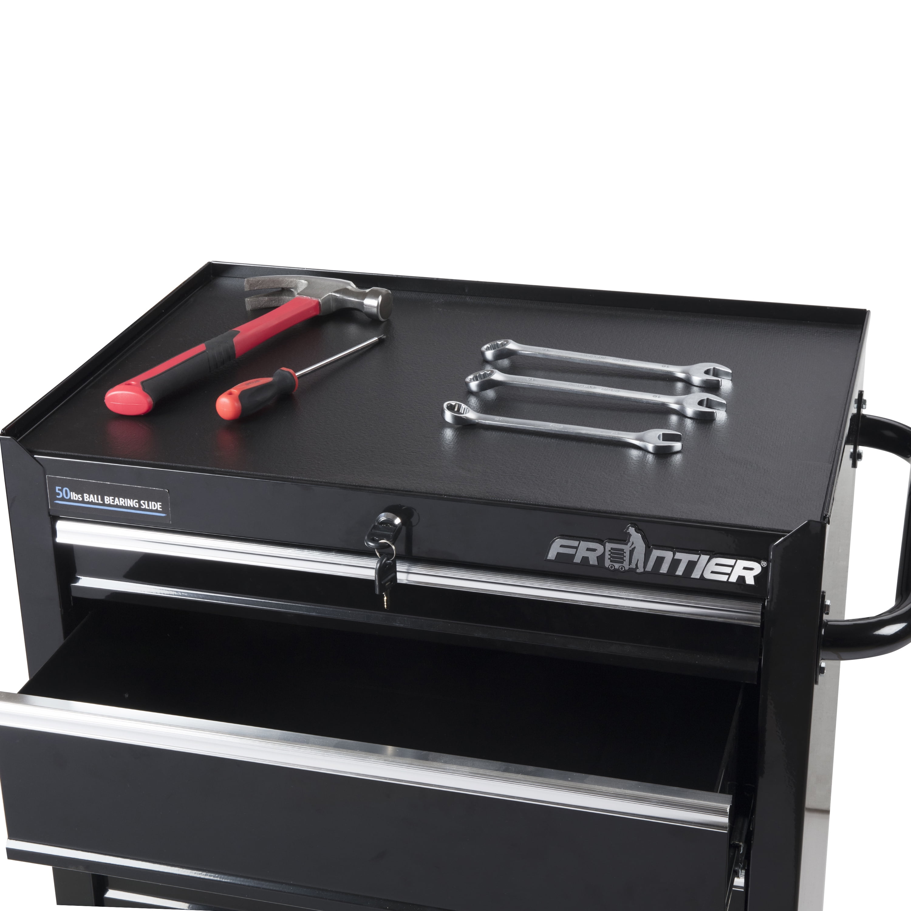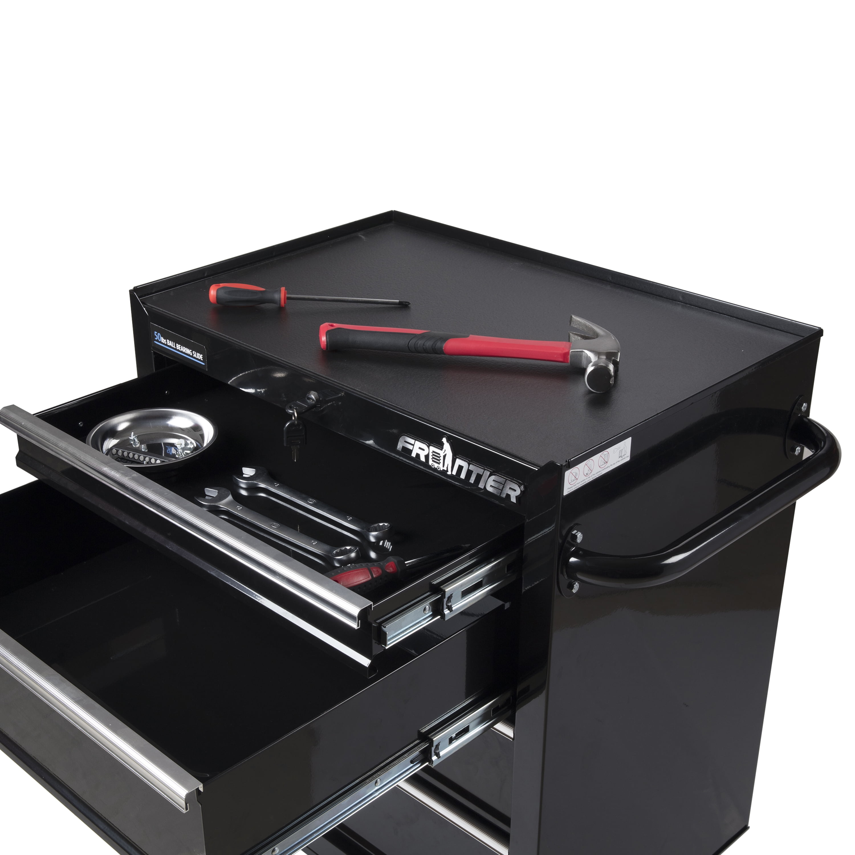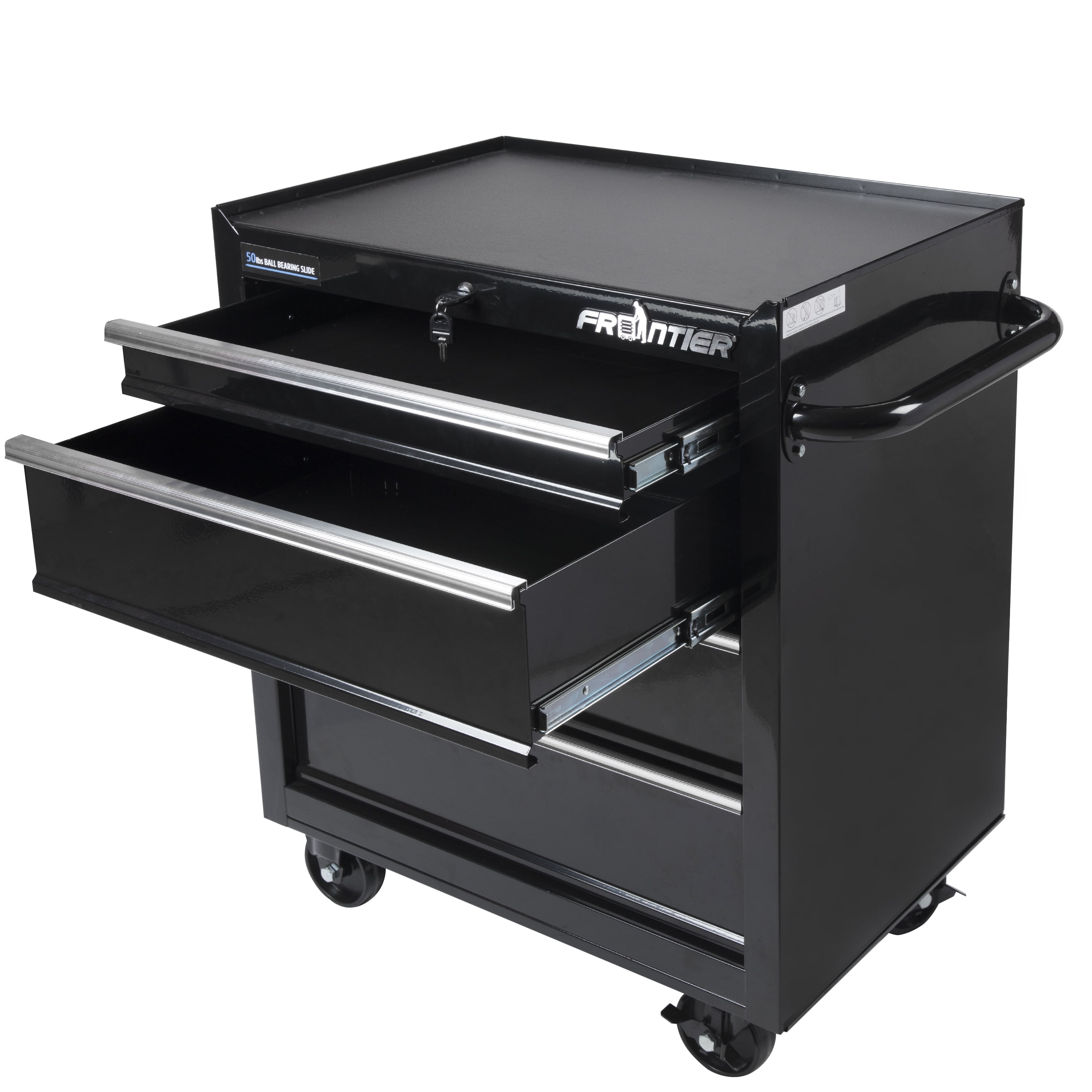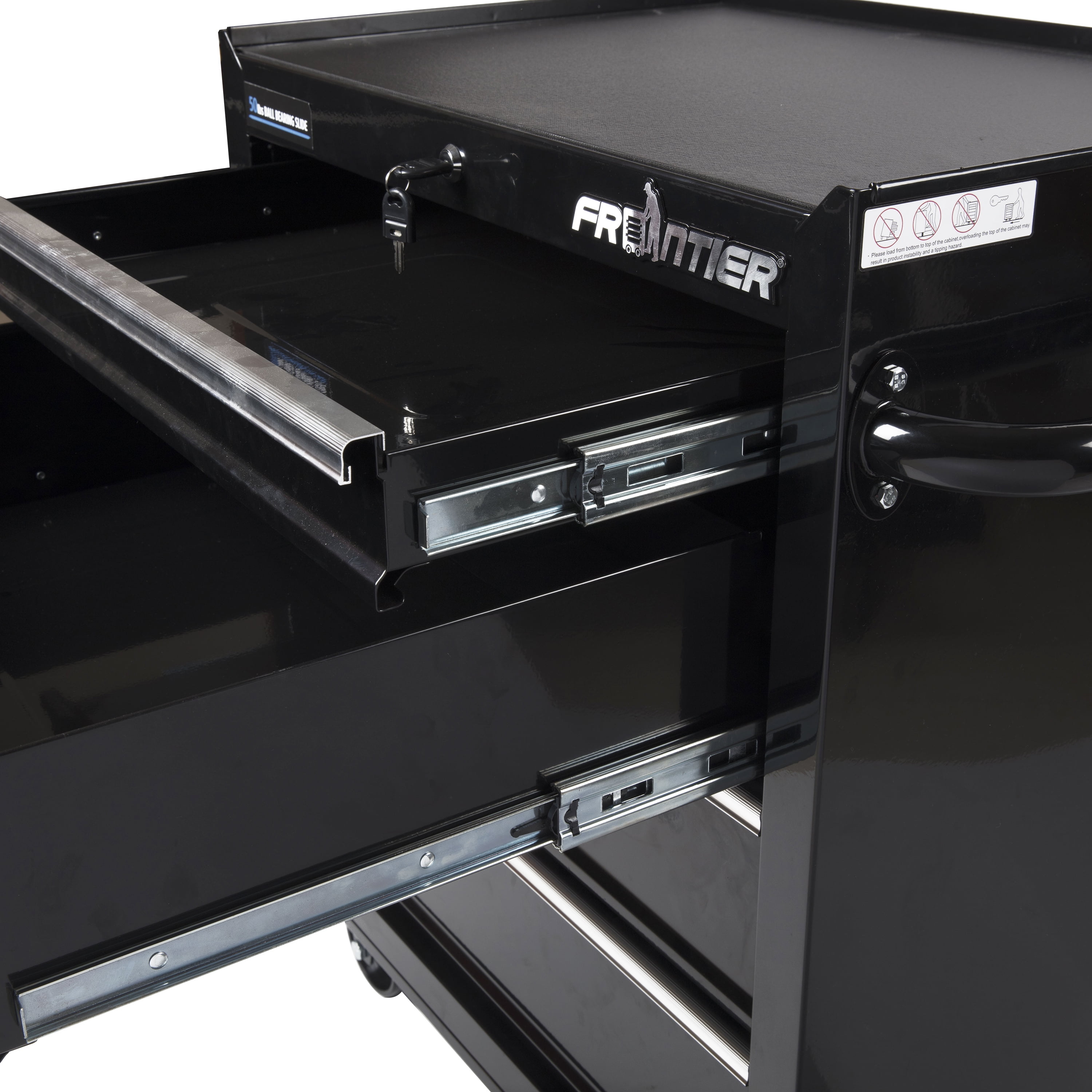 Frontier 26-inch 4-Drawer Base Cabinet Tool Chest, Metal, Black, 41112 Compatible with Frontier Top Tool Chest 26-inch Welded Metal Construction 4 Drawer Storage Space 50 Pound Capacity Ball-Bearing Drawers 650 Pound Total Weight Capacity Internal Locking System with 2 Keys Side Handle for Easy Mobility 4-inch. x 1.5-inch Casters Product Dimensions: 26.77 inches Wide x 18.31 inches Deep x 33.15 inches High