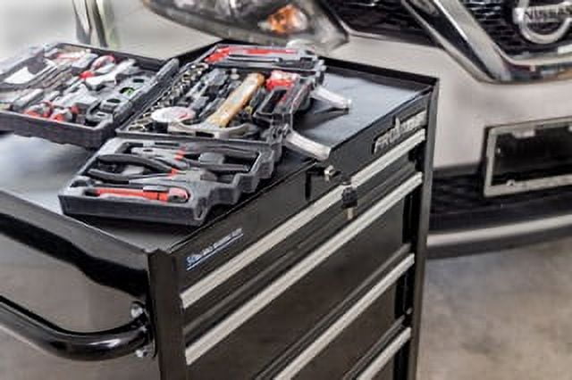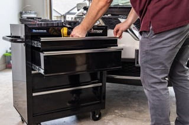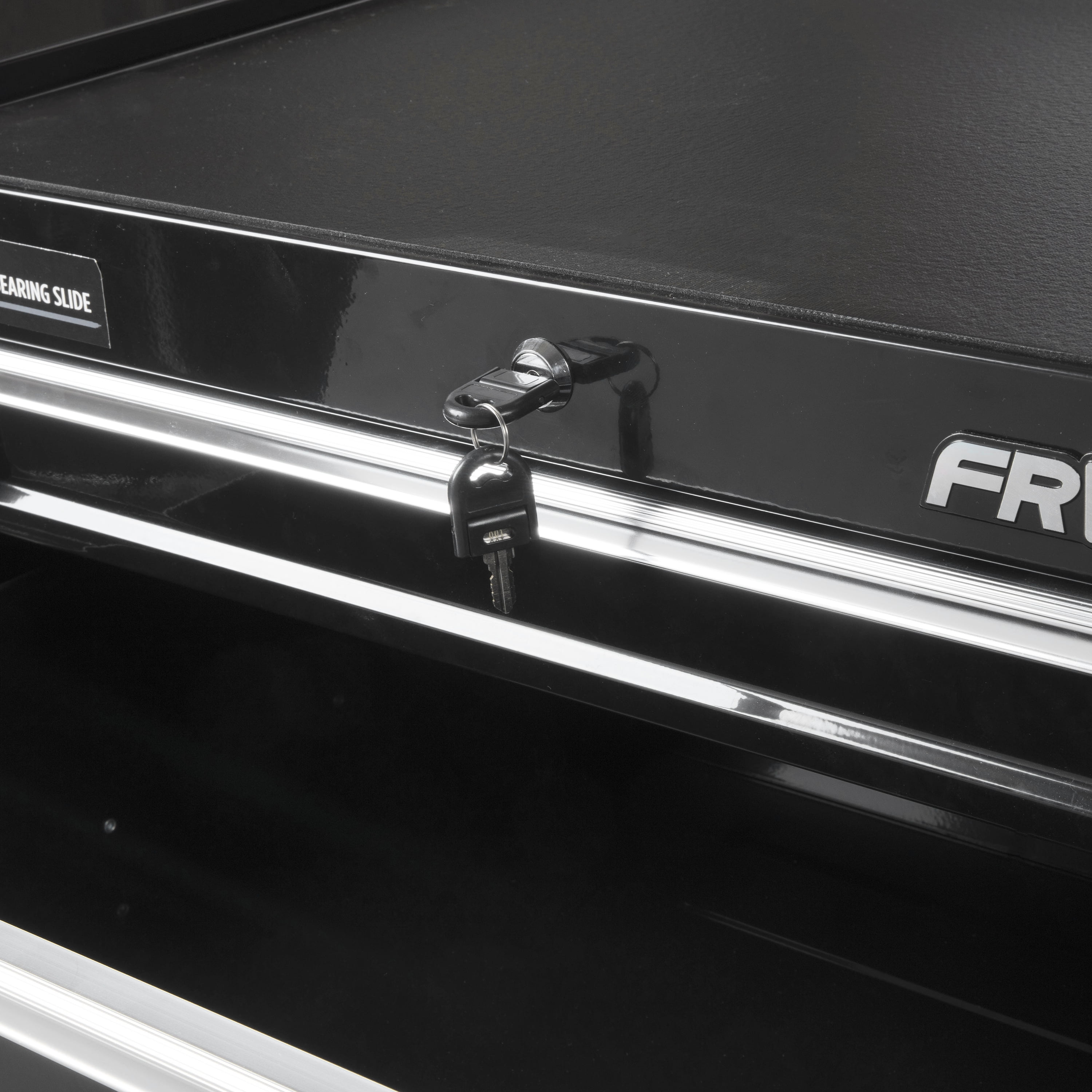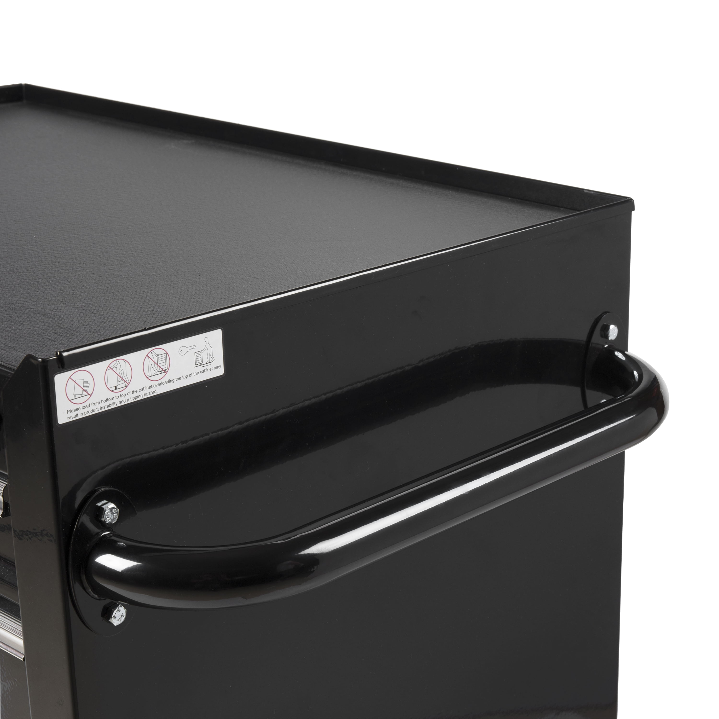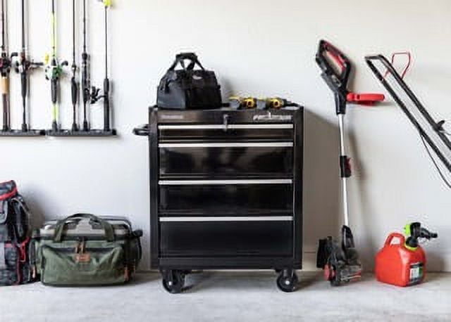 The Frontier 26-inch 4-Drawer Base Cabinet Tool Chest, Metal, Black, model 41112, is a high weight rated tool organizer that is extremely versatile. The sleek black design will look great in any garage, warehouse, and any other places where your tools are needed. The 650-pound weight rated storage chest is equipped with four 4-Inch x 1.5-Inch casters and a side handle for easy mobility. The ball-bearing drawers have a 50-pound weight capacity and feature a locking system with two keys. Also, available is the fully compatible Frontier 26-inch 4 Drawer Top Chest Steel Tool Organizer.