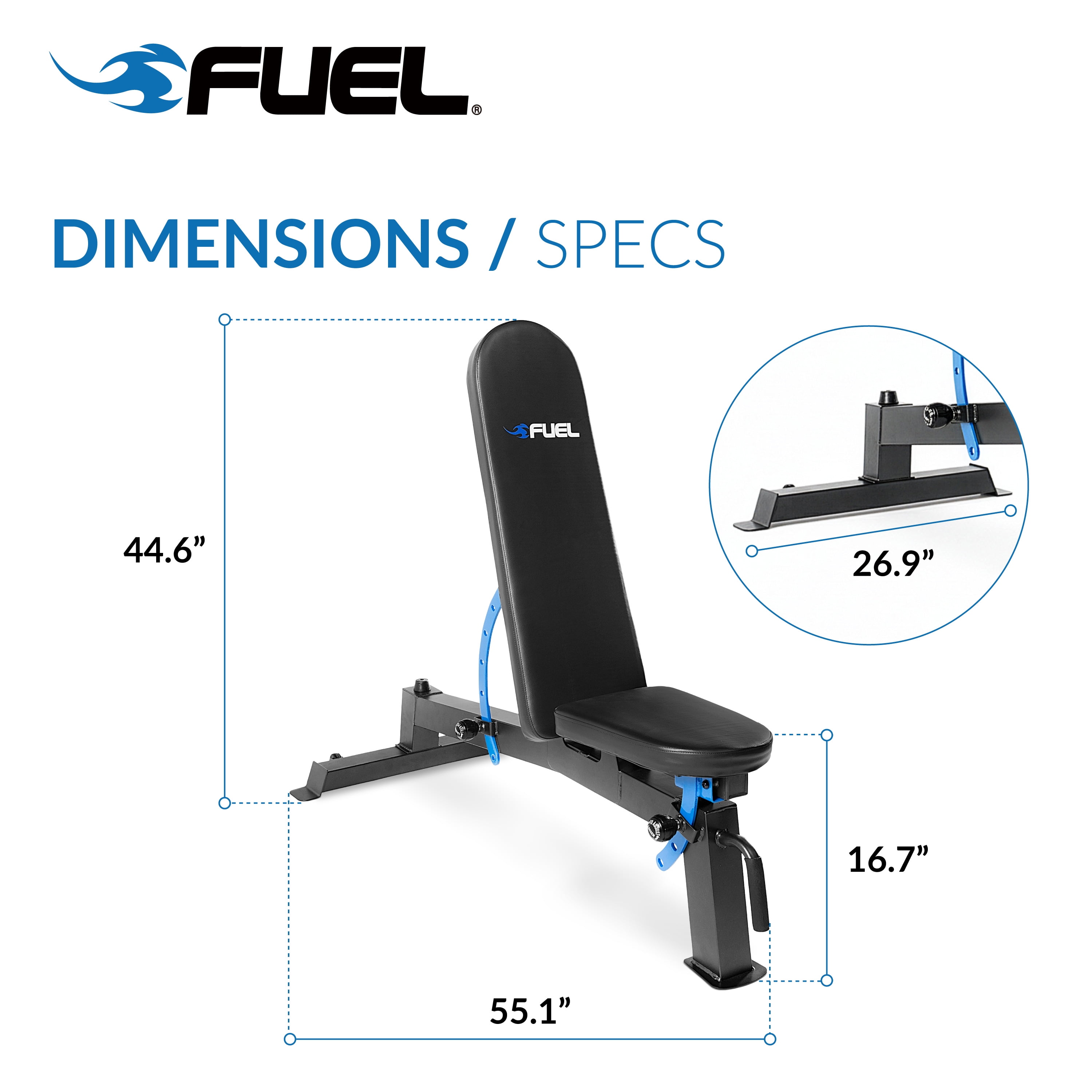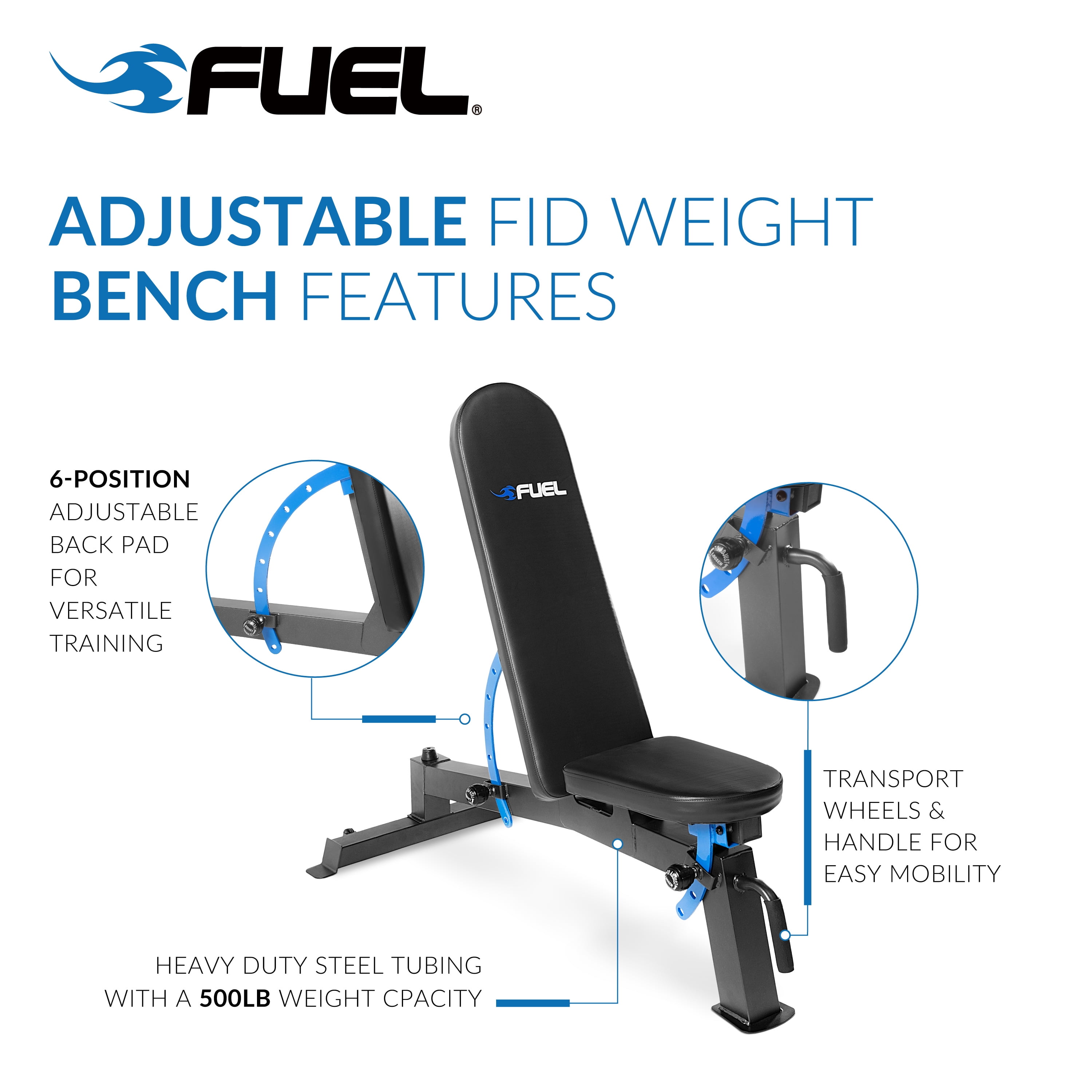 Fuel Pureformance FID Bench: 6-position back pad and 3-position seat pad offer versatility in exercises powder-finish to prevent rust Transportation wheels offer easy storage and mobility Ideal for use in home gyms Multiple positions allow you to target a wide range of muscle groups Attractive appearance with a gun metal gray base and striking blue accents Over-sized piping and generous padding Maximum weight capacity of 500-pounds