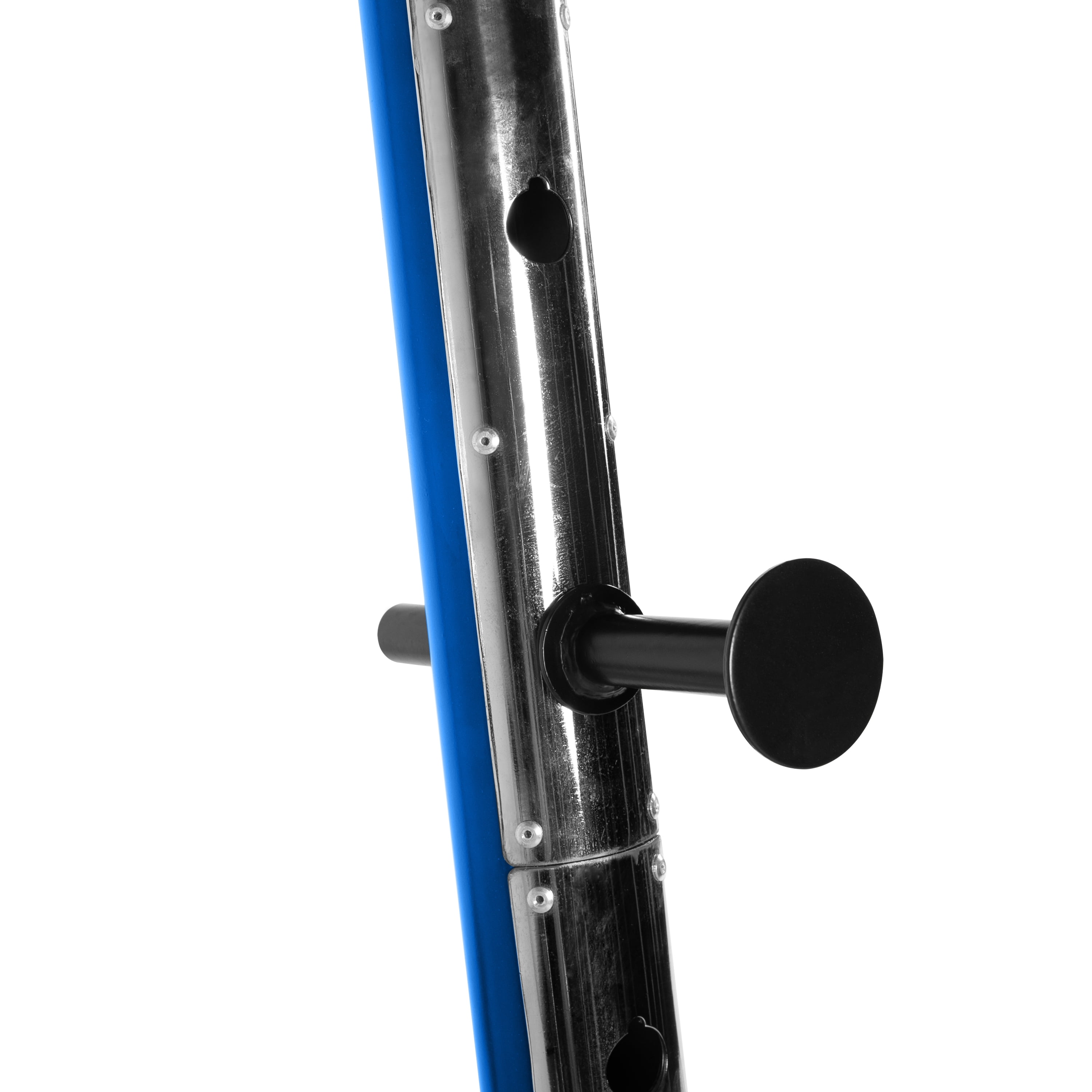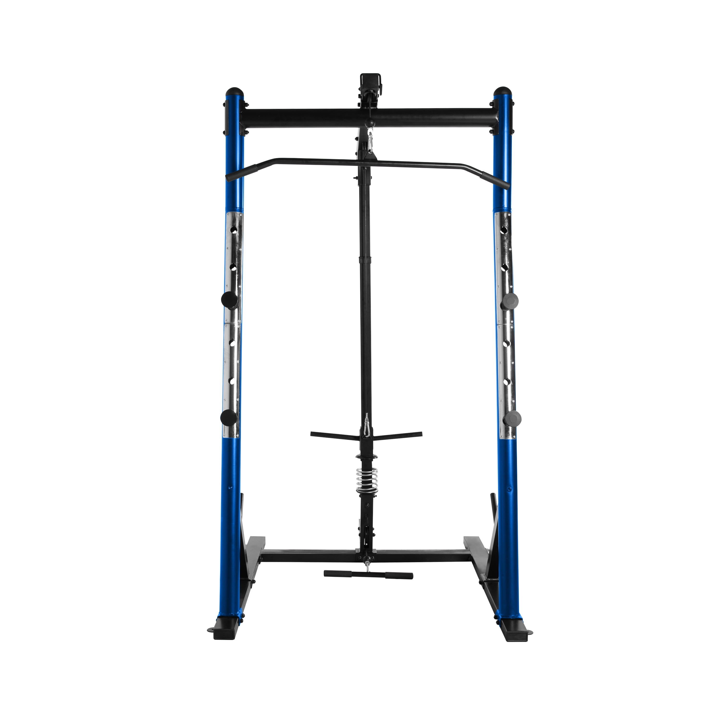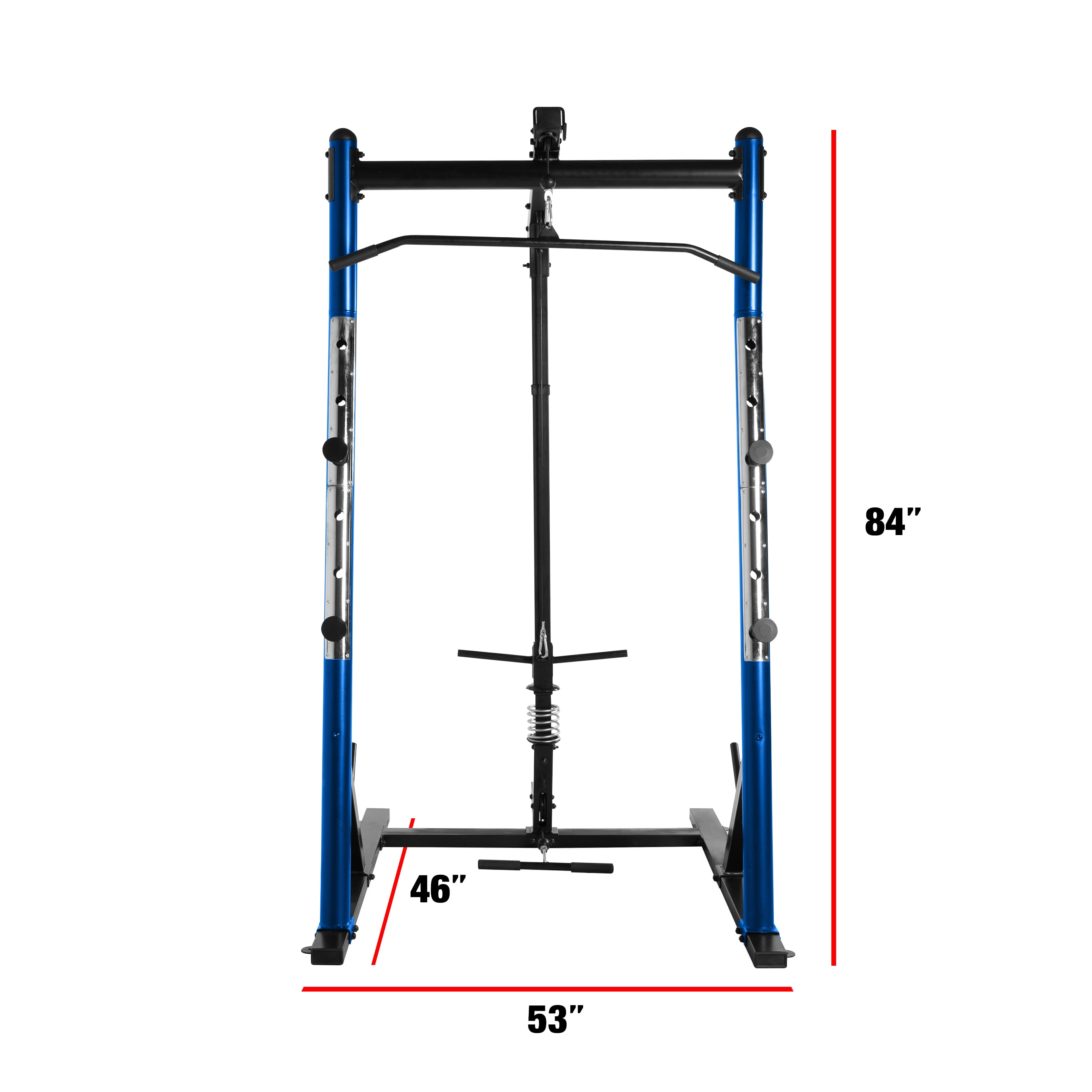 Steel tubing provides a sturdy and tough power cage Six safety catch height adjustments provide a custom workout Four solid cold rolled steel catches safely hold barbell and offer versatility in strength training routine Upper and lower lat/low row pulley system to build upper body strength Target the upper body and lower body with the multiple features of this cage Two plate storage posts that hold standard OR Olympic weight plates Durable blue powder-coat finish to withstand wear and tear Recommended max weight capacity for bar catches is 500 lbs, 300 lbs for the lat pull and low row attachment & 325 lbs for each plate post Assembled dimensions: 53” Wide x 46” Deep x 84” High