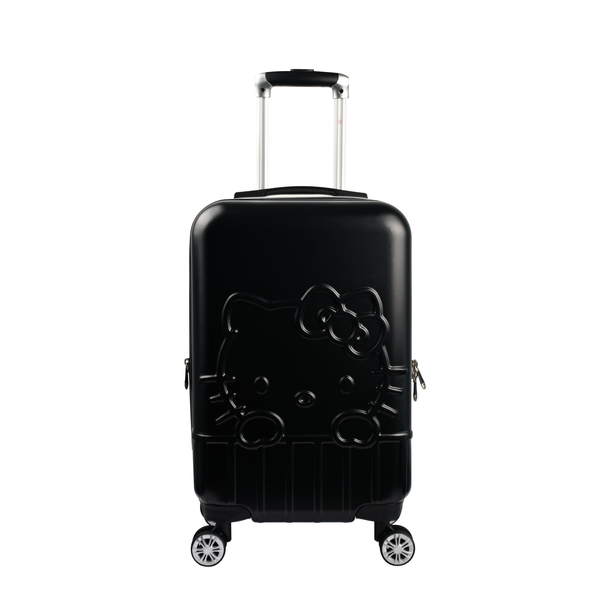 Keep your belongings conveniently and efficiently stored in one place while breezing through the airport or hotel lobby with this adorable Hello Kitty black rolling luggage on wheels. Designed with a stylish, eye-catching Hello Kitty embossed aesthetic, this hard shell carry on luggage features eight 360 degree multi-directional spinner wheels with to allow for smooth travel over all types of textured surfaces, and the lightweight hard sided luggage with spinner wheels features a retractable pull handle so you can reach your destination without hassle. The hard case luggage features a sizable polyester-lined main zip compartment for easy packing, a zip wet dry compartment for personal essentials, 2 mesh zip pockets for small accessories, clothing compression straps to keep clothing from wrinkling, and features expandable storage with 2-inch zipper gusset. The light weight carry on luggage roller features a hard shell ABS plastic case which protects your luggage and is easy to spot clean to keep the carry on luggage with wheels looking stylish during travel. The travelling bag with wheels measures 14 W x 8 D x 21 H in inches, and weighs 10 lbs.