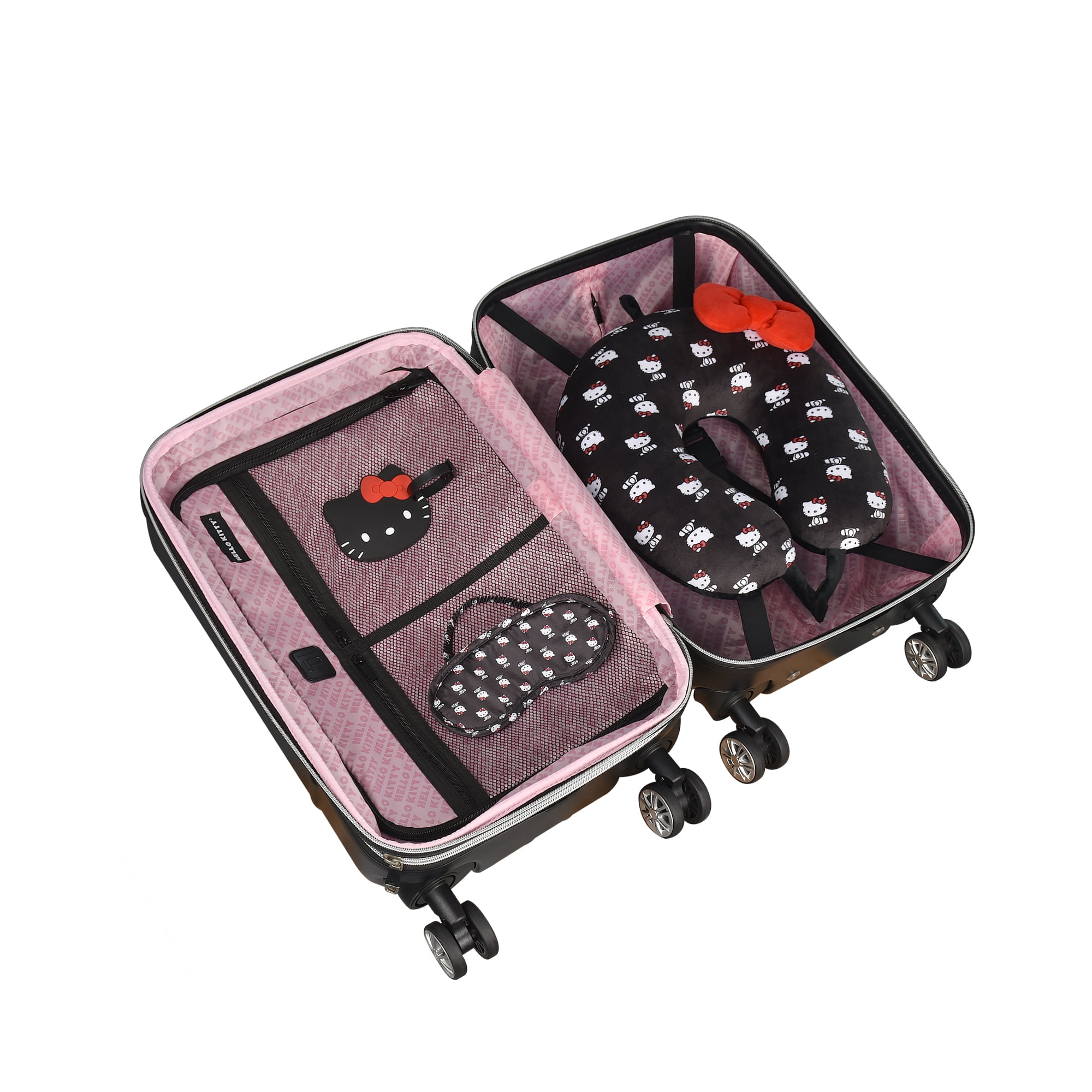 FUL 21” Girls Hardshell Spinner Carry-On Luggage, Black Black hardshell luggage featuring a cute Hello Kitty design Meets most airline requirements for carry-on luggage Fits into most overhead bins Sizable polyester-lined main zip compartment for easy packing Zip wet/dry compartment for personal essentials Two mesh zip pockets for small accessories Clothing compression straps to keep clothing from wrinkling Expandable storage with 2-inch zipper gusset