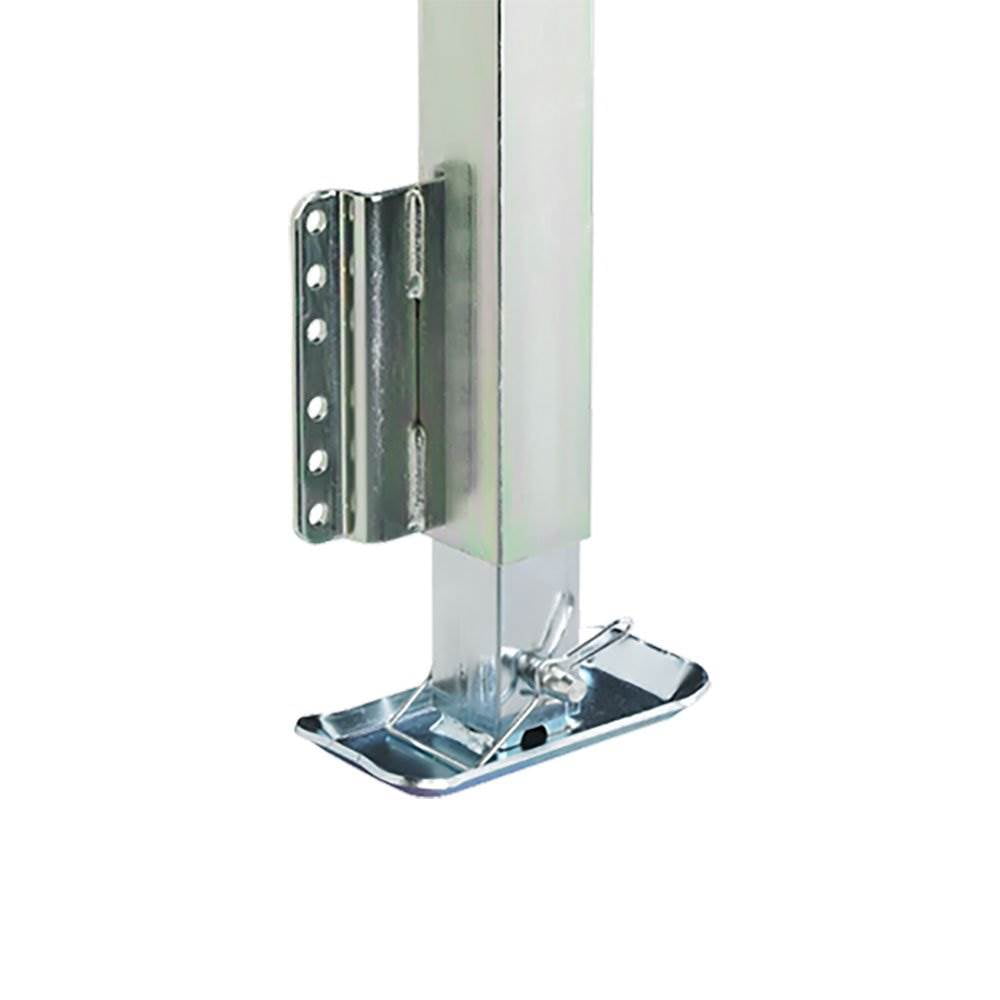 Side wind crank and square tube designed tongue jack for marine and utility trailers Constructed using 3 D formed heavy gauge steel stampings and a brushing material for a mount with maximum strength Mount fits up to a 3 x 5 inch trailer frame Drop leg design with a 3.8 x 7.5 inch footplate Z Max 600 finish helps resist corrosion for years of use Includes all necessary mounting hardware for installation Specifications: Lift capacity: 2,500 pounds Handle style: Side wind Mount type: Fixed Maximum height (extended): 35.5 inches Minimum height (retracted): 7 inches Material: Steel Finish: Z Max 600 Weight: 24.31 pounds Manufacturer warranty: 5-year warranty