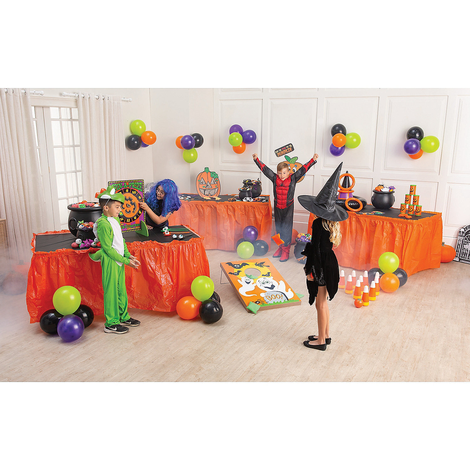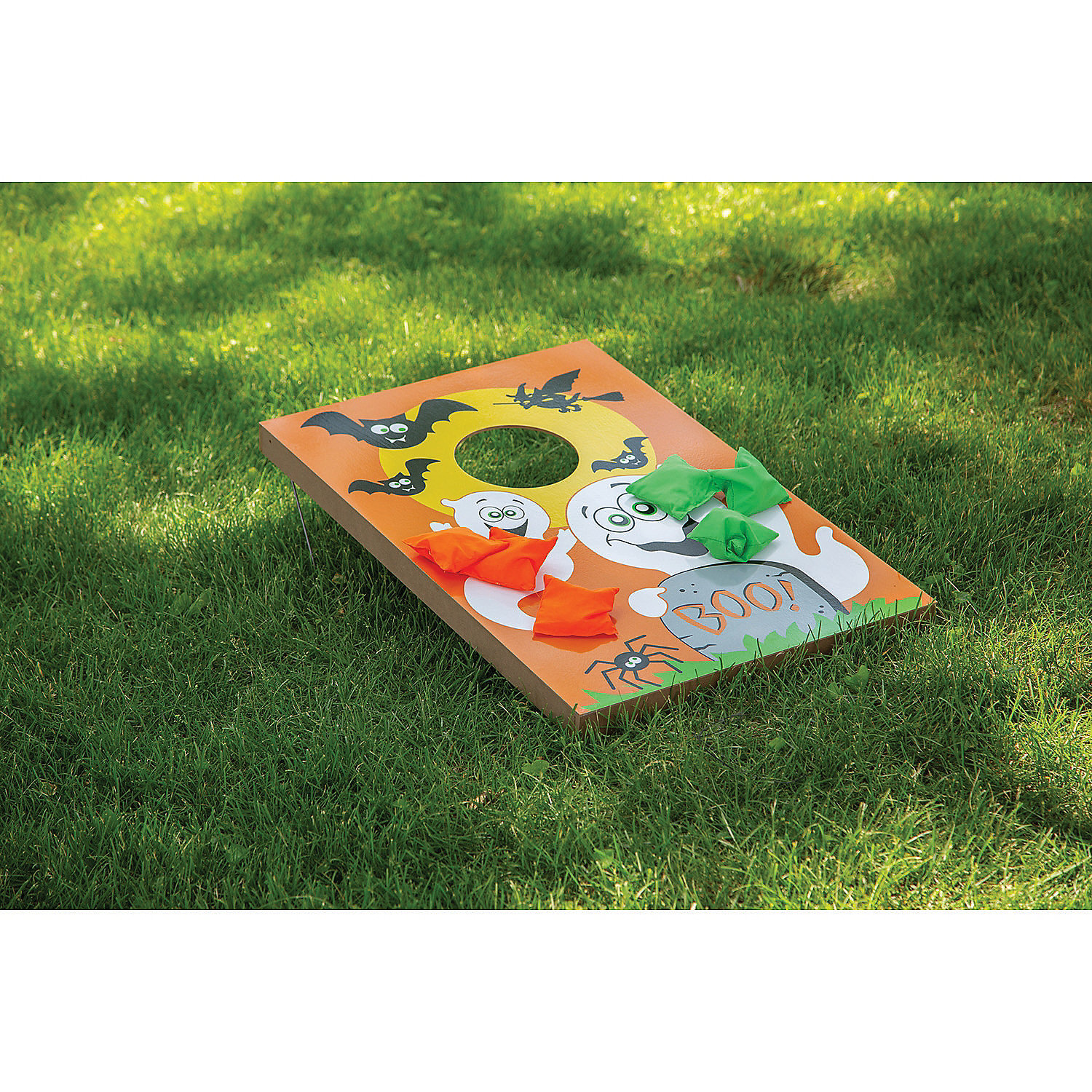 Fun Halloween game suitable for kids and adults Includes one wooden game board measuring 23 1/2″ x 35 1/2″ Comes with six 6″ canvas bean bags Perfect for Halloween classroom parties, kid-friendly events, or backyard haunted houses Simple assembly required Set includes a total of 7 pieces