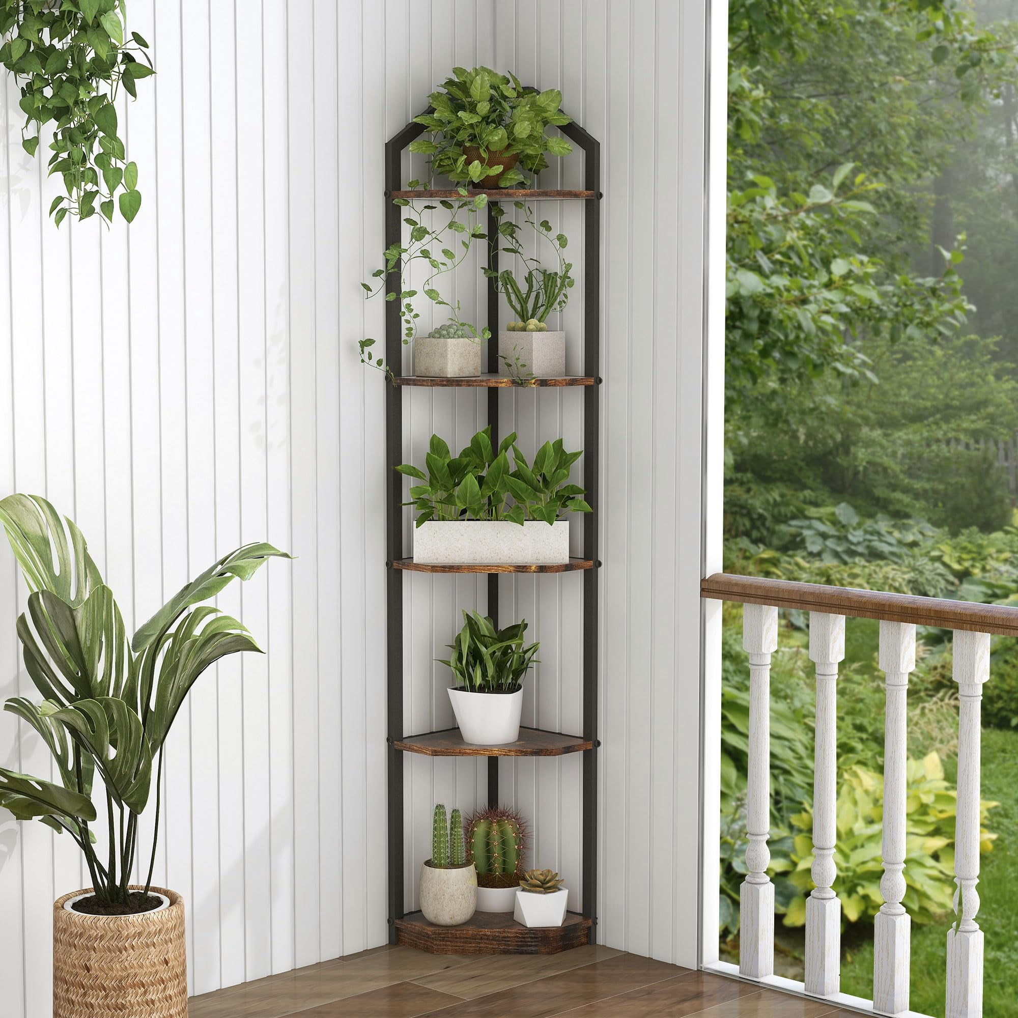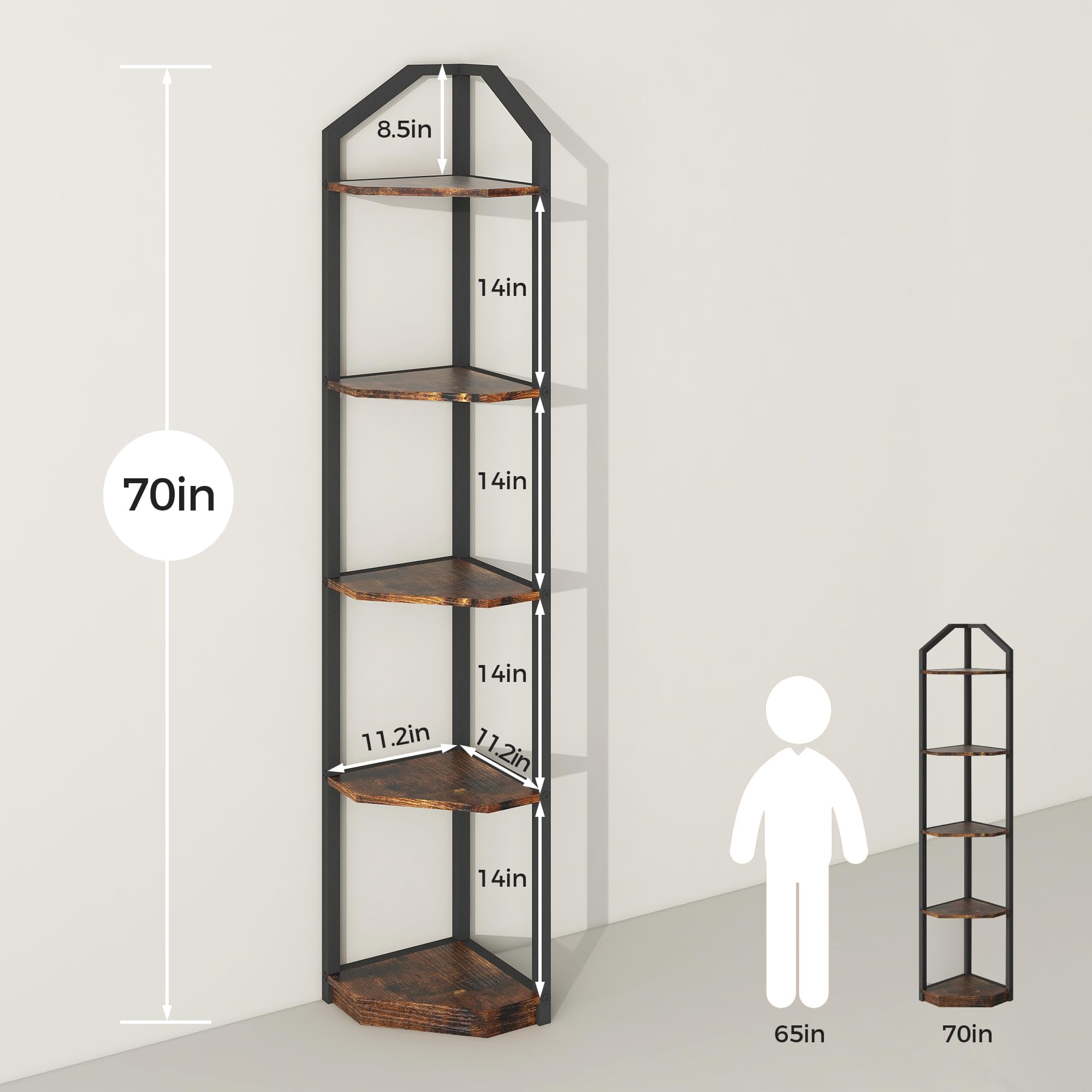 【Multifunctional Corner Shelf】Experience the fusion of modern design and industrial chic with our Multifunctional Corner Shelf. Its seamless blend of contemporary aesthetics and industrial style effortlessly complements any home decor. Maximize your corner space in the living room, bedroom, kitchen, or home office with this versatile shelf. 【Stylishly Versatile】Elevate your space with the stunning vintage industrial aesthetic of our corner bookshelf. Its timeless design seamlessly fits into any room, from the living room to the bedroom, office, and beyond. Whether you seek decor enhancement or additional storage, this piece is both versatile and timeless, effortlessly amplifying any space’s style and functionality. 【Dimensions and Premium Materials】Measuring at 11.5” W x 11.5” D x 70” H, the thoughtfully spaced shelves allow for the display of items of varying sizes. Crafted from high-grade MDF board and a sturdy folding metal frame, this corner bookshelf ensures enduring use while retaining its elegant rustic charm. 【Safety First】Enhanced with advanced metal anti-tipping mechanisms, our corner bookshelf prioritizes safety by preventing tip-over accidents. Its exceptional strength and stability make it a reliable addition to your space. 【Effortless Assembly and Customer Assurance】 Assembling this corner bookshelf takes approximately 20 minutes, facilitated by clear instructions and included hardware for a hassle-free installation. Our dedicated 24-hour customer service supports you, backed by an 18-month assurance guarantee, ensuring your satisfaction with our product.