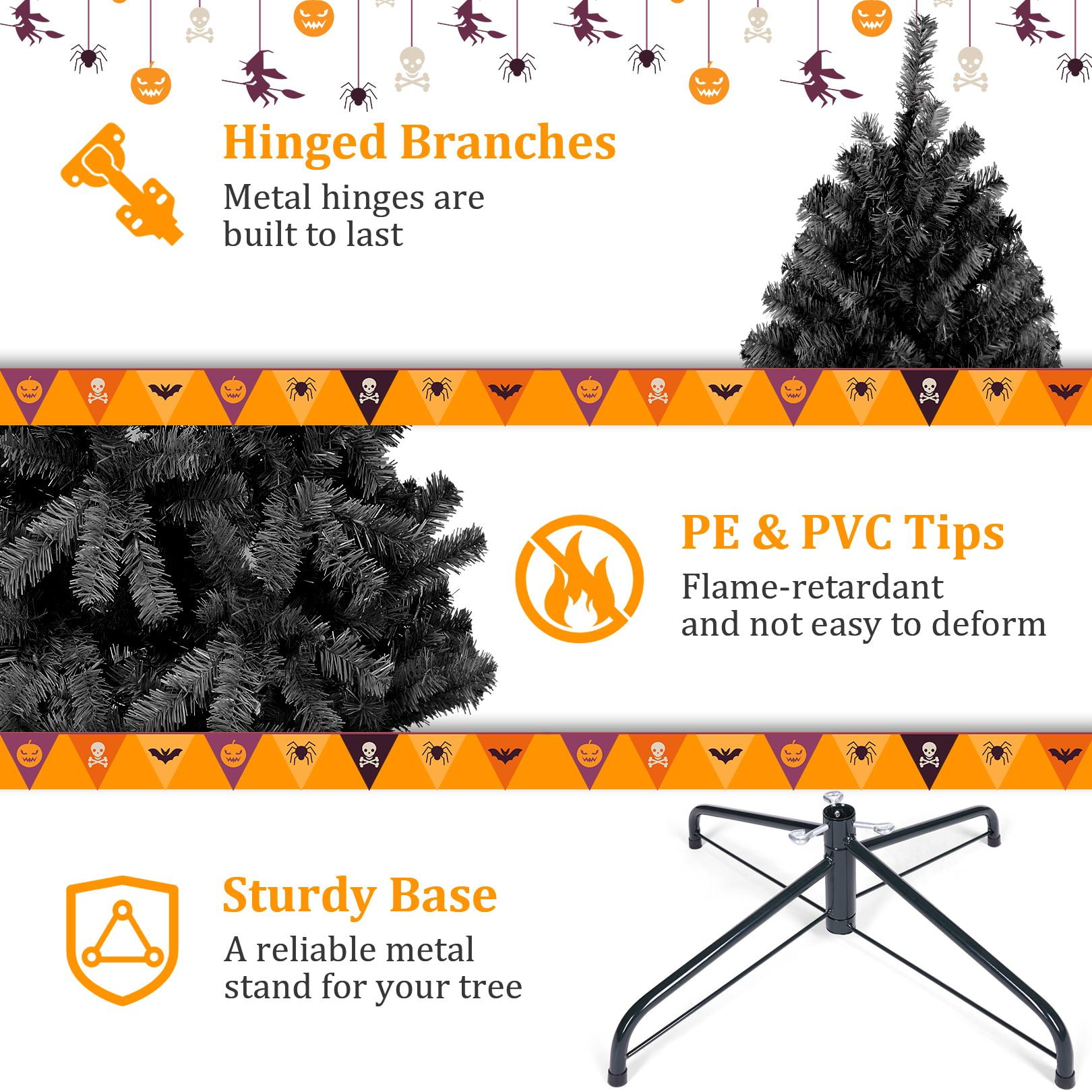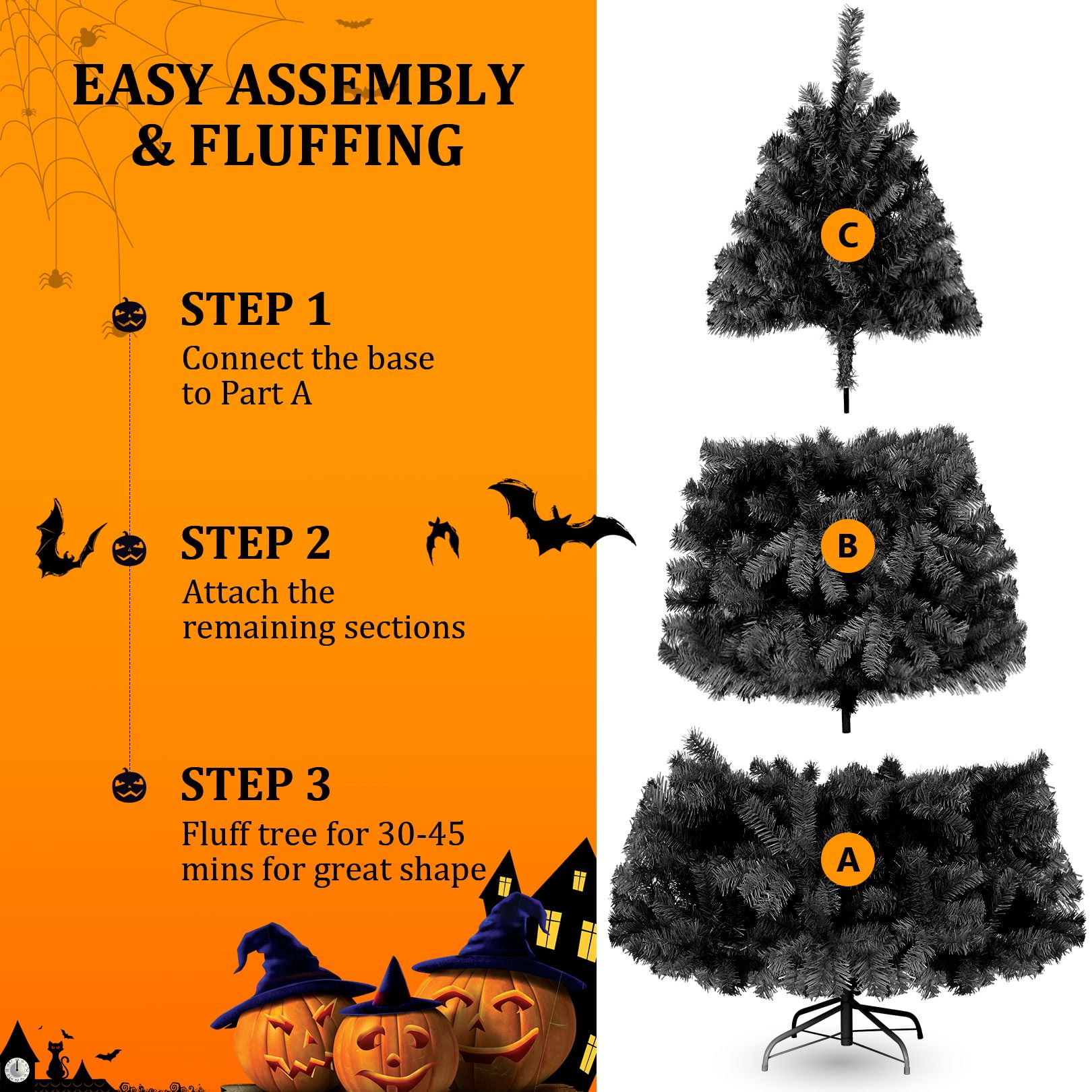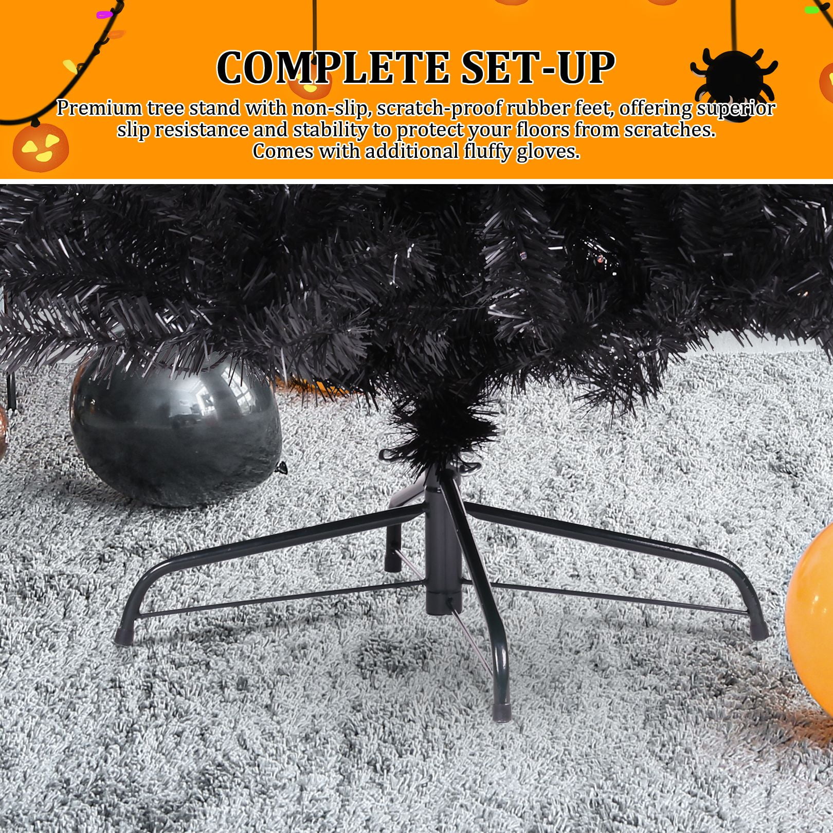 PVC material is non-flammable and non-allergic Constructed in 3 sections for easy set up Have ample space to decorate your favorite tree Perfect size to create a holiday atmosphere Stable and foldable metal base is sturdy to support the whole tree Suitable for home, office, holiday party, classroom Features: Unique & Full Appearance: Our 6ft Artificial Christmas tree stands out with its distinctive green spruce design. Featuring ultra-realistic 1477 PVC branch tips, this tree offers a lush and full appearance after fluffing, providing ample space for hanging ornaments in your preferred style. Easy to Assemble & Fluff: With a convenient hinged design, this tree is a breeze to assemble, disassemble, and store. The tree comes in 3 sections that easily fit together, and the hinged branches expand effortlessly, saving you time and energy. Simply arrange the branches, add your decorations, and your stunning Christmas tree is ready to shine. Superior Material: Our Christmas tree is constructed with sturdy metal hinges and fire-retardant pink PVC blades, ensuring durability and safety for indoor use. The high-quality materials contribute to a better overall experience, making this tree a reliable and long-lasting holiday centerpiece. Foldable Metal Stand: Unlike cheap plastic stands, our tree comes with a foldable metal stand equipped with non-slip foot pads. This provides superior stability and balance, keeping the tree securely upright and preventing breakage, while also protecting your floors. The foldable feature makes storage and packing a breeze. Holiday Cheer: Spread Holiday Cheer with the Artificial Halloween Christmas Tree, perfect for any location! Whether you’re looking to decorate for Halloween, host a Halloween party, or create a festive ambiance, this versatile tree is an ideal choice. Place it by your doorway, in the living room, near the fireplace, on the windowsill, alongside the stairs, on your balcony, or even in a shopping mall or children’s room. Get creative and hang your favorite ornaments on it to add a personal touch. With this tree, you’ll effortlessly bring joy and prosperity to your celebrations. Specifications: Color: Black Size: 6ft Material: PVC + Metal Number of Tips: 1477 Package Includes: 1 x Black Christmas Tree 1 x Metal Stand 1 x Instruction 2 x gloves Note: At the end of the installation, it takes about 30-40 minutes to fluff and shape the tips. Please remove the plastic cap from a pole which is only for tree protection in transit. If the caps are damaged or missing upon arrival, it doesn’t matter.