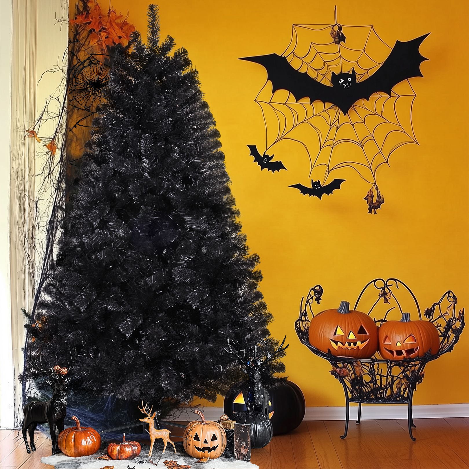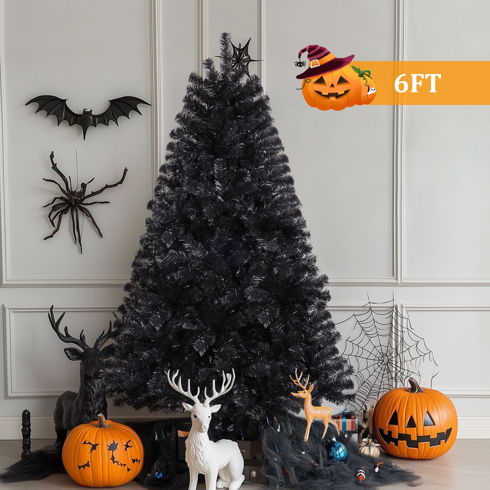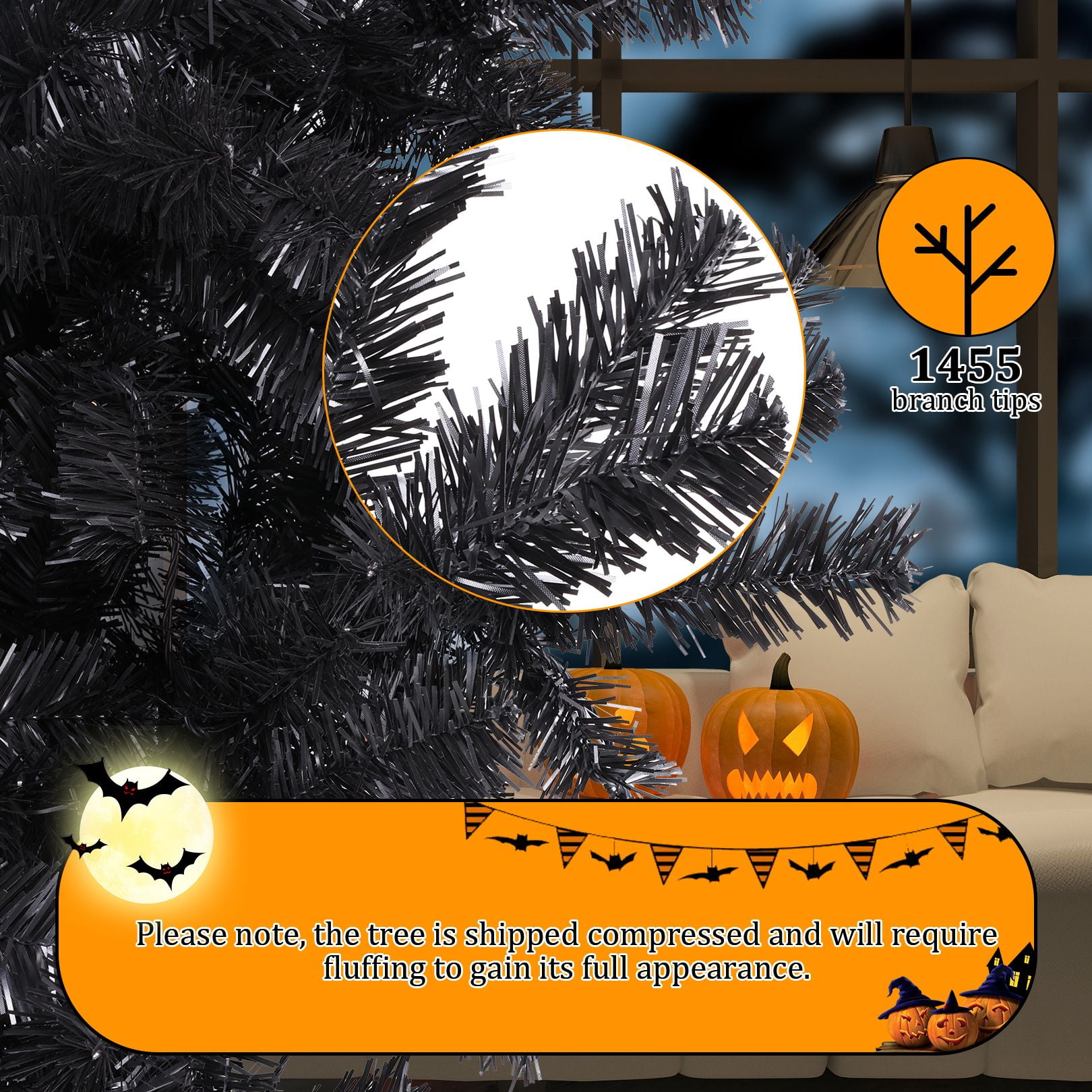 PVC material is non-flammable and non-allergic Constructed in 3 sections for easy set up Have ample space to decorate your favorite tree Perfect size to create a holiday atmosphere Stable and foldable metal base is sturdy to support the whole tree Suitable for home, office, holiday party, classroom Features: Unique & Full Appearance: Our 6ft Artificial Christmas tree stands out with its distinctive green spruce design. Featuring ultra-realistic 1477 PVC branch tips, this tree offers a lush and full appearance after fluffing, providing ample space for hanging ornaments in your preferred style. Easy to Assemble & Fluff: With a convenient hinged design, this tree is a breeze to assemble, disassemble, and store. The tree comes in 3 sections that easily fit together, and the hinged branches expand effortlessly, saving you time and energy. Simply arrange the branches, add your decorations, and your stunning Christmas tree is ready to shine. Superior Material: Our Christmas tree is constructed with sturdy metal hinges and fire-retardant pink PVC blades, ensuring durability and safety for indoor use. The high-quality materials contribute to a better overall experience, making this tree a reliable and long-lasting holiday centerpiece. Foldable Metal Stand: Unlike cheap plastic stands, our tree comes with a foldable metal stand equipped with non-slip foot pads. This provides superior stability and balance, keeping the tree securely upright and preventing breakage, while also protecting your floors. The foldable feature makes storage and packing a breeze. Holiday Cheer: Spread Holiday Cheer with the Artificial Halloween Christmas Tree, perfect for any location! Whether you’re looking to decorate for Halloween, host a Halloween party, or create a festive ambiance, this versatile tree is an ideal choice. Place it by your doorway, in the living room, near the fireplace, on the windowsill, alongside the stairs, on your balcony, or even in a shopping mall or children’s room. Get creative and hang your favorite ornaments on it to add a personal touch. With this tree, you’ll effortlessly bring joy and prosperity to your celebrations. Specifications: Color: Black Size: 6ft Material: PVC + Metal Number of Tips: 1477 Package Includes: 1 x Black Christmas Tree 1 x Metal Stand 1 x Instruction 2 x gloves Note: At the end of the installation, it takes about 30-40 minutes to fluff and shape the tips. Please remove the plastic cap from a pole which is only for tree protection in transit. If the caps are damaged or missing upon arrival, it doesn’t matter.