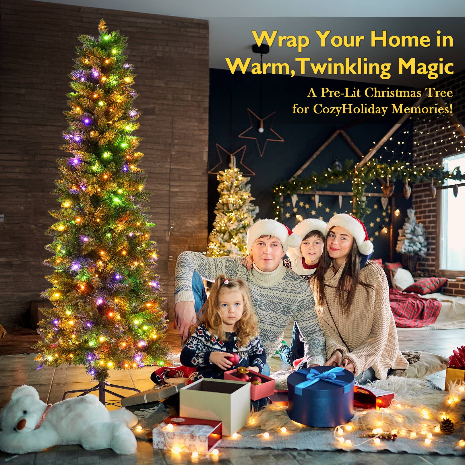 Funcid 6ft Pre-Lit Artificial Hinged Slim Pencil Christmas Tree with 250 Multi-Color Lights, 972 Branch Tips, Metal Hinges & Foldable Base, Green