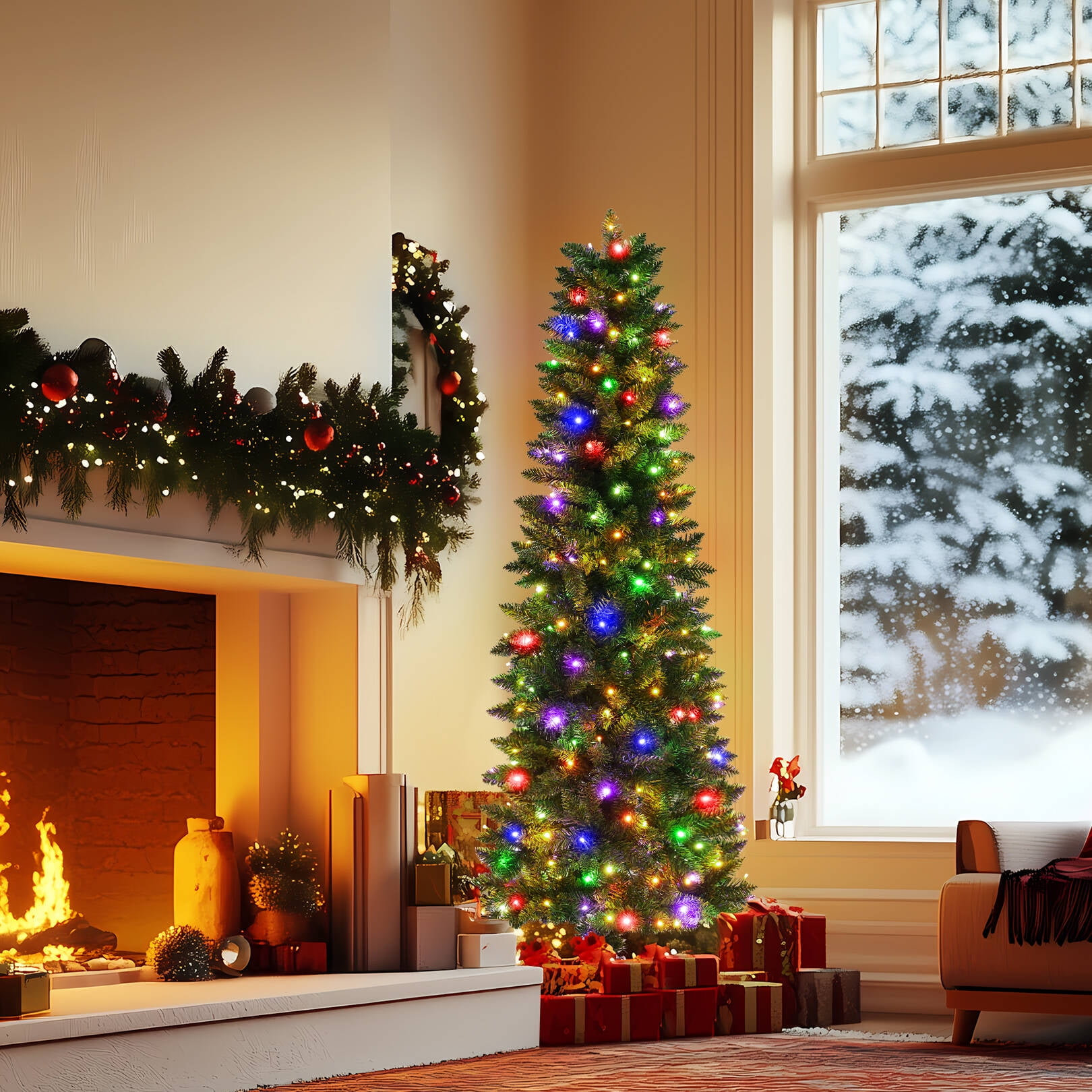 Transform your home into a winter wonderland with our 6-foot green pencil christmas tree. This majestic spruce tree is designed to look and feel incredibly lifelike, boasting 972 individually crafted branch tips that create a full-bodied appearance, perfect for showcasing your ornaments. The tree features a convenient hinged branch system that allows for quick and easy setup, as well as effortless storage. Pre-strung with 250 multi-color LED lights and warm white lights, it offers a mesmerizing nighttime glow. Crafted from sturdy, high-quality, hypo-allergenic, and fire-resistant materials, this tree is built to bring holiday cheer for many years to come. At our company, we are dedicated to providing high-quality Christmas decorations that help you transform your home and create magical moments throughout the holiday season.