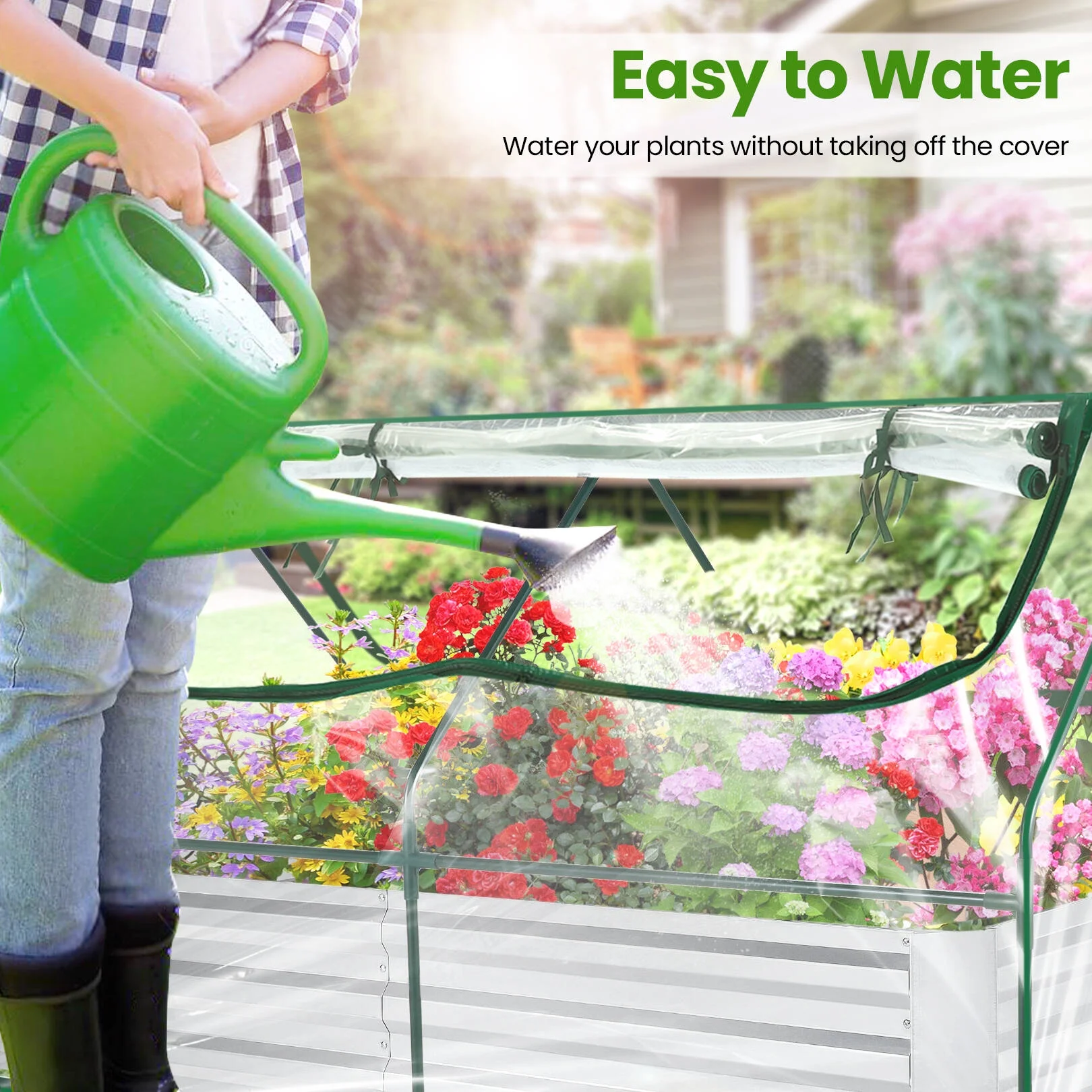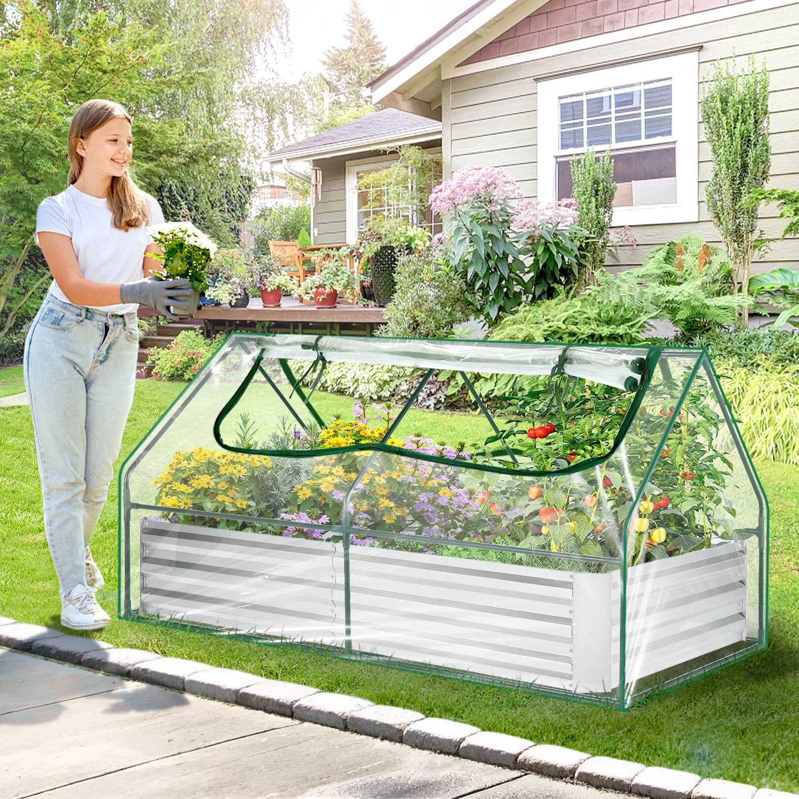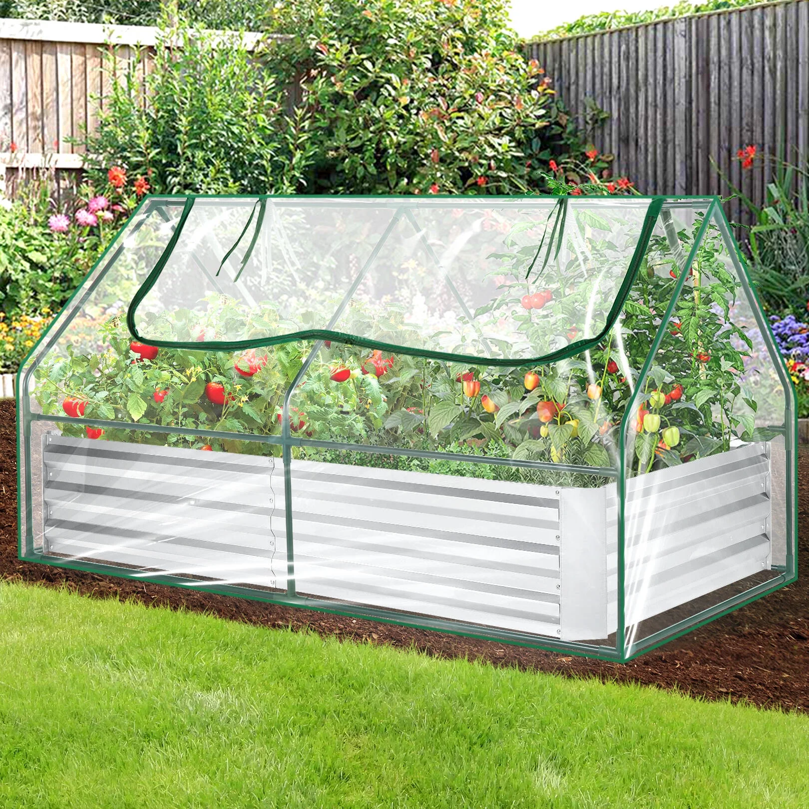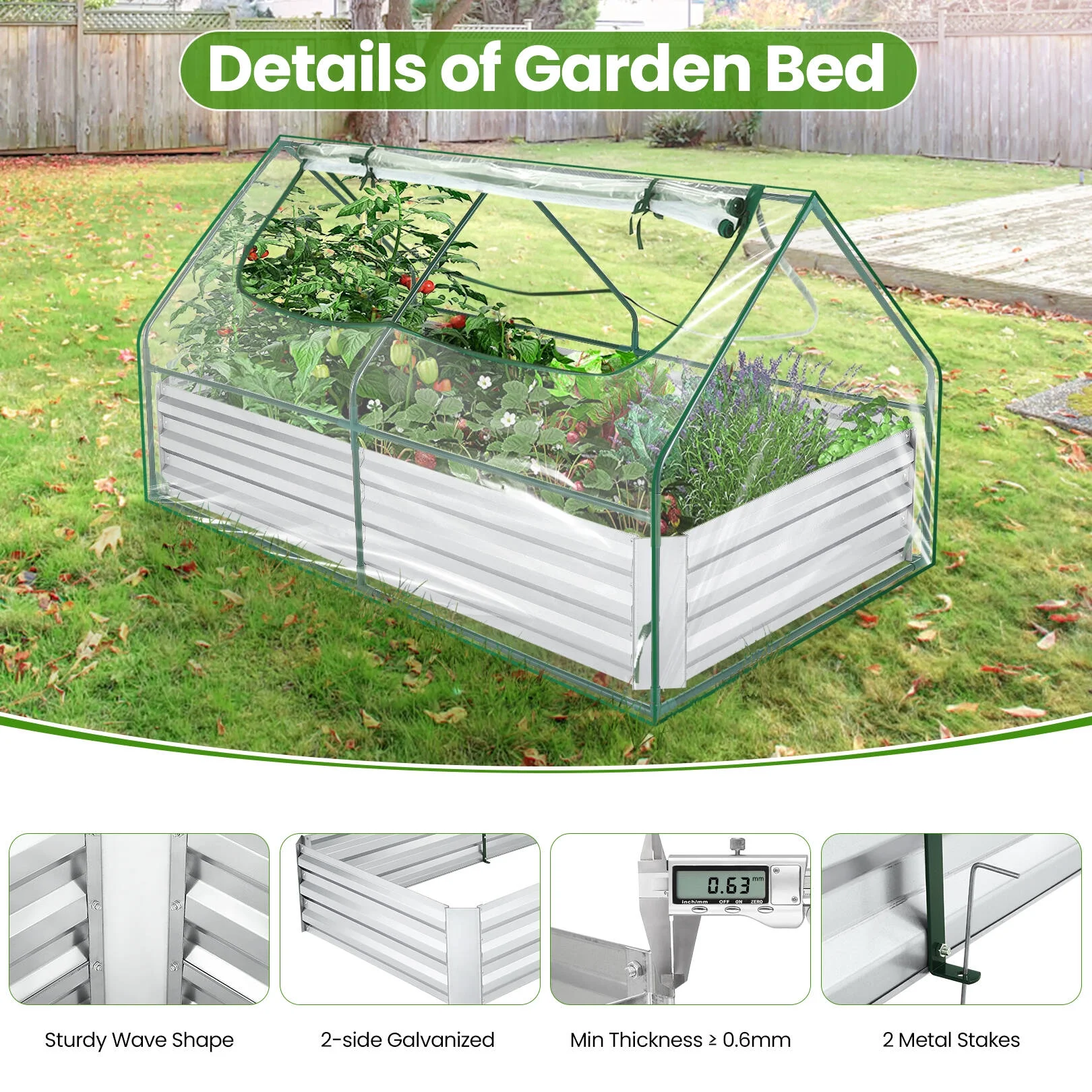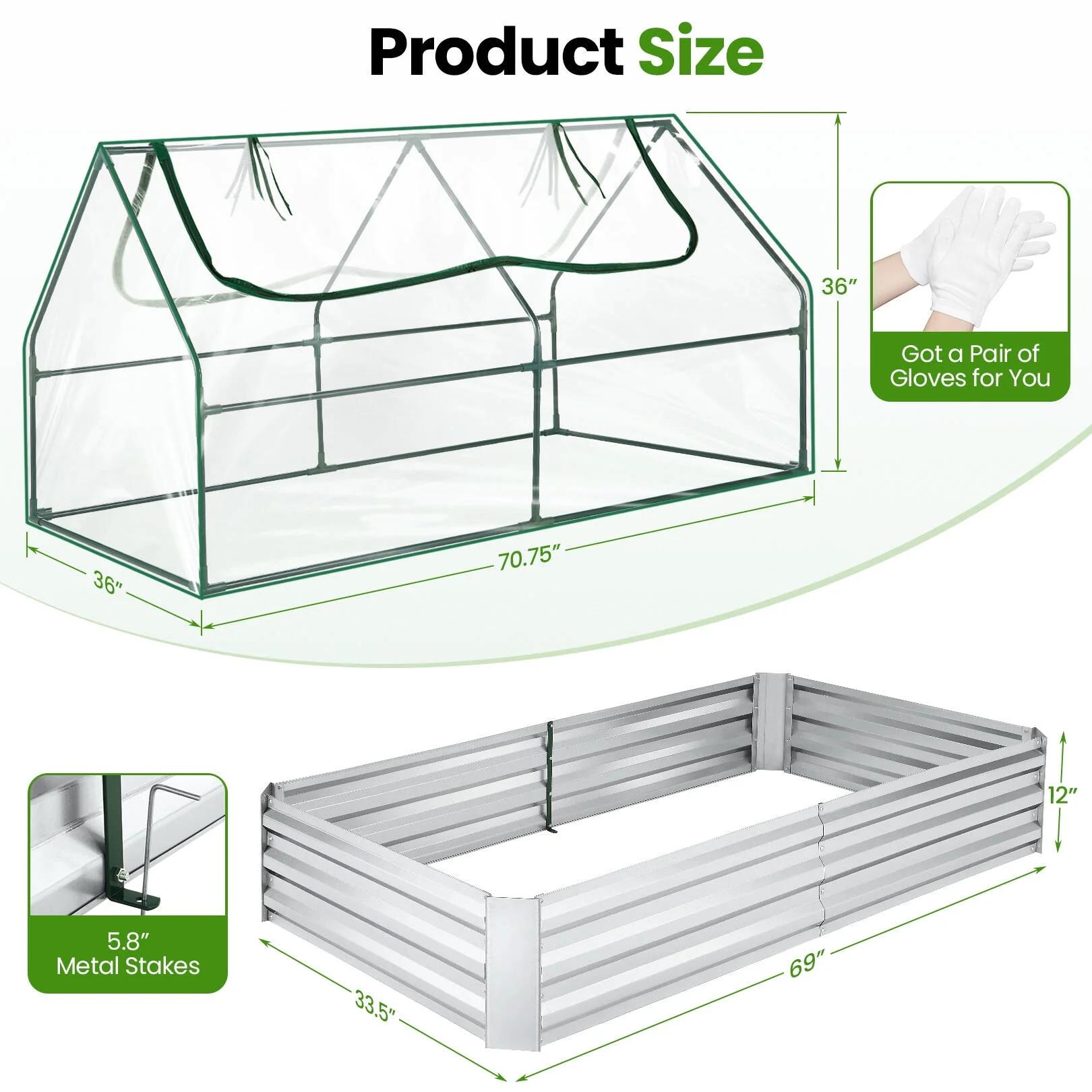 Durable Galvanized Garden Bed Premium PVC Greenhouse Cover Keep the birds and insects out Growing Regardless of the Season Idea Size for Your Garden 3-in-1 Multifunctional Use: This galvanized raised planter box kit consists of 2 parts: a raised garden bed for raising your plants and a mini greenhouse for protecting plants from bad weather. Moreover, it can also be combined and used as a garden bed with cover, meeting your different needs. Extend Growing Seasons: The all-weather raised garden bed can not only protect plants from harmful sunlight and bad elements (such as frosts, excessive heat, or too much moisture) but also keep the interior warm, creating an ideal environment for growing plants. Durable & Weatherproof Material: The protective cover is made of premium PVC, which is waterproof, moisture-resistant, and durable, ensuring long-term use. Furthermore, the garden bed with deformation-resistant wave shapes is constructed of high-strength galvanized steel, ensuring good rust and corrosion resistance Open-Ended Base: The raised garden planter box adopts an open-ended base, which can facilitate the replacement of fresh oxygen in the soil, promoting root growth. More than that, it can also promote good drainage, avoid water logging, and maintain soil nutrients. Good Ventilation: The mini greenhouse is designed with 2 large screen windows, which are great for ventilating and adjusting the interior humidity while allowing you to water plants easily. They can effectively keep birds and insects out when closed. The screen windows can be rolled up and fixed by straps. Brand: Funcid Item Name: Raised Garden Bed with Mini Greenhouse Color: Silver Material: Galvanized Steel, PVC Size of Greenhouse: 70.75” x 36” x 36” (L x W x H) Size of Raised Garden Bed: 69” x 33.5” x 12” (L x W x H) Volume: 18 Cu. Ft Need 12 Bags of 1.5 Cu. Ft Soil Need 9 Bags of 2 Cu. Ft Soil 1 x Mini Greenhouse 1 x Raised Garden Bed 1 x User’s Manual 1 set of Assembly tools Gift: 1 Pair of Gloves