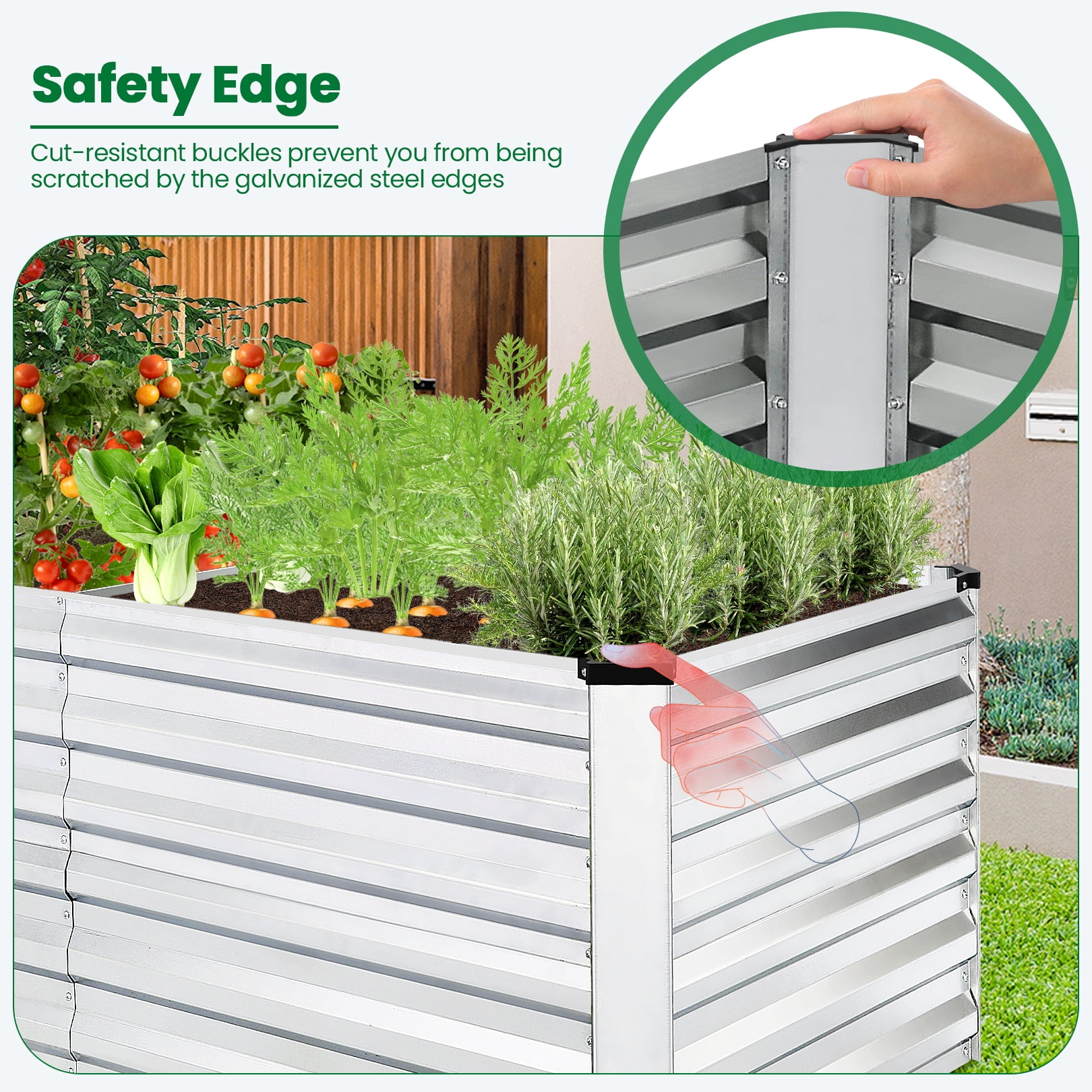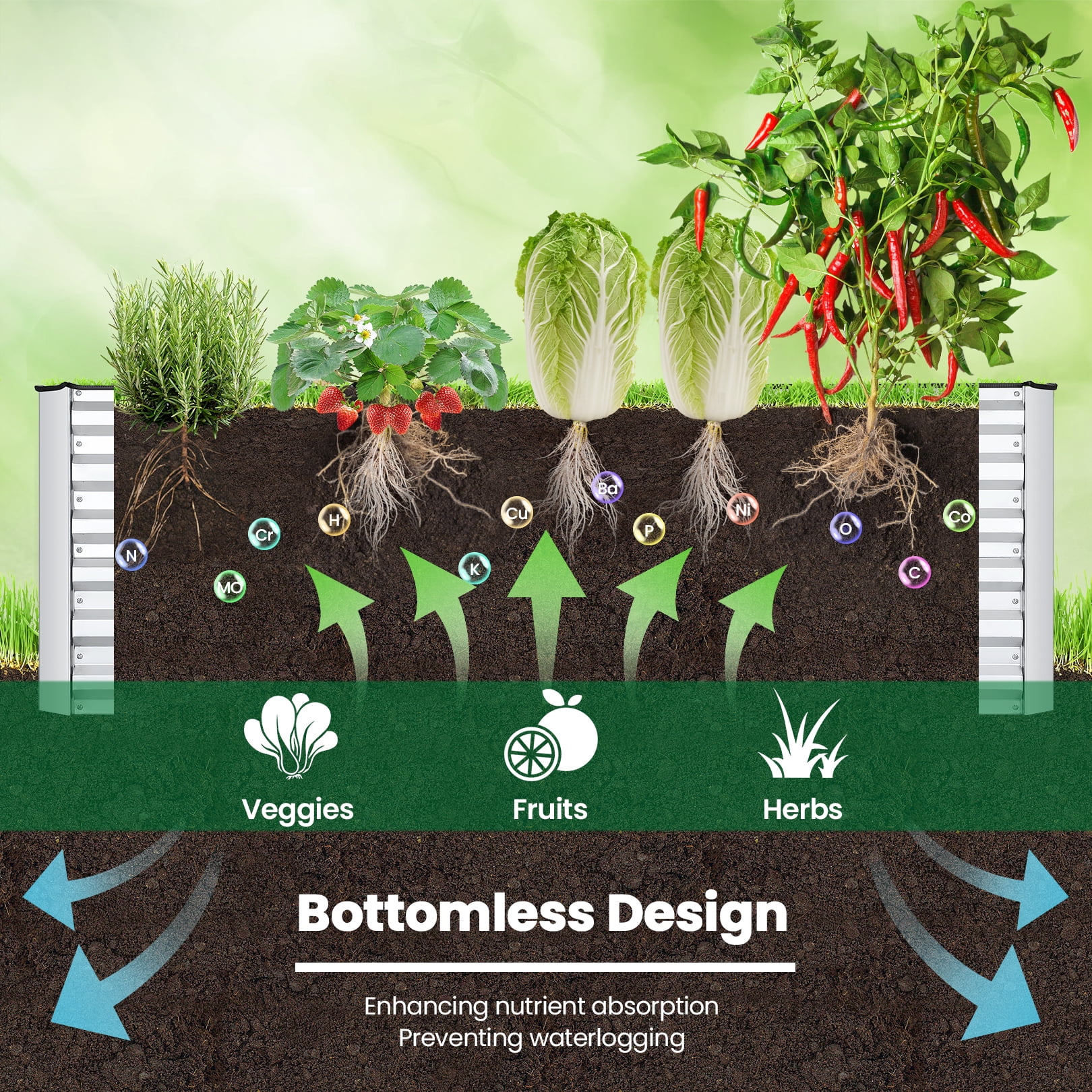 2FT GROWING DEPTH: 24 inches of depth holds up to 265 gallons of soil-great for medium to deep rooting plants and vegetables like broccoli, beans, and more. TOOL-FREE ASSEMBLY: Beveled steel panels come together with a set of included wingnuts and bolts with rubber edging for your added safety BUILT TO LAST: Made of powder-coated steel plates to keep your garden bed looking its best for years to come OPTIMAL COMPOST BED: An open base combined with ribbed steel makes this the perfect space to layer yard waste, food scraps, and other additives to create enriched soil at home INNER STABILIZING BARS: X-Shape steel support bars help the metal panels retain their shape, preventing warping and soil leakage over time; OVERALL DIMENSIONS: 71″(L) × 36″(W) × 24″(H)
