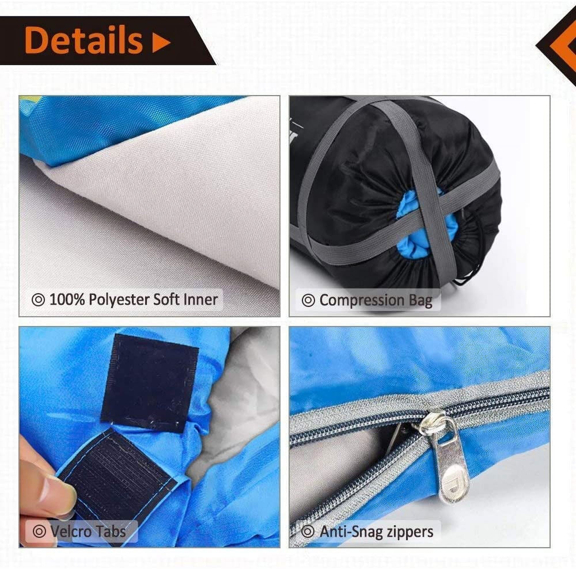 Double Wide Sleeping Bag: This camping sleeping bag is big enough for two adults. With two sides zipper design, the top half and bottom half can be separated to make two single sleeping bags, meanwhile it is a good choice to use it as quilt or blanket. Two convenient outer pocket with zipper to hold flashlight, wallet, keys ,watch and other valuables. Warm Weather Sleeping Bag: The outer fabric of this adult sleeping bag is 100% polyester 190T which is waterproof. The filling is hollow warm loft 250 g/m2 which make the bag warm. Full-length, insulated draft tube prevents heat loss through the zipper. Comfortable Sleeping Bag: The lining material is 100% micro-brushed polyester which make the bag soft and extreme comfort when your skin touch against it. Wide bottom room is convenient to move your legs. Unzip bottom for extra ventilation on warmer nights. Two pillows are included. With two-way separating zips on two sides, it will be very convenient for you to get in and out without disturbing your partner and keep warm. Four straps at the bottom are designed to hang or dry the sleeping bag. Durable Sleeping Bag: The Fundango sleeping bag comes with super durable, reinforced zippers, zipper guards, tight compression sack, will ensure the bag durable in countless adventures. Full-length zipper webbing protects against snags. Sturdy polyester taffeta shell stands up to years of use. Portable Sleeping Bag: The sleeping bag can be compressed to22.4 ×12.6×12.6inches as a small package for easy transport and store with its compressed carry bag.
