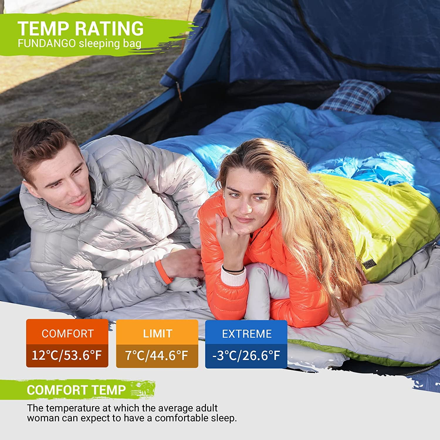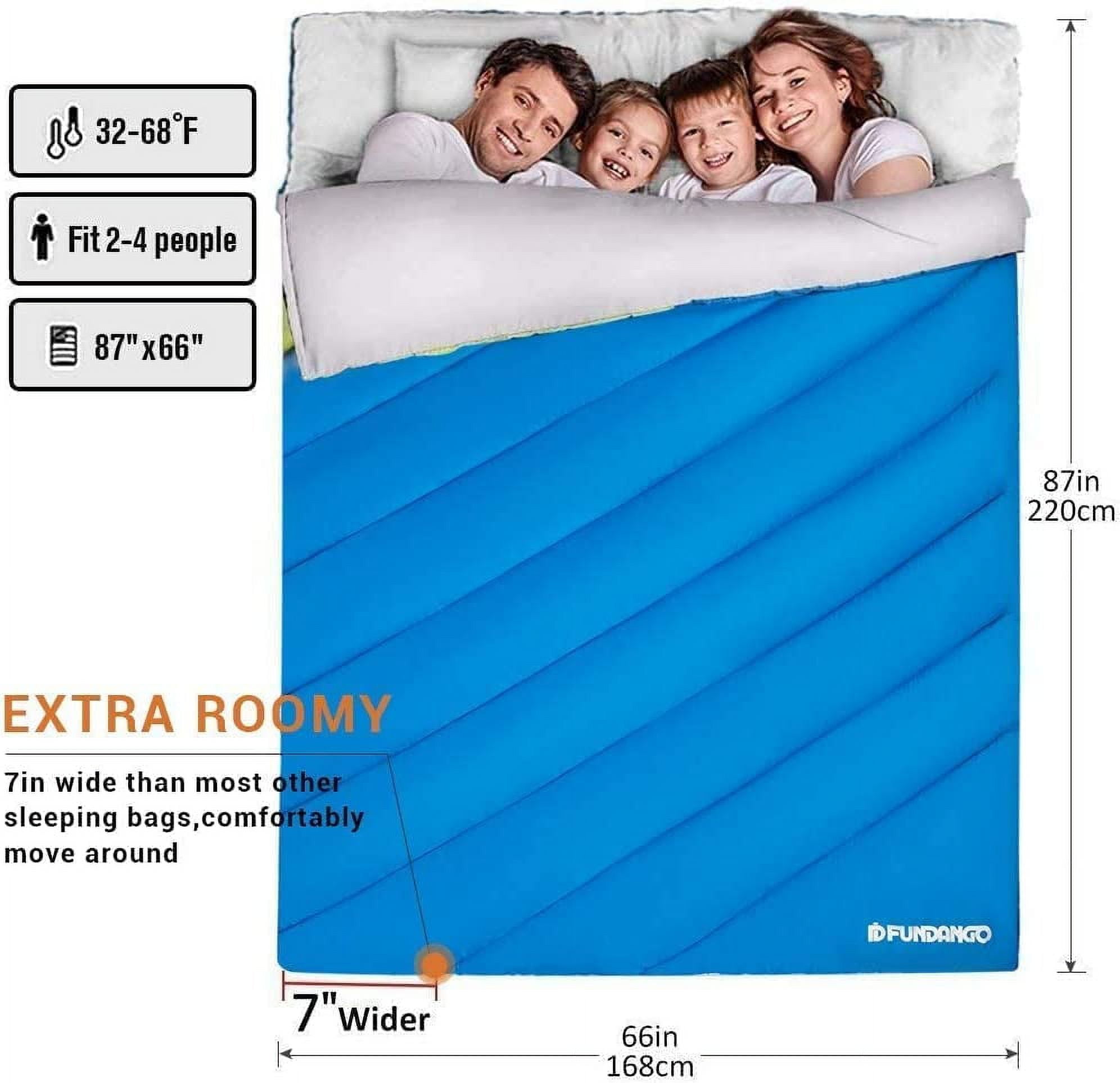 FUNDANGO 3-in-1 Queen Double Sleeping Bag- Extra Wide Envelope Sleep Bag for Adults ,2-4 Person Capacity – 26.6℉ to 72℉