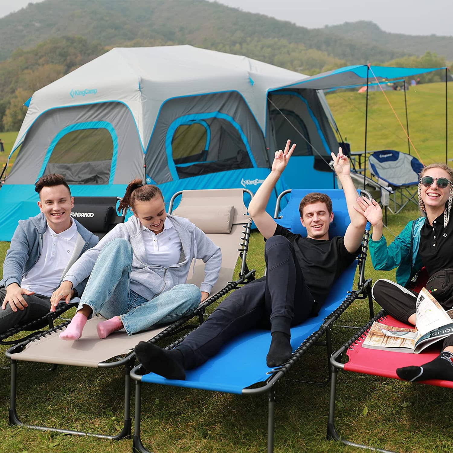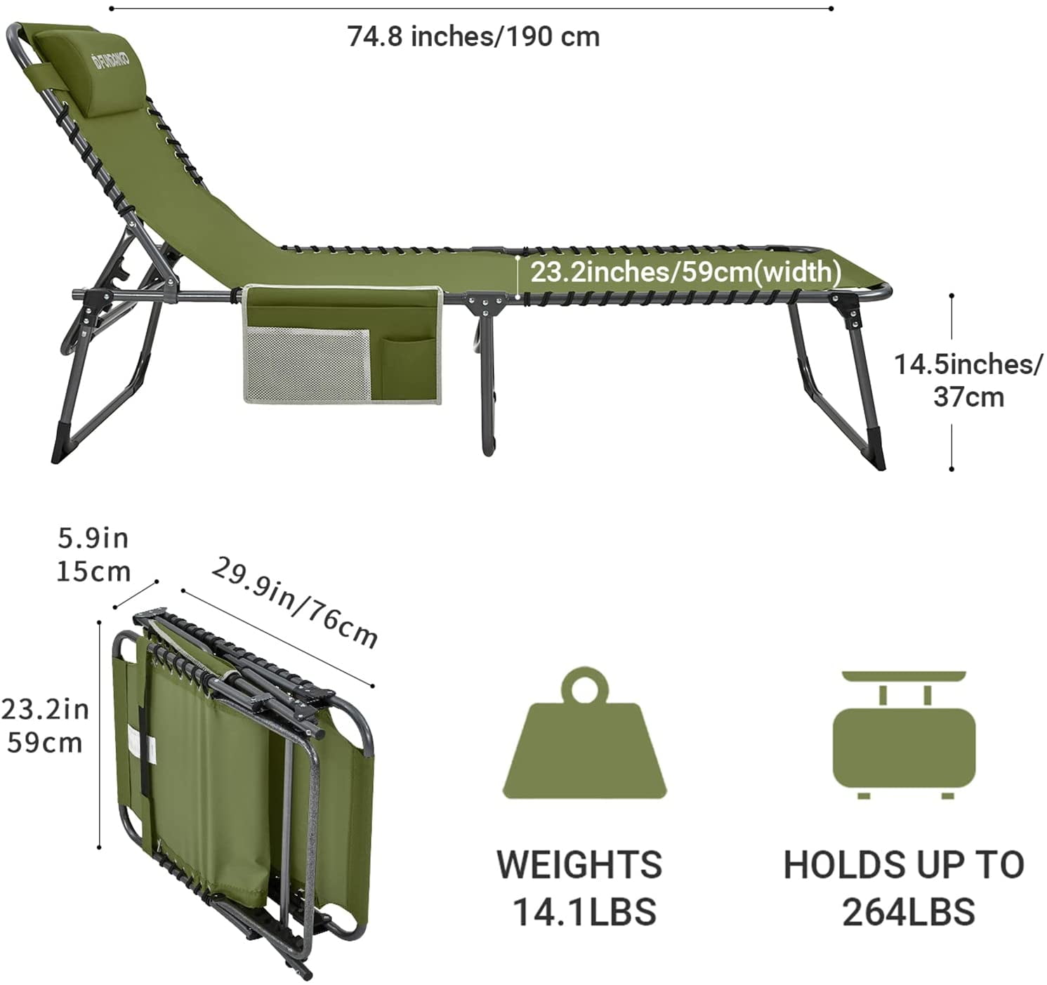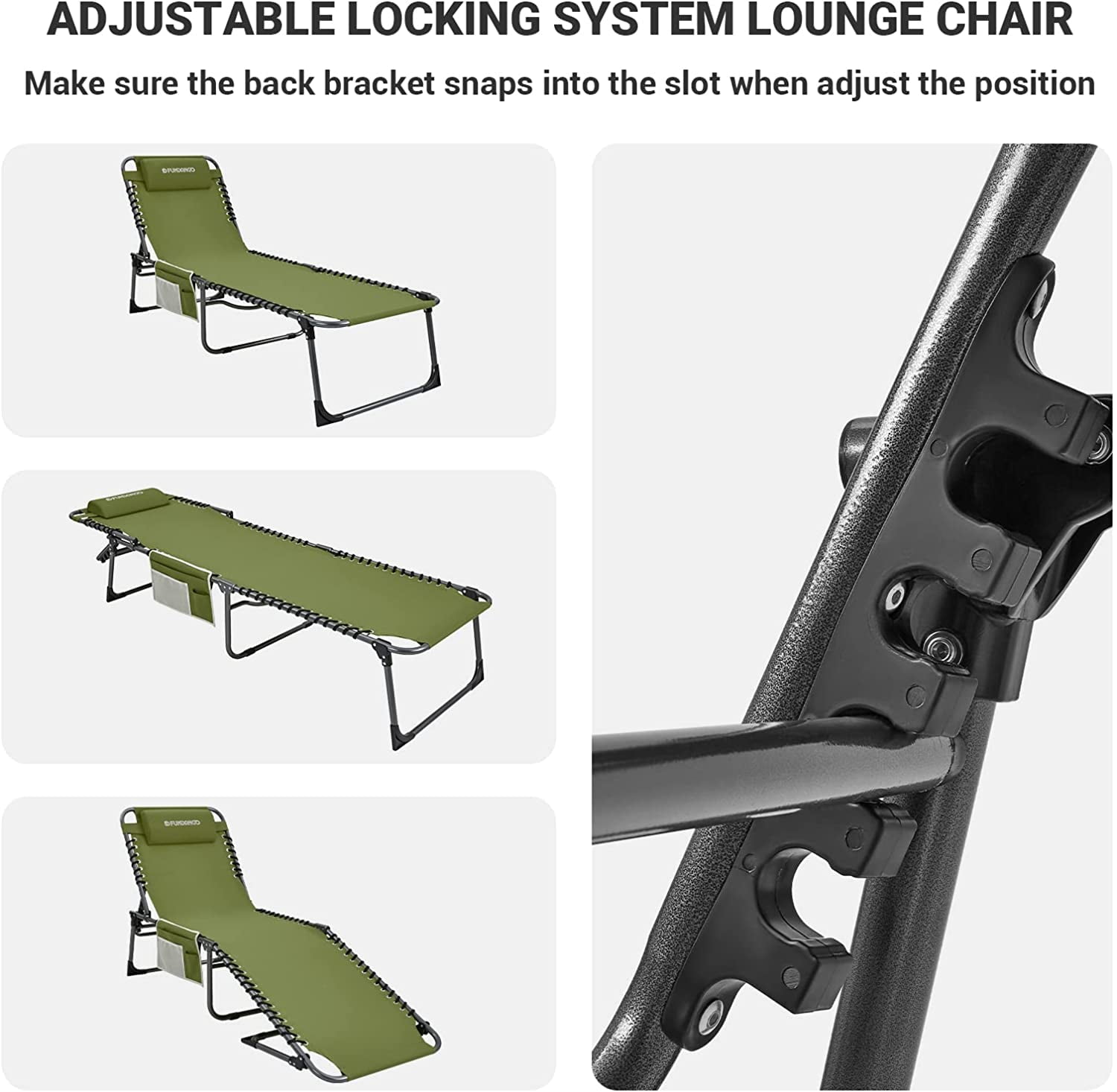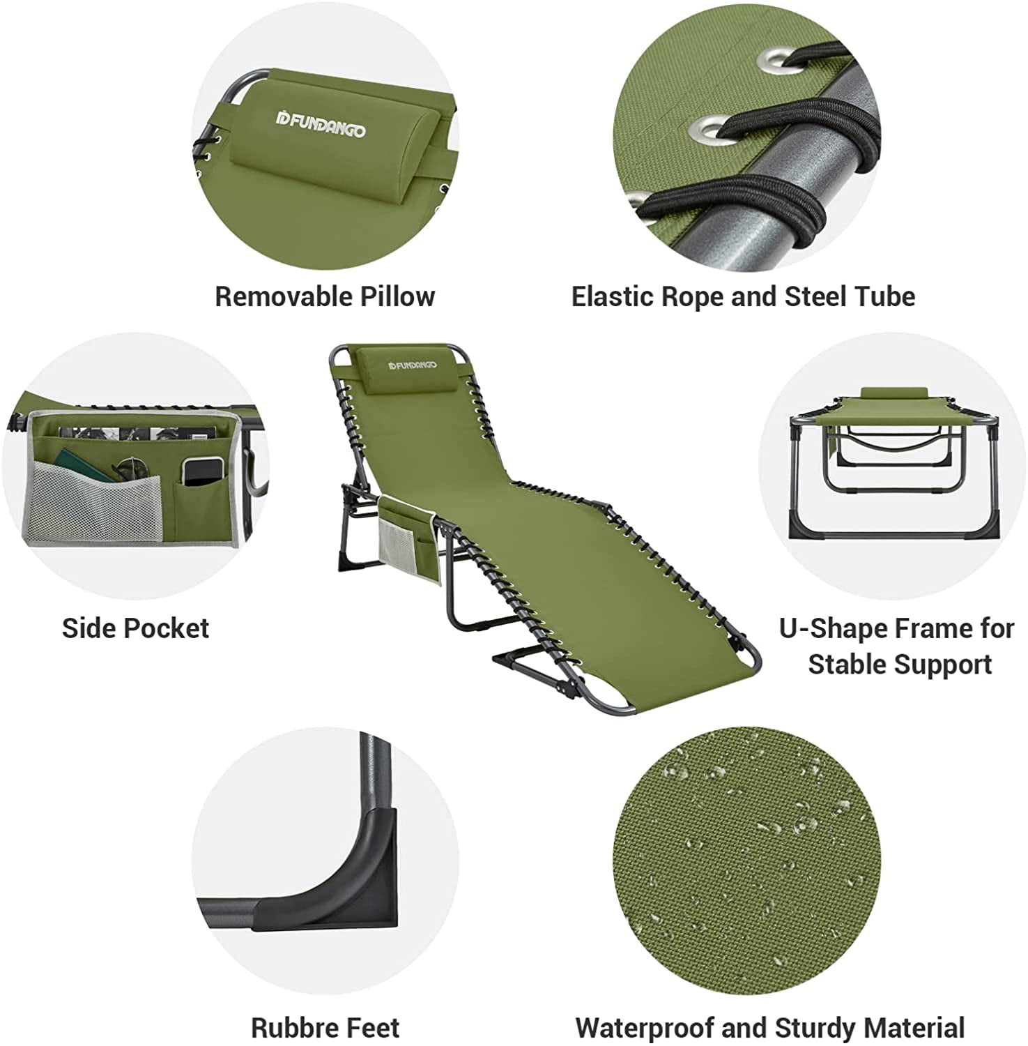 FUNDANGO Camping Chairs Outdoor Folding Chaise Lounge Chair Adjustable Reclining Chair with Pillow, Supports 265lbs, Green
