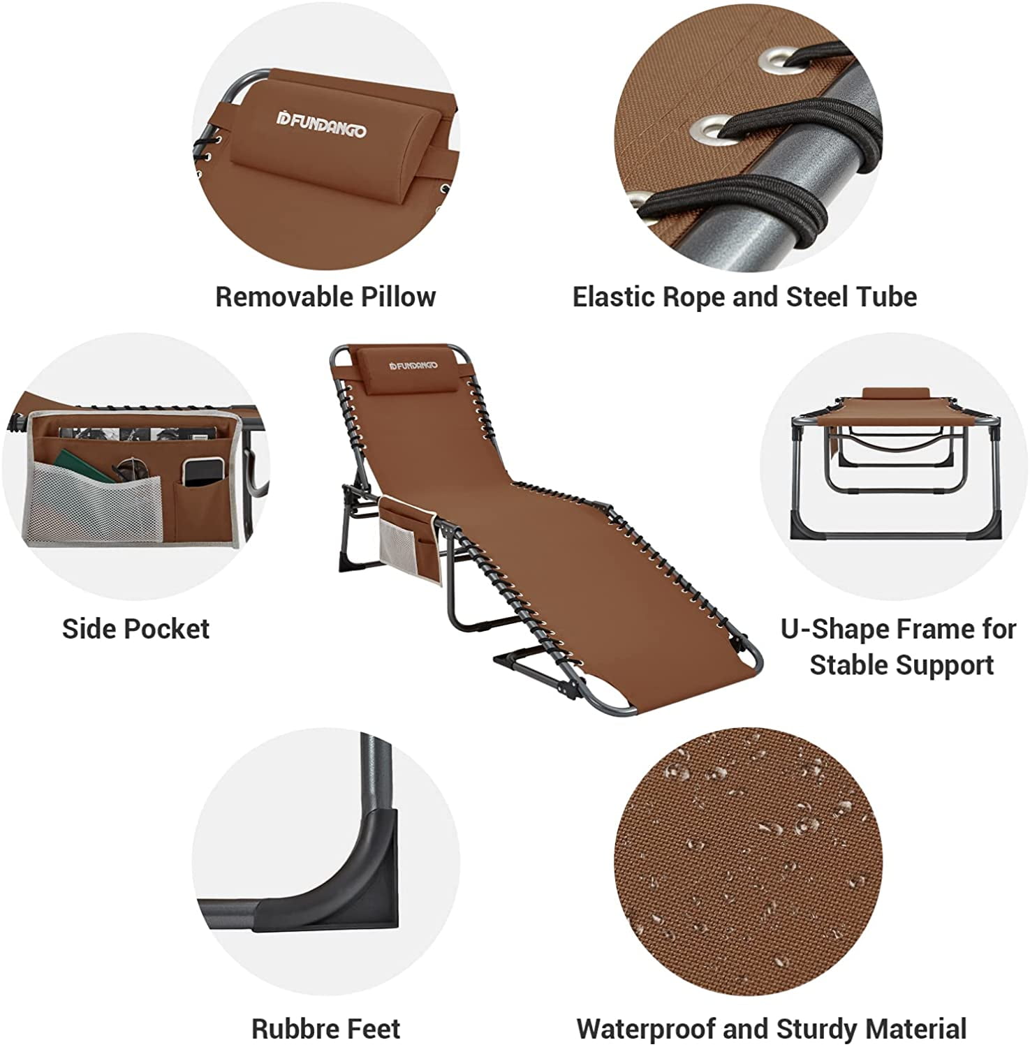 FUNDANGO Outdoor Folding Chaise Lounge Camping Chair, Adjustable Reclining Design with Pillow, High Weight Capacity (265lbs), Perfect for Beach & Pool, Khaki