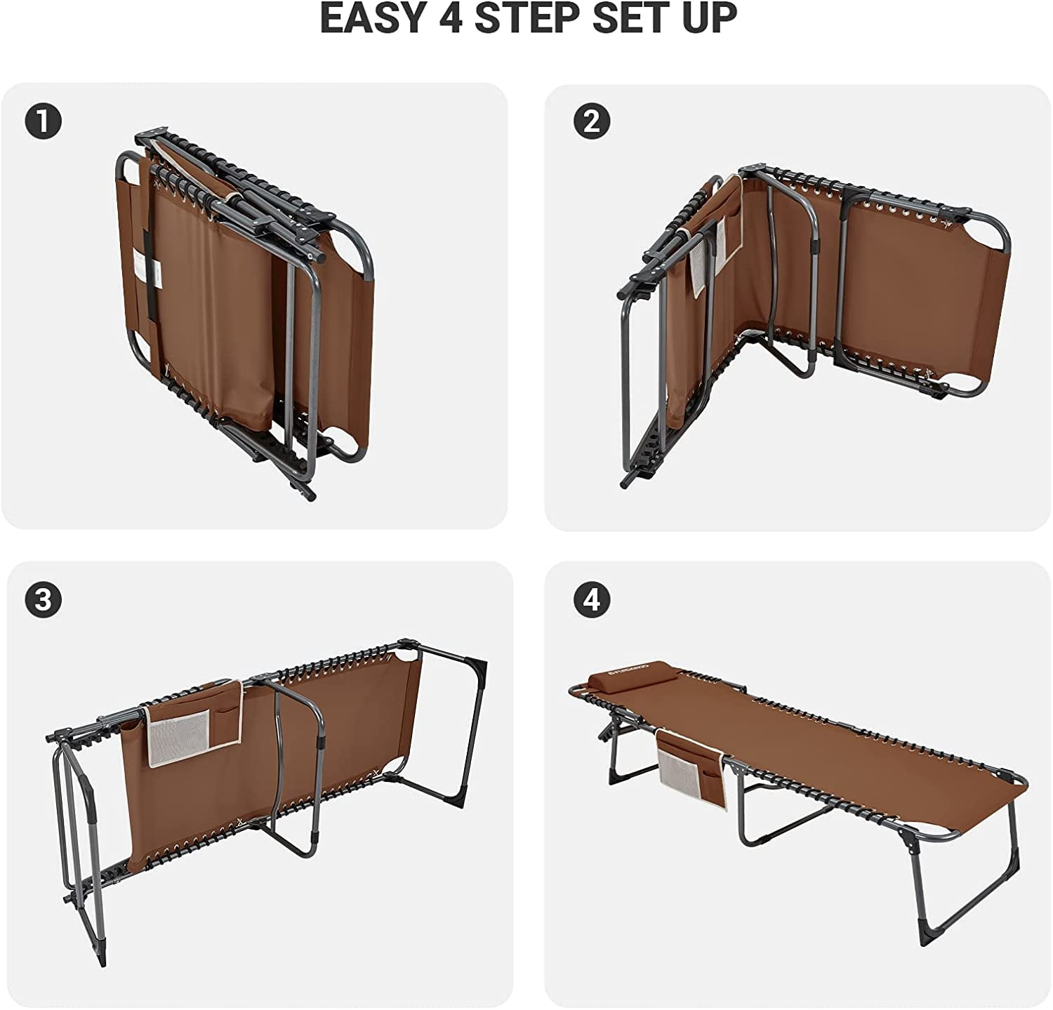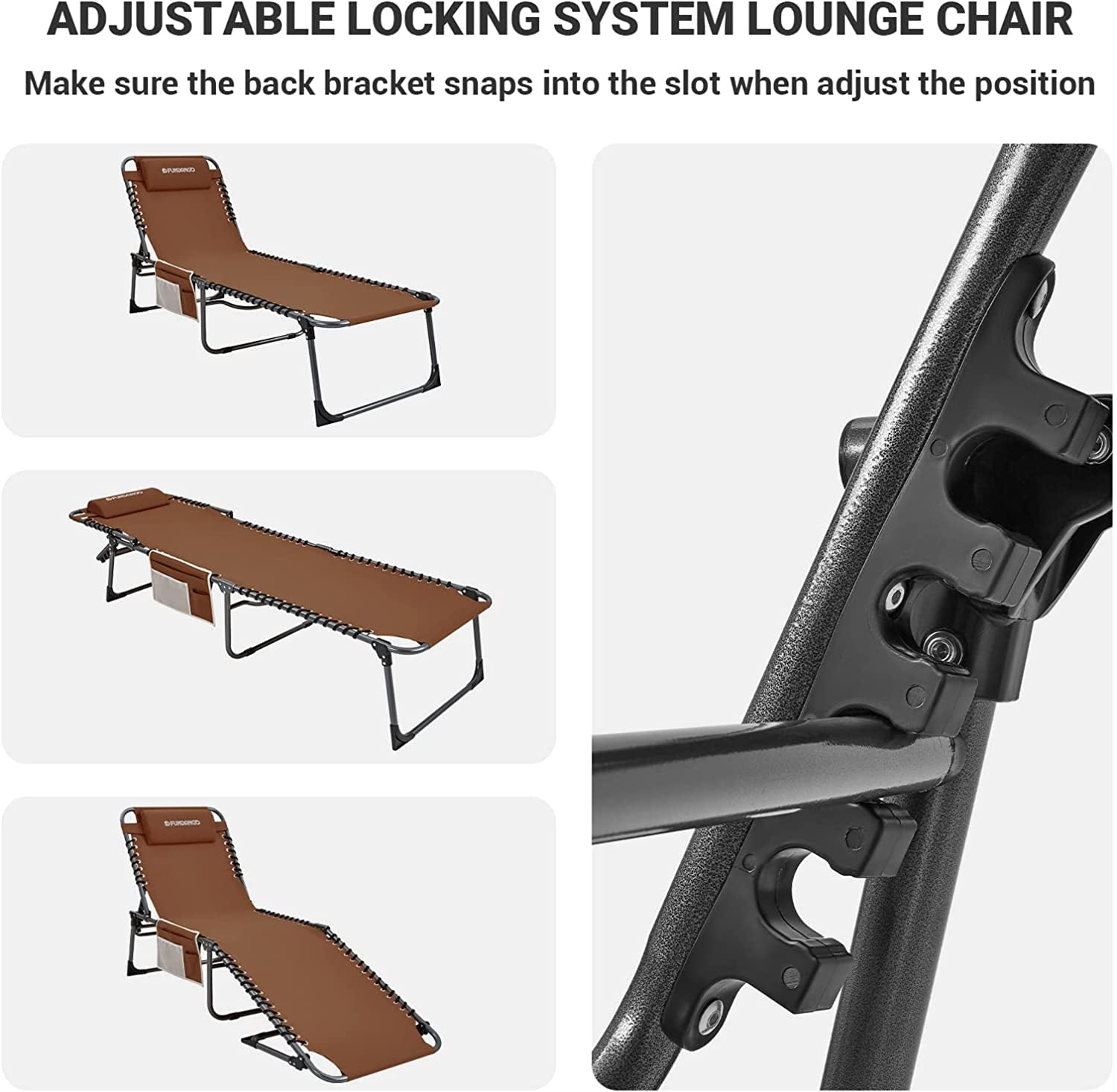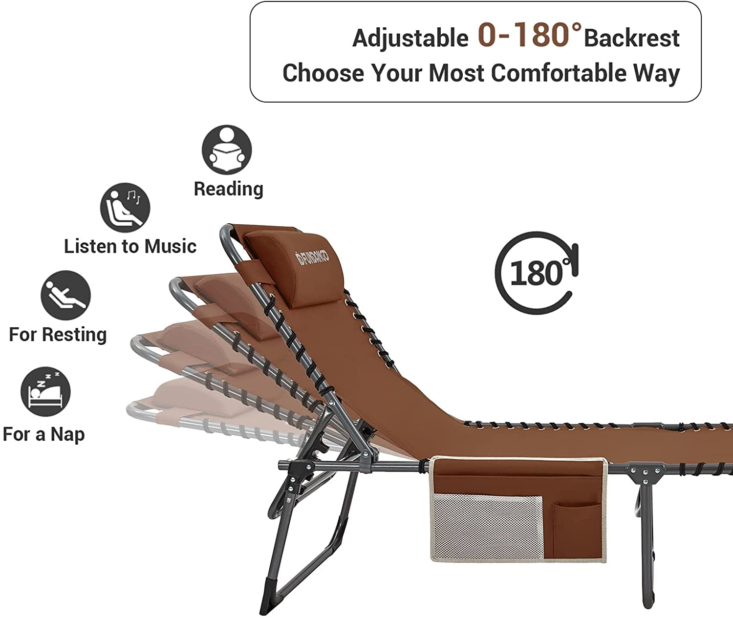 【4-Fold Lounge Chair】The chaise lounge with triangle locking system, which allows you to lock the chair in different positions, you can sit up, recline or lay flat. Ergonomic design to reduce your muscle tension and stress,perfect balance between firmness and softness. Lays completely flat as a camping cot. 【Sturdy and Comfy】The dimension of the Reclining chair is 74.8×23.2×13.3/14.5in, fits people up to 6.2 feet. Packed size: 29.9×23.2×5.9 inches, weight 14.1lbs. Constructed of anodized steel and durable,breathable 600D oxford fabric suspended by double bungee system, footrest cover and foot pads helps from sinking into mud or loose ground. Heavy duty steel tubes that can support a weight of up to 270lbs 【Multipurpose Folding Lounge Chair】The lounger is ideal for outdoor and indoor using. You can take it to the the beach, patio, pool, lawn, garden, deck, office Nap, bedroom, balcony, or as a temporary bed for your guest. Relax yourself in backyard, enjoying the sunbathing or listening to the waves at beach. 【Quick Open & Fold】No tools needed! Just fold everything out, and you’re done. Only spend your few seconds. **Please check that the back bracket snaps into the slot when adjust the position. 【Removable Pillow & Storage Bag】The padded wide pillow is adjustable and completely removable allowing it to serve as a headrest, lumbar support or for other support purposes. 3-IN-6 storage pocket for storing your cell Phone, keys, water bottle, toys, earplugs & More. Easy for washing and providing a more comfortable experience. 【CUSTOMER GUARANTEE】This chair comes with 12-monthes warranty, and a 100% satisfaction guarantee. If you have any questions, please contact us directly.