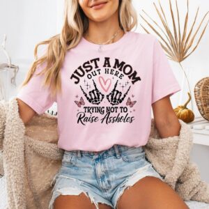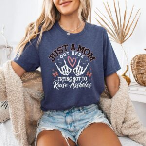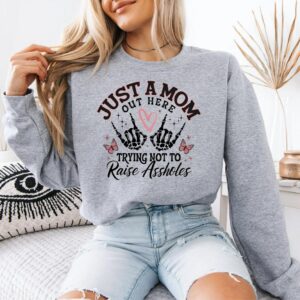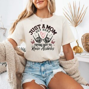 Funny Mom Tee, Just A Mom Out Here Shirt, Trying Not To Raise Assholes Tee, Mothers Day T-shirt, Mother Sweater, Mom Life Shirt, Mom Tee