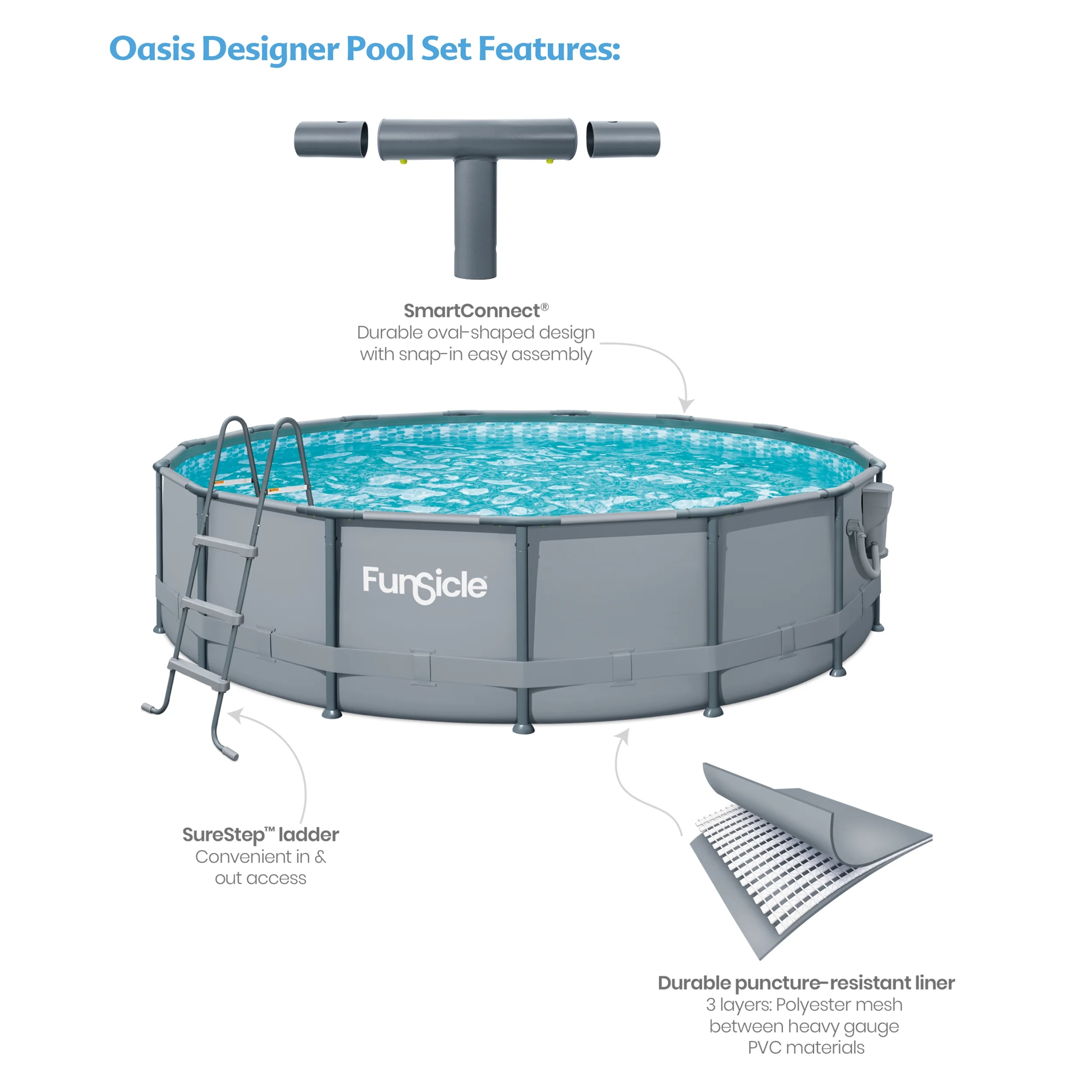Funsicle 15ft Oasis Round Above Ground Metal Frame Swimming Pool, Includes SkimmerPlus Pump, Age 6 & up Ultra-strong oval metal frame tubes offering better support than traditional round tubes SmartConnect Pro Frame: More durable and easier setup with the T-Cup Connector Durable & puncture-resistant 3-ply Toughmesh materials SFX1000 SkimmerPlus™ Filter Pump (with GFCI) conveniently attaches to sidewall to prevent tripping Includes SureStep Ladder for easy access to pool Includes Type C filter cartridge & repair patch Ideal for 7 to 8 people Approximate size: 15′ x 42″ (4.57m x 1.07m) Pool Type: Above Ground Pool Shape: Round Age: 6+
